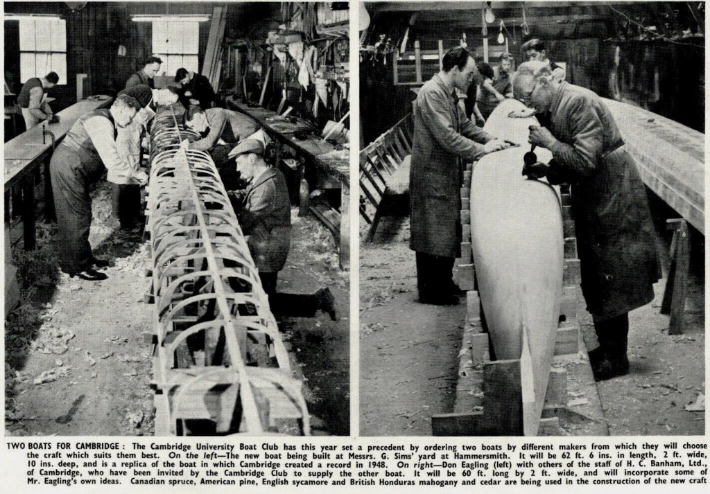 Presumably, the methods of constructing a wooden eight have not changed very much over the years, though there are probably more power tools used and fewer neckties worn. Prices may also be different as in 1939 Oxford paid Sims £120 for its new boat.