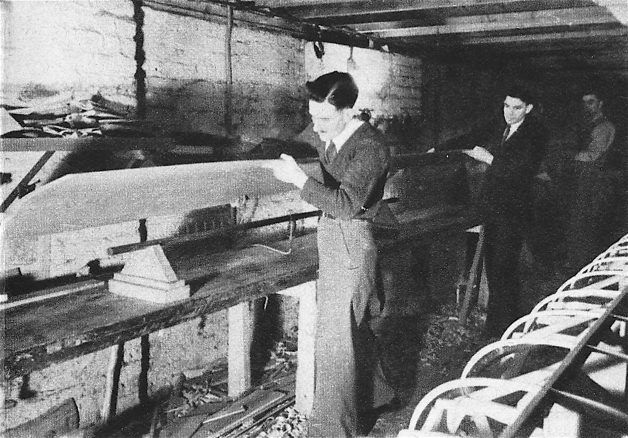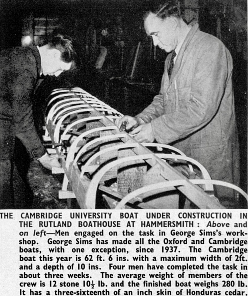 The recent news that the “one-off” building of the first wooden eight to be made in Britain in perhaps over forty years is underway is a good reason to revisit a picture magazine article of 1939. It showed that year’s Oxford boat under construction by boatbuilder George Sims, then based in the Rutland Boathouse sited behind the Rutland pub in Hammersmith, West London.