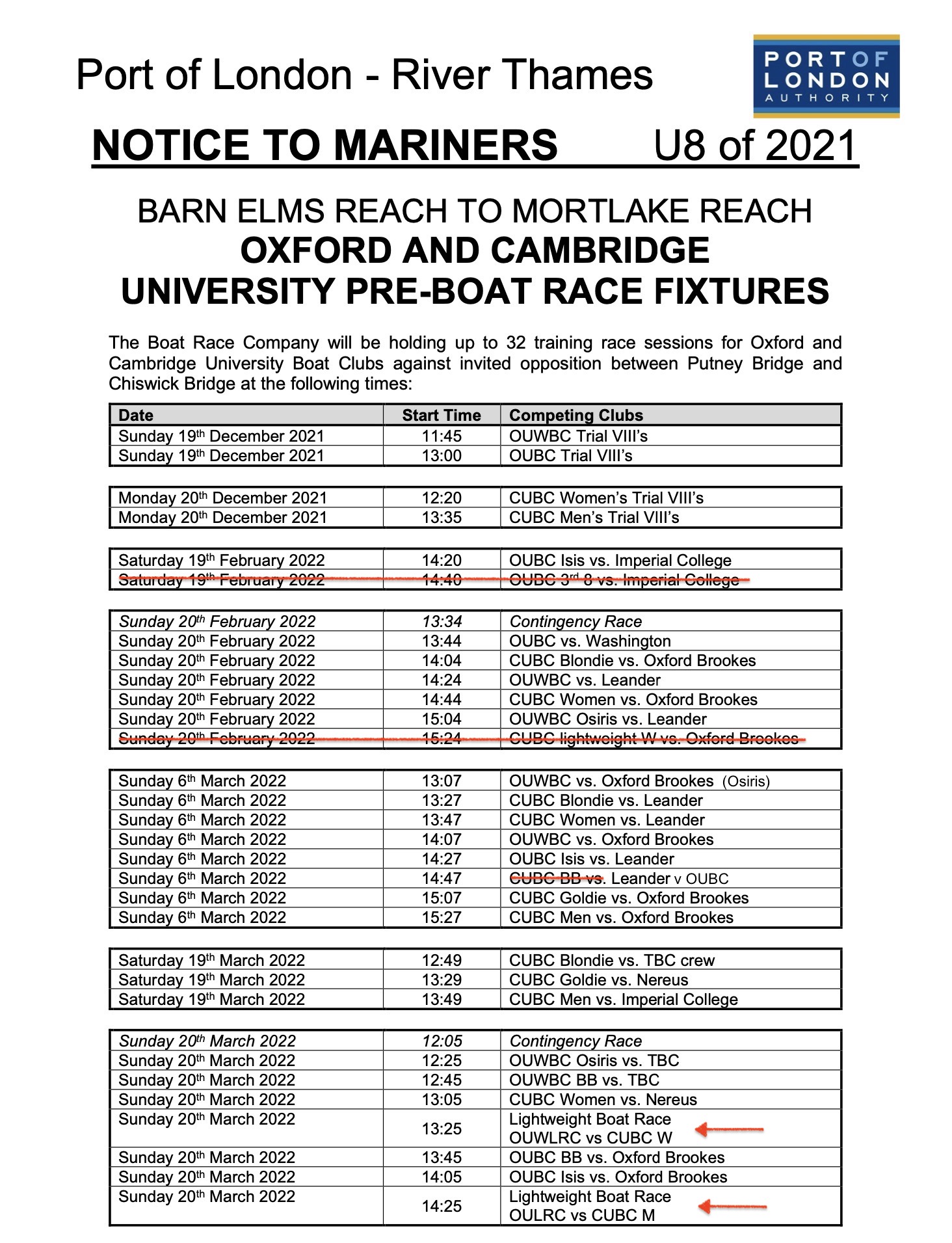 The 2022 series of fixtures has attracted some of the best teams in the world to race Oxford and Cambridge; Leander, Oxford Brookes, Imperial College and, from overseas, University of Washington, USA, and Nereus Rowing Club, Amsterdam.