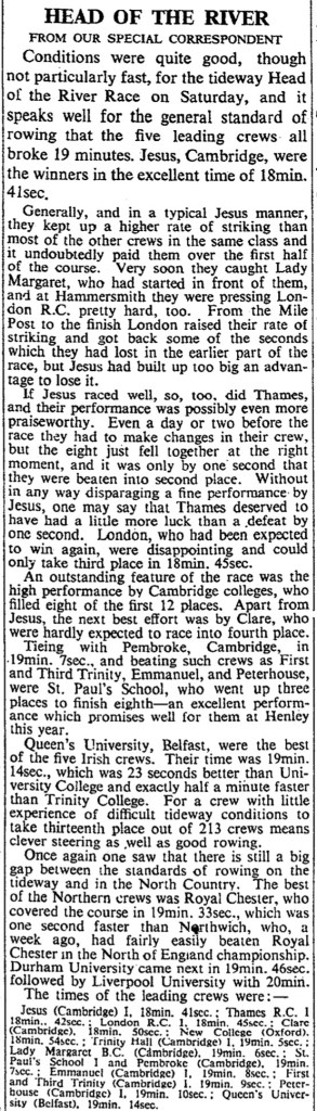 In 1951, the media still covered rowing well. The Times newspaper reported on the day in two separate pieces and at least two cinema newsreels also took an interest in who went “Head of the River”.