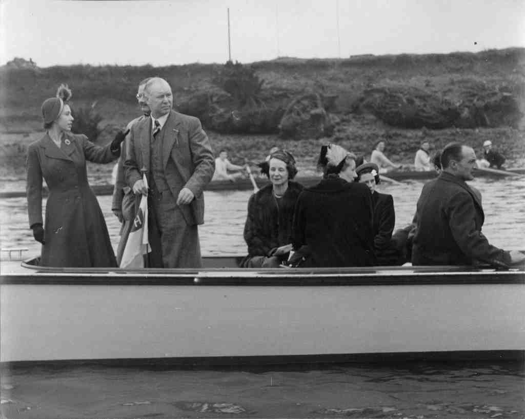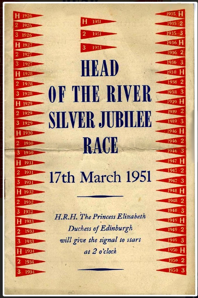 To mark the Platinum Jubilee in HTBS style, reproduced below are some charming pictures from one of the many thousands of events that Queen Elizabeth has attended in her lifetime, in this case her visit to the 1951 Silver Jubilee Head of the River Race, the Thames Tideway time trial for eights racing from Mortlake to Putney that was founded by Steve Fairbairn in the year of the Queen’s birth, 1926.