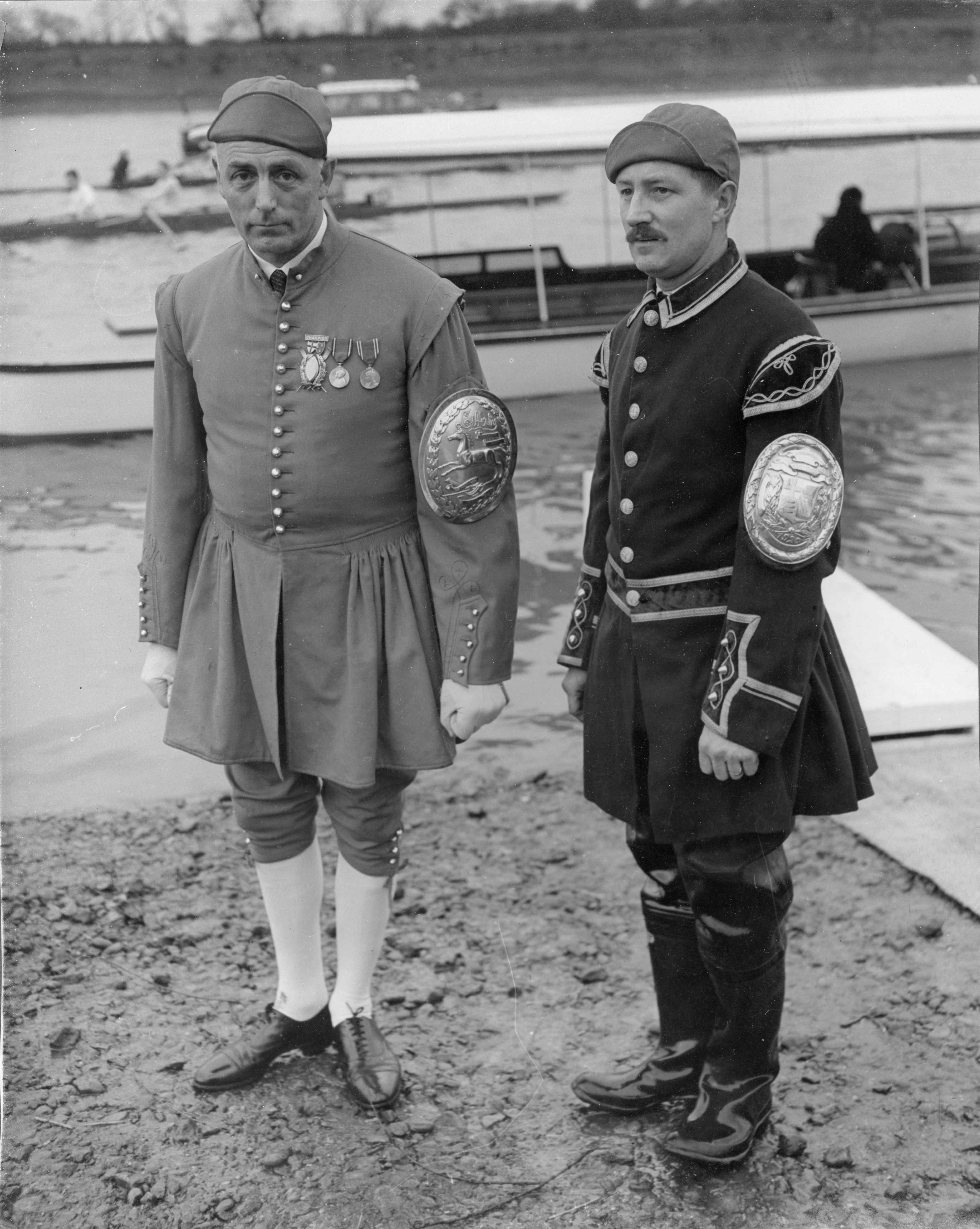 Can anyone identify the waterman who is pictured standing alongside Bert Barry and who is wearing the London RC Coat and Badge for 1920? A couple of years ago I and one of my colleagues tried and failed. The curious feature is that, according to London RC’s records, their Coat and Badge was last awarded in 1905. But the date of 1920 is very clear on the badge if you magnify the photo. Presumably he is someone who never won Doggett’s since otherwise he would have been wearing that uniform.