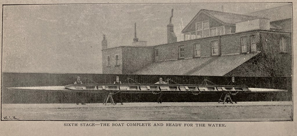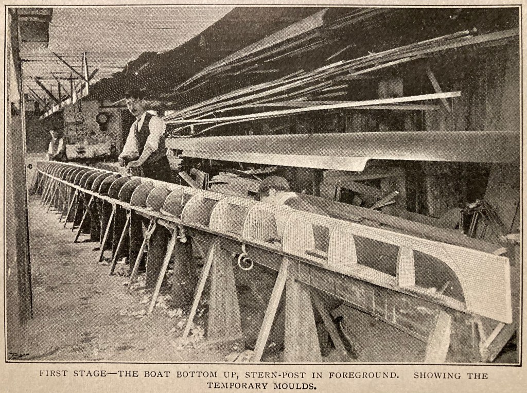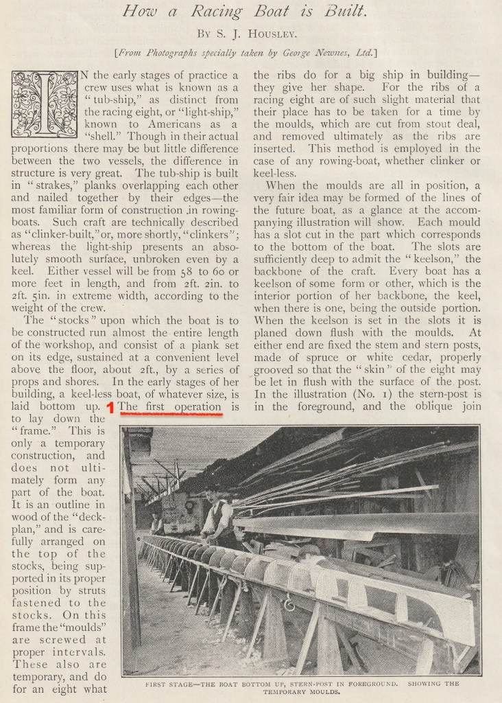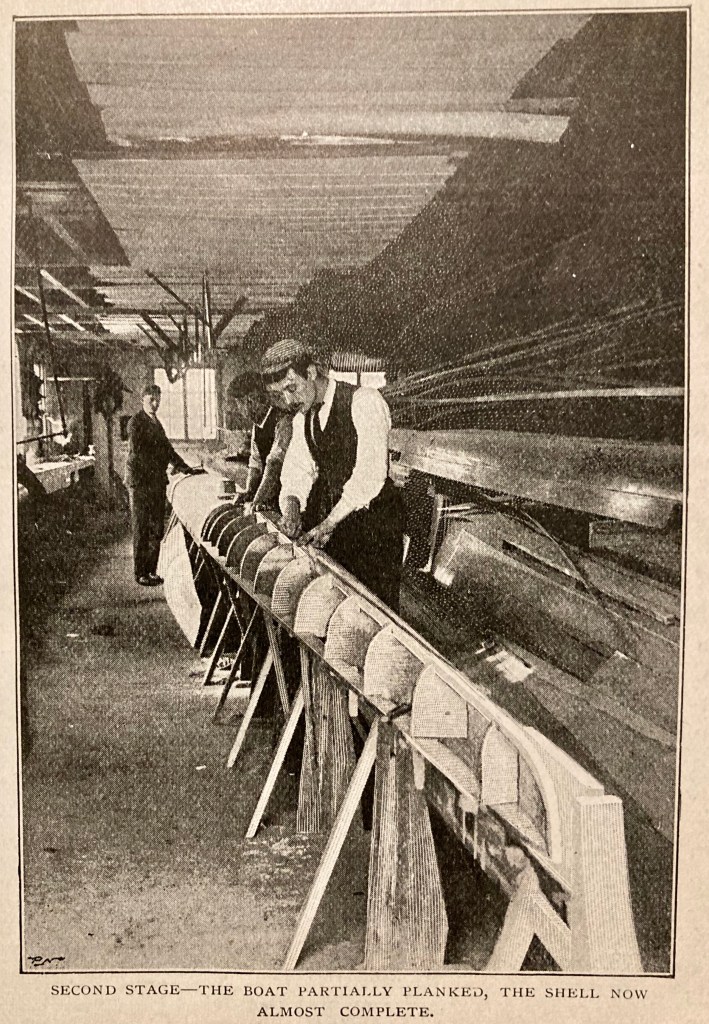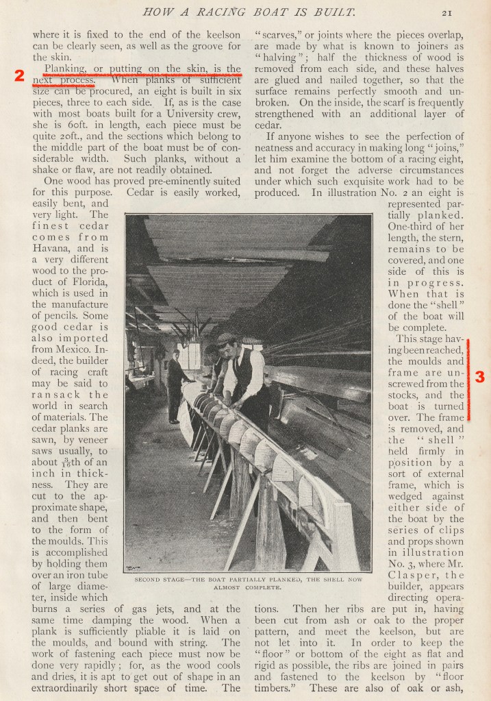 As the text in How a “Racing Boat is Built” may be too detailed or too technical for some interests, I have first reproduced the more accessible pictures and captions that the article says shows the six stages of building a wooden eight. If, after viewing these, the reader has not had their thirst for boatbuilding knowledge slaked, then they should move to the five pages of pictures, captions and text that make up the full article. To aid anyone wishing to skim read the latter, I have marked the start of each explanation of the six stages of production in red.