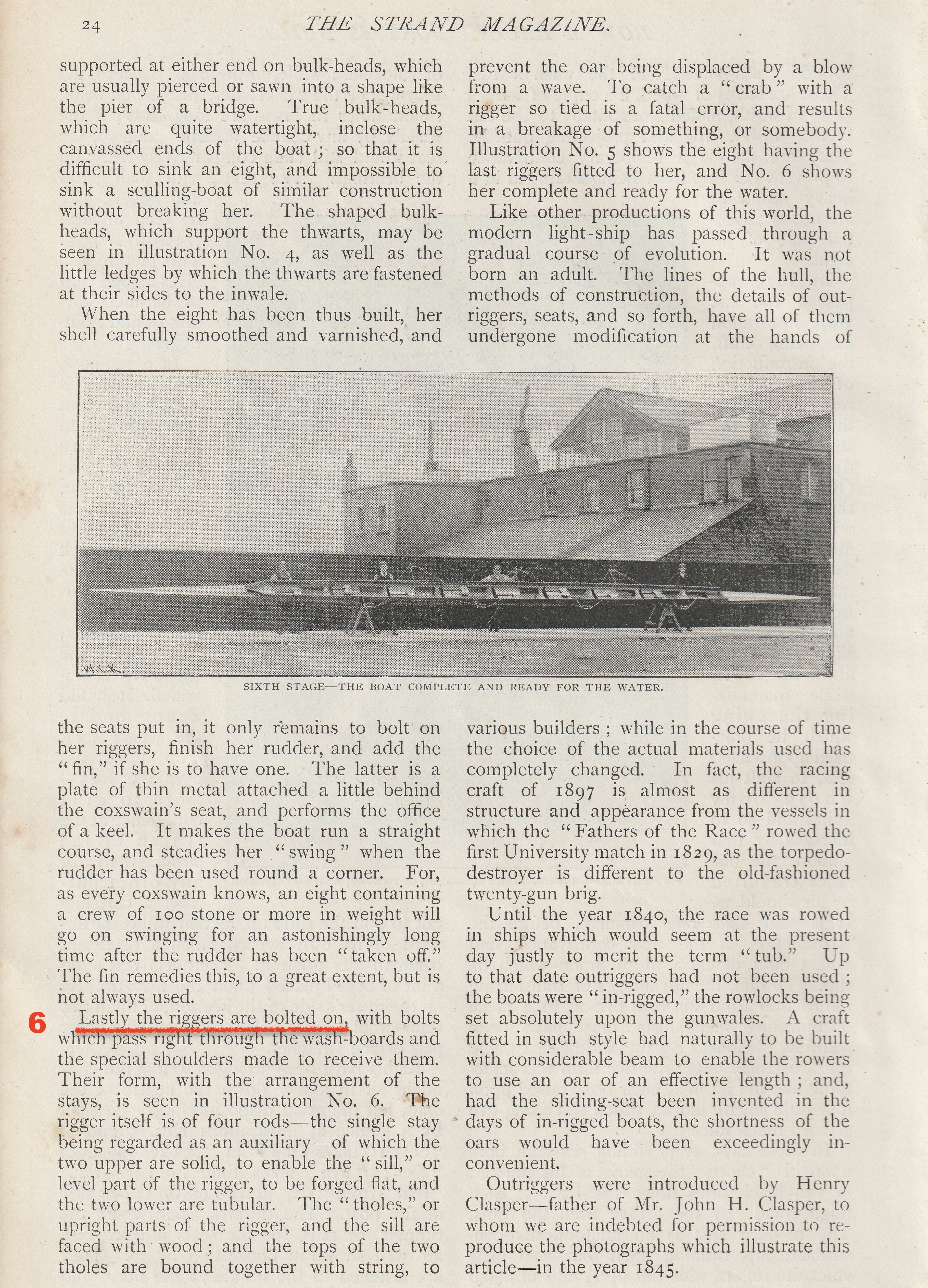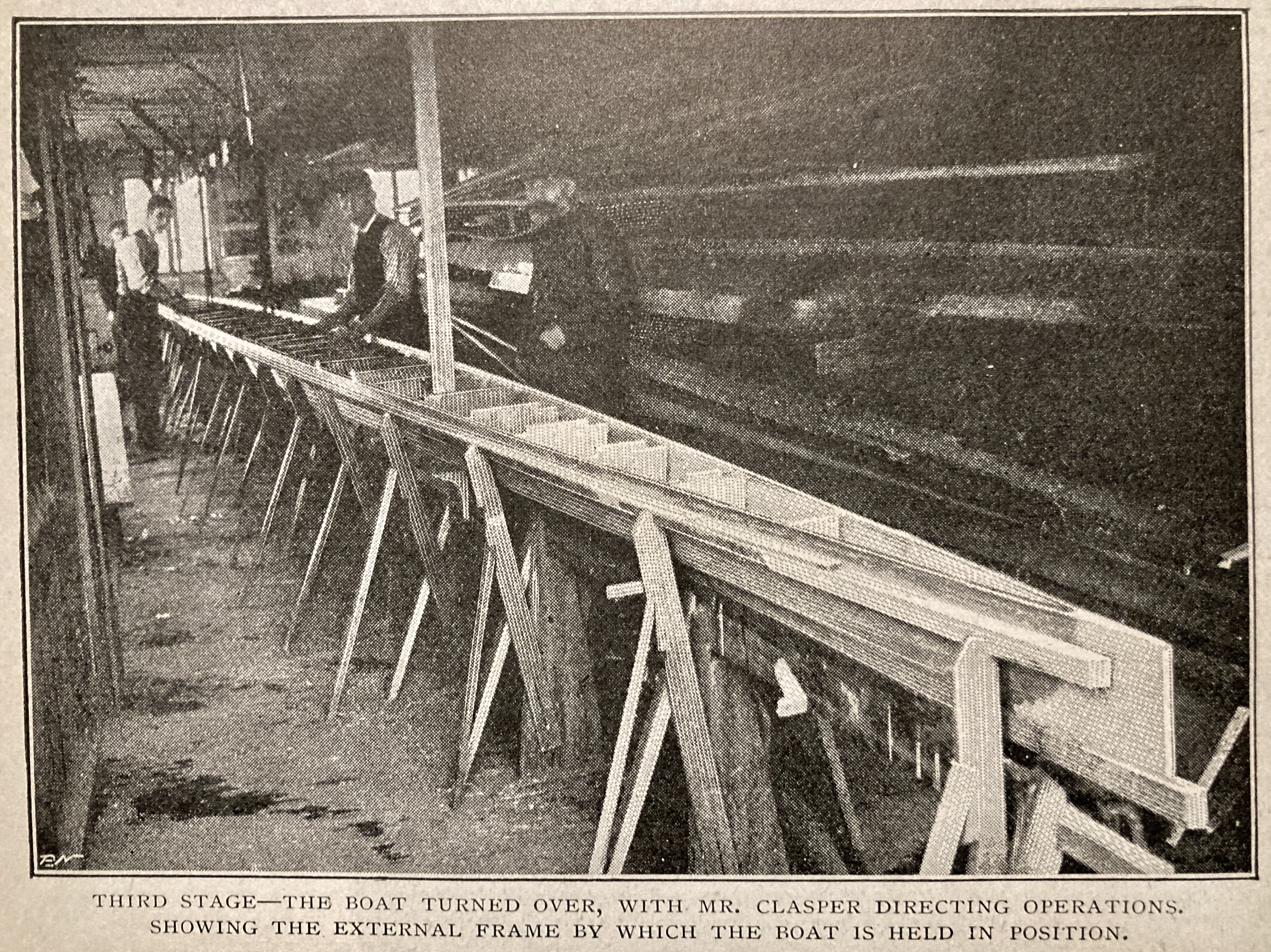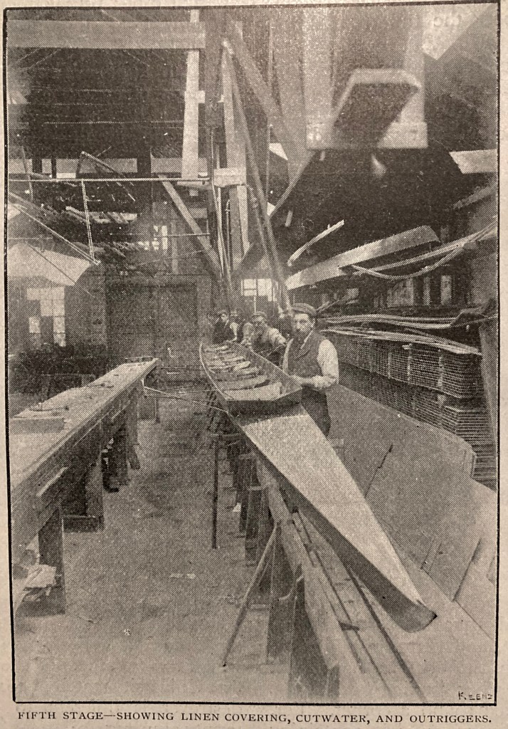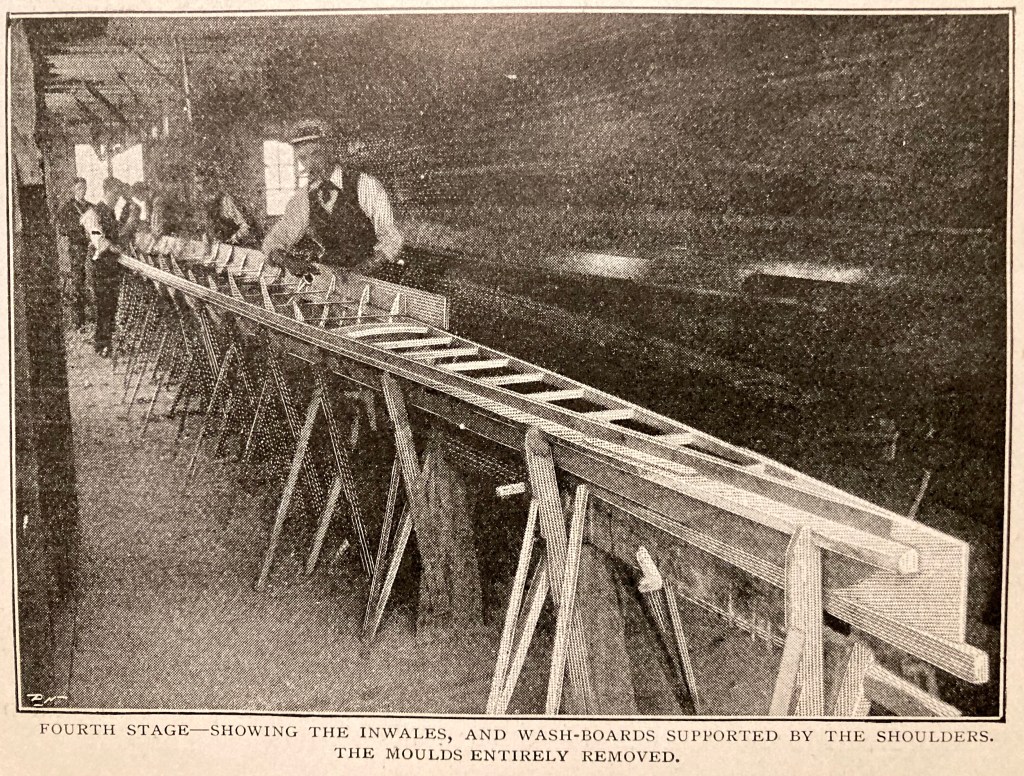 As the text in How a “Racing Boat is Built” may be too detailed or too technical for some interests, I have first reproduced the more accessible pictures and captions that the article says shows the six stages of building a wooden eight. If, after viewing these, the reader has not had their thirst for boatbuilding knowledge slaked, then they should move to the five pages of pictures, captions and text that make up the full article. To aid anyone wishing to skim read the latter, I have marked the start of each explanation of the six stages of production in red.