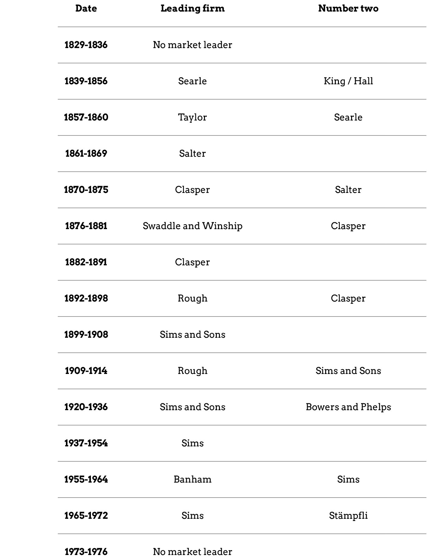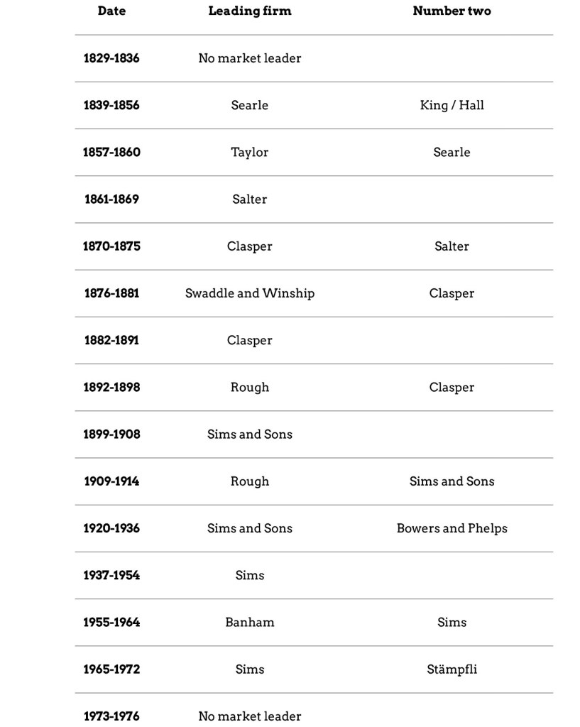 As an addendum, there is a very interesting study by Dr Simon Wenham titled The history of racing boat building available online. It includes a table based on the winners of the Oxford-Cambridge Boat Race showing the leading racing boat builders between 1829 and 1976, a period that Dr Wenham calls “the wooden era”. He notes, “Other firms occasionally won races, but the table shows the dominant constructors…”