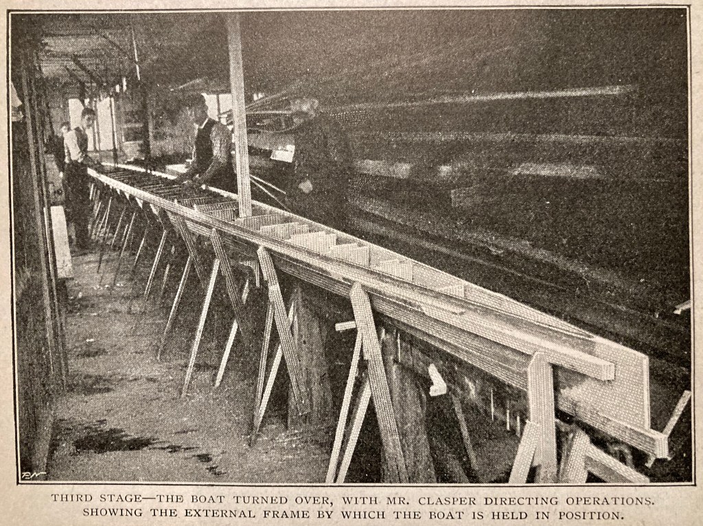 The boatbuilders visited by the 1897 article’s author, S. J. Housley, was that of JH Clasper in Putney, West London. John Hawks Clasper (1836 – 1908) is not as well-known as his father, Harry (1812 – 1870), but both were highly successful professional oarsmen and also important and innovative boatbuilders. More on John soon.