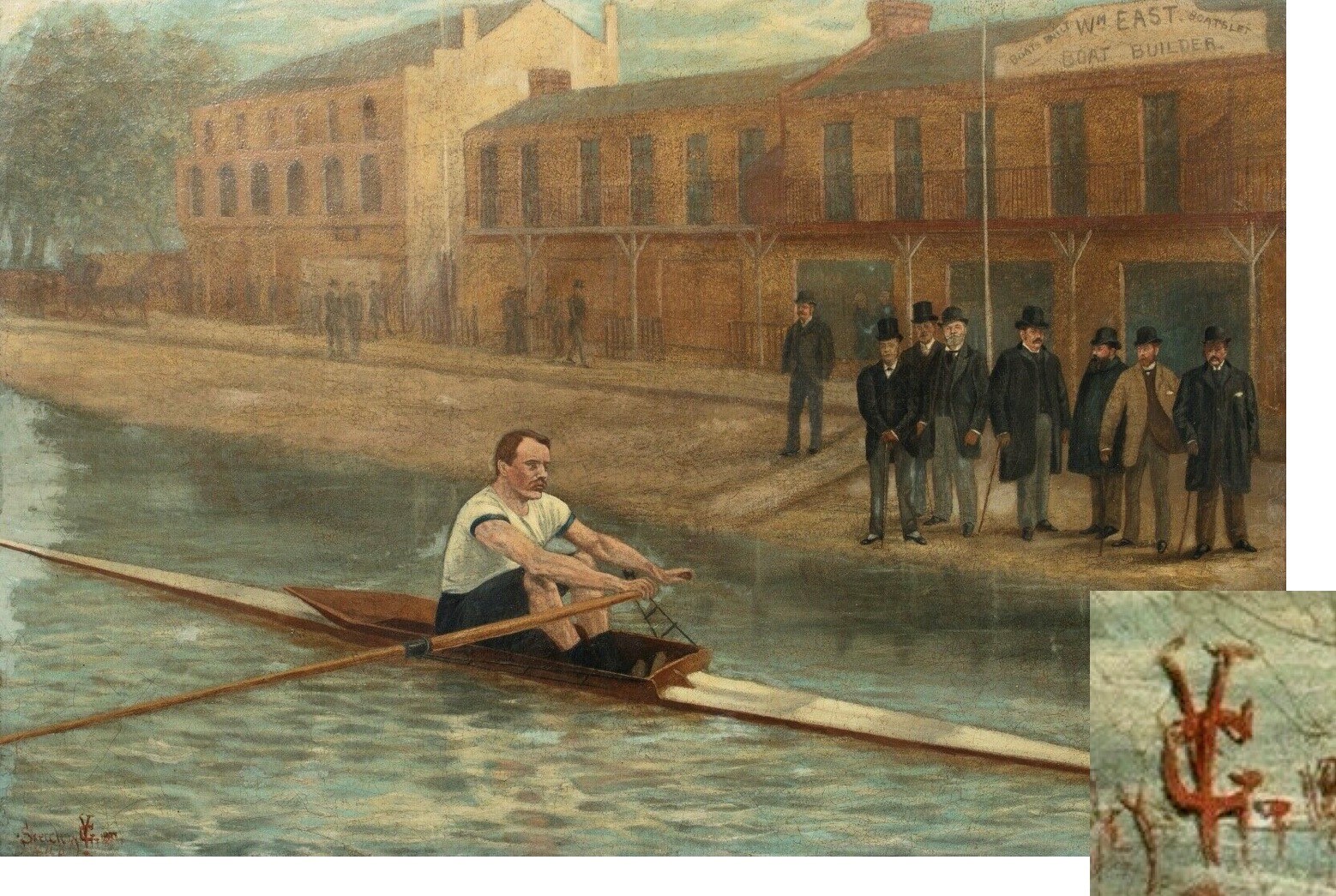 As to who and where the sculler was, the artist provided a very helpful clue in the top right-hand corner: a sign saying, “Wm East Boatbuilder”. East’s boathouse was close to London Rowing Club on Putney Embankment. The sign also provided a none-too-subtle clue to the identity of the sculler. I strongly suspect that it is William East’s son, William Giles East (1866 – 1932), a well-known and respected professional sculler and coach.