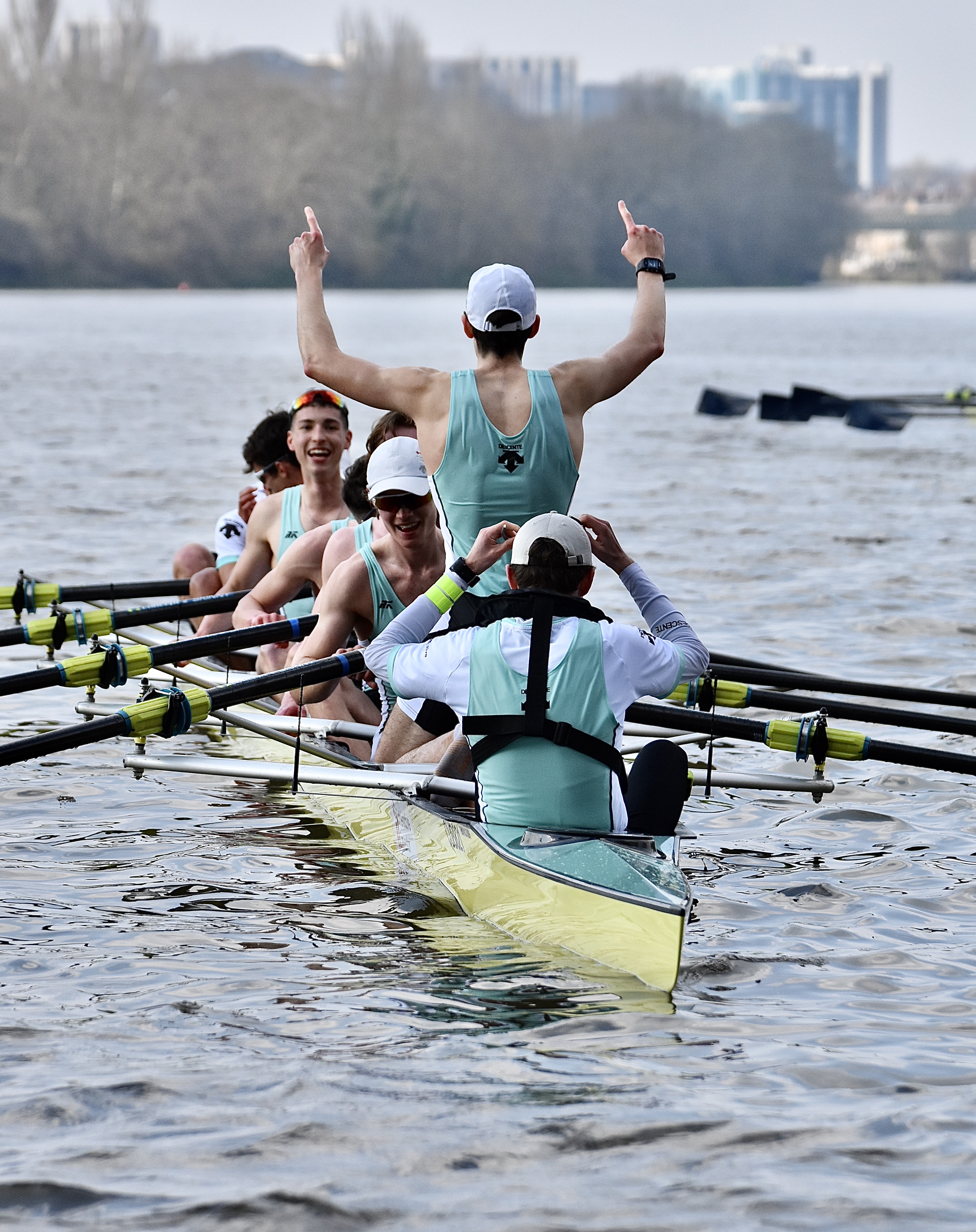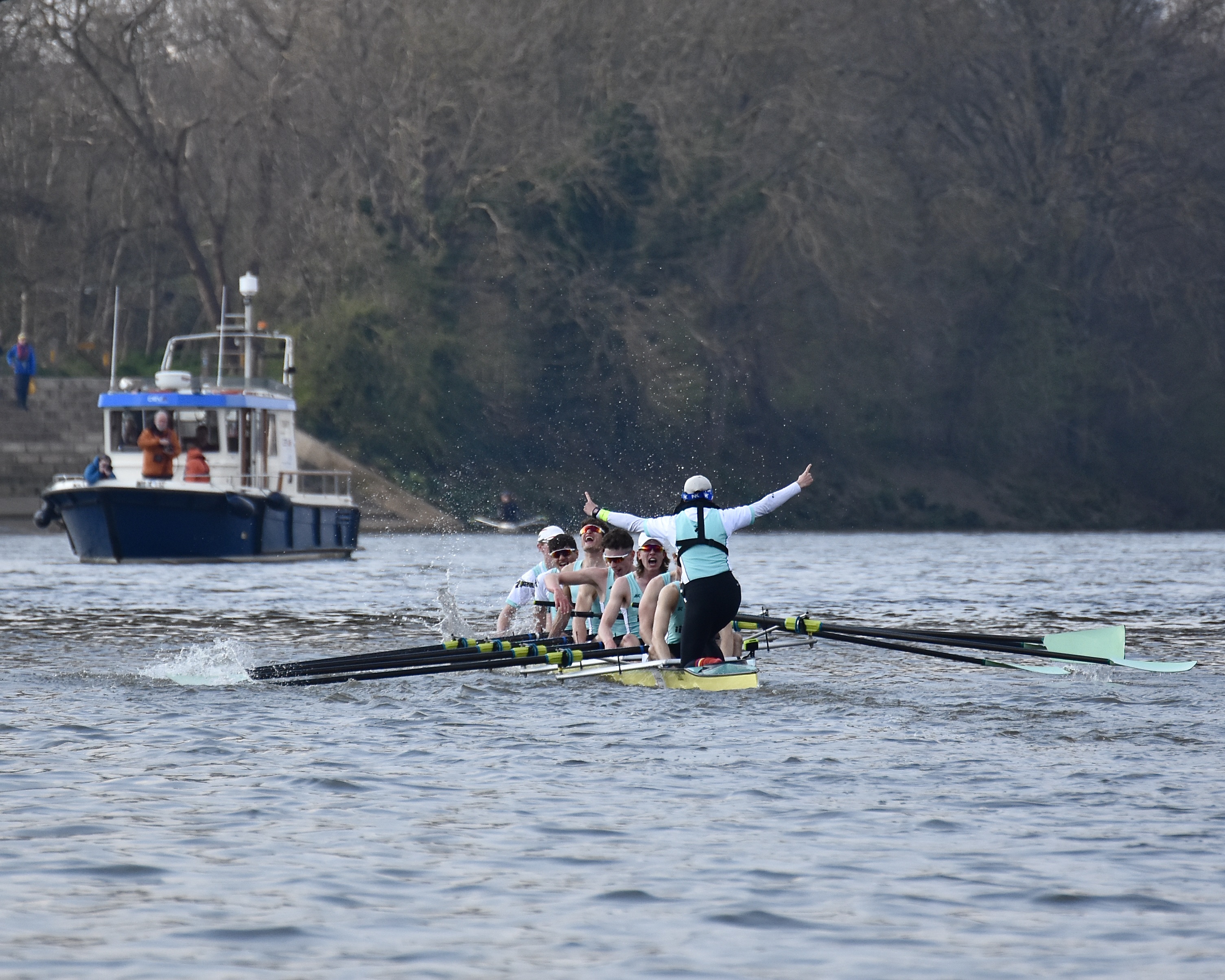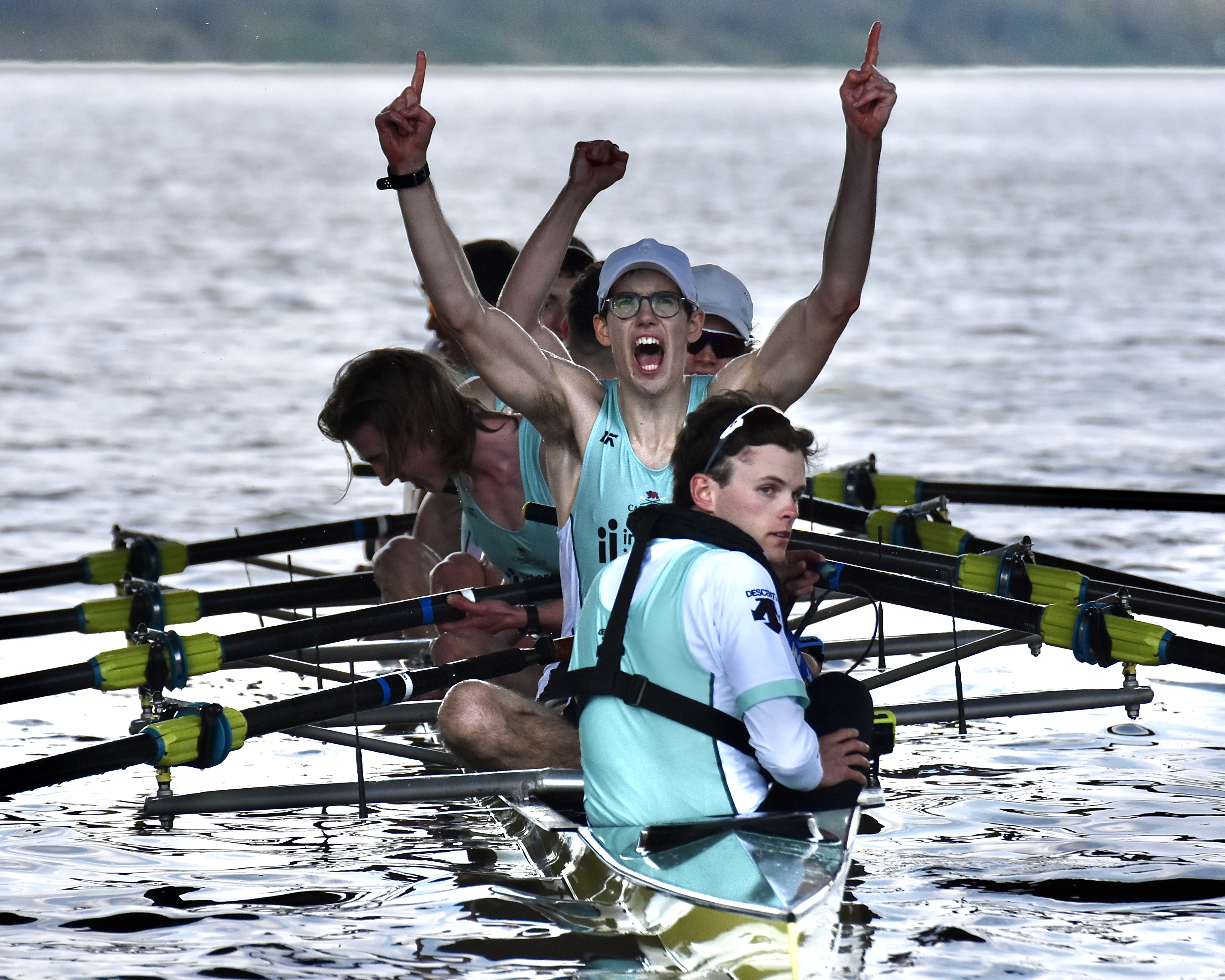 Matt Edge, stroke of the victorious Cambridge boat, demonstrates his pleasure at his crew winning the 2022 Oxford – Cambridge Lightweight Men’s Boat Race by 5 lengths. In last year’s race at Ely, he was in the same seat – but had a less joyous result, losing by 1 1/2 lengths.