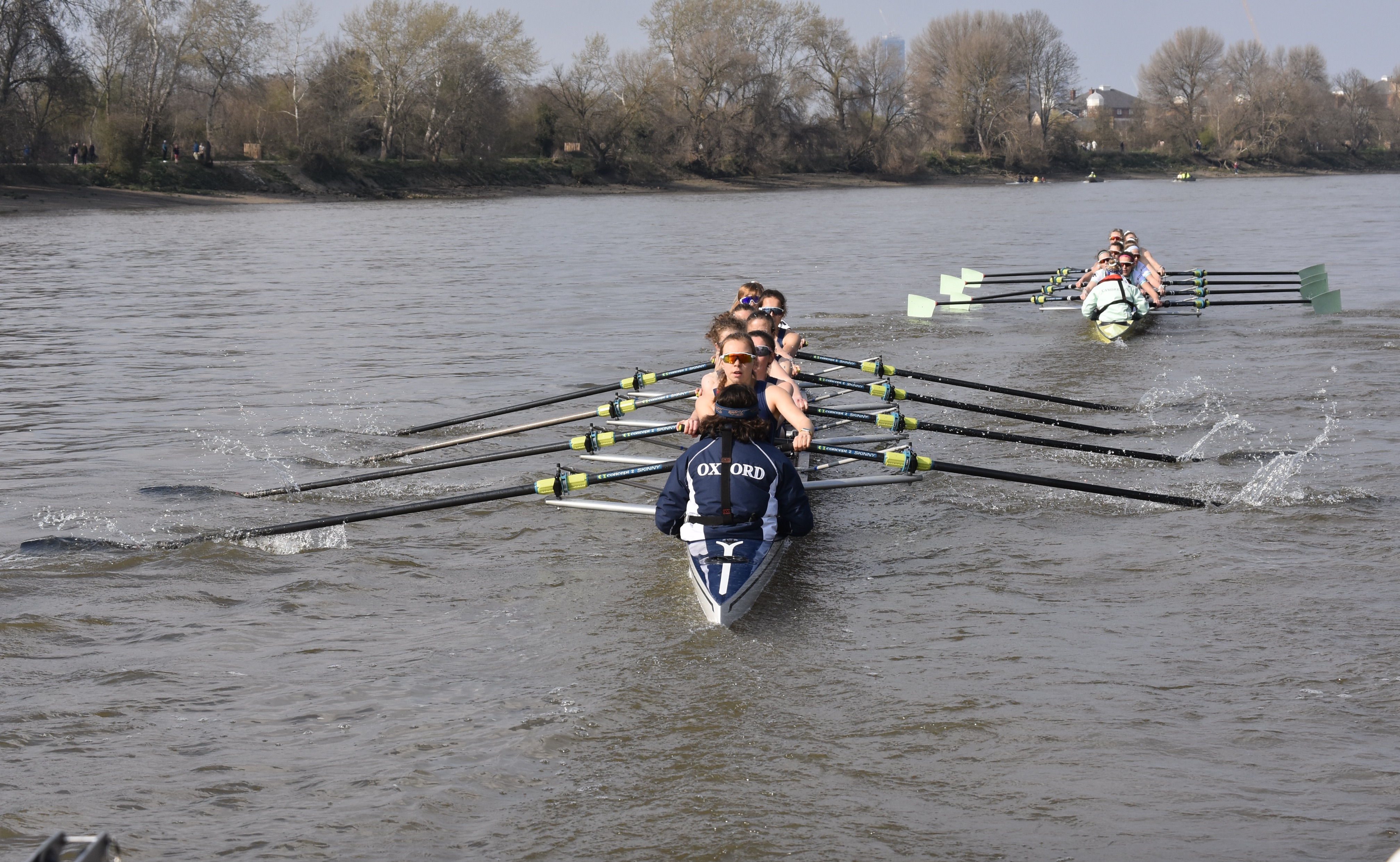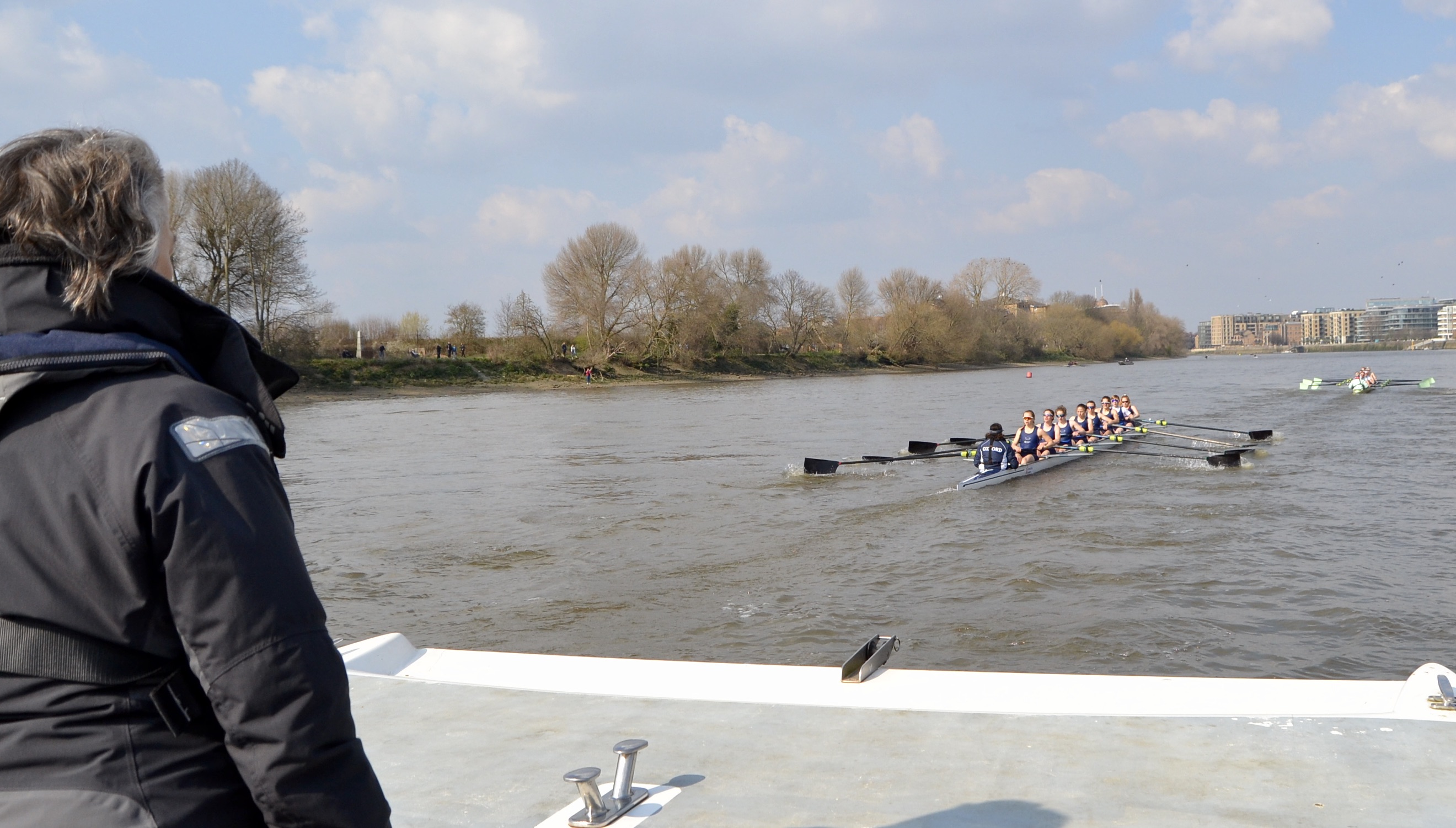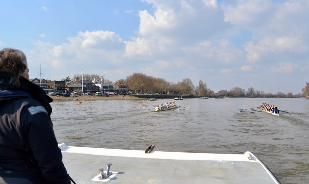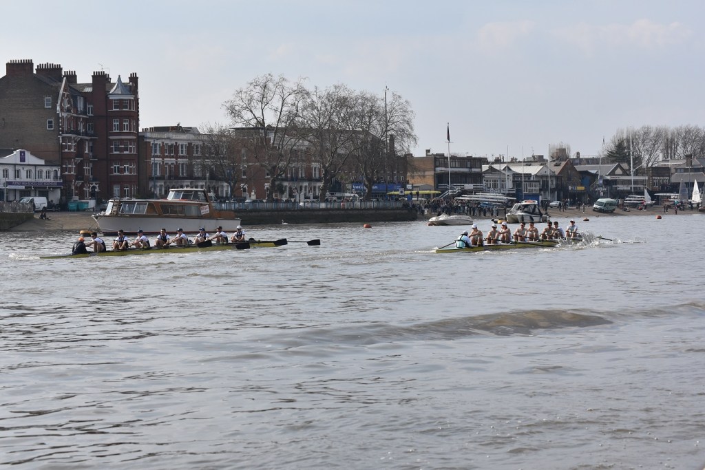 Umpire Judith Packer keeps a watch on the women’s crews racing along Putney Embankment, a few seconds off the start. It was a warm, calm day with a following breeze and a strong tide.Before the end of the Embankment, Cambridge were already looking confident.Oxford, also pictured near the end of Putney Embankment, but looking less settled than their opponents.After Barn Elms, two-and-a-half minutes into the race, Cambridge had clear water and cox Jodie Cameron decided on the bold move of switching stations.Twenty-seconds separated this picture and the one above. Umpire Packer warned Cambridge constantly during this move but there was no clash and the Light Blues got away with their risky manoeuvre.Oxford, voluntarily or not, accepted the change of stations, the gap between the two boats continued to increase and Judith Packer had little to do for the rest of the race.At Hammersmith Bridge, with 40 percent of the race gone Cambridge were 16 seconds ahead.Passing St Paul’s School.By the Old Ship pub, Cambridge take a look.The rates at Chiswick Eyot were Oxford 35, Cambridge 36. The Tabs were not content to just sit on their opponents, they seemed to want as much open water as possible.Eleven minutes in and, for those in second place, it was probably starting to sting a bit.At Chiswick Pier, Oxford stay sharp. At Chiswick Steps however, they were 28 seconds behind.The rates at Barnes Bridge were 32 for Oxford and 34 for Cambridge with a gap of 40 seconds.At “7”, Oxford’s Harriet Thomas looks as if she is giving the “110 percent” beloved of football players.Approaching the former Mortlake Brewery, now closed and no longer producing the distinctive brewing smell that signalled the finish for generations of rowers.Cambridge celebrate at the finish while Oxford still have more than 45 seconds of rowing left.