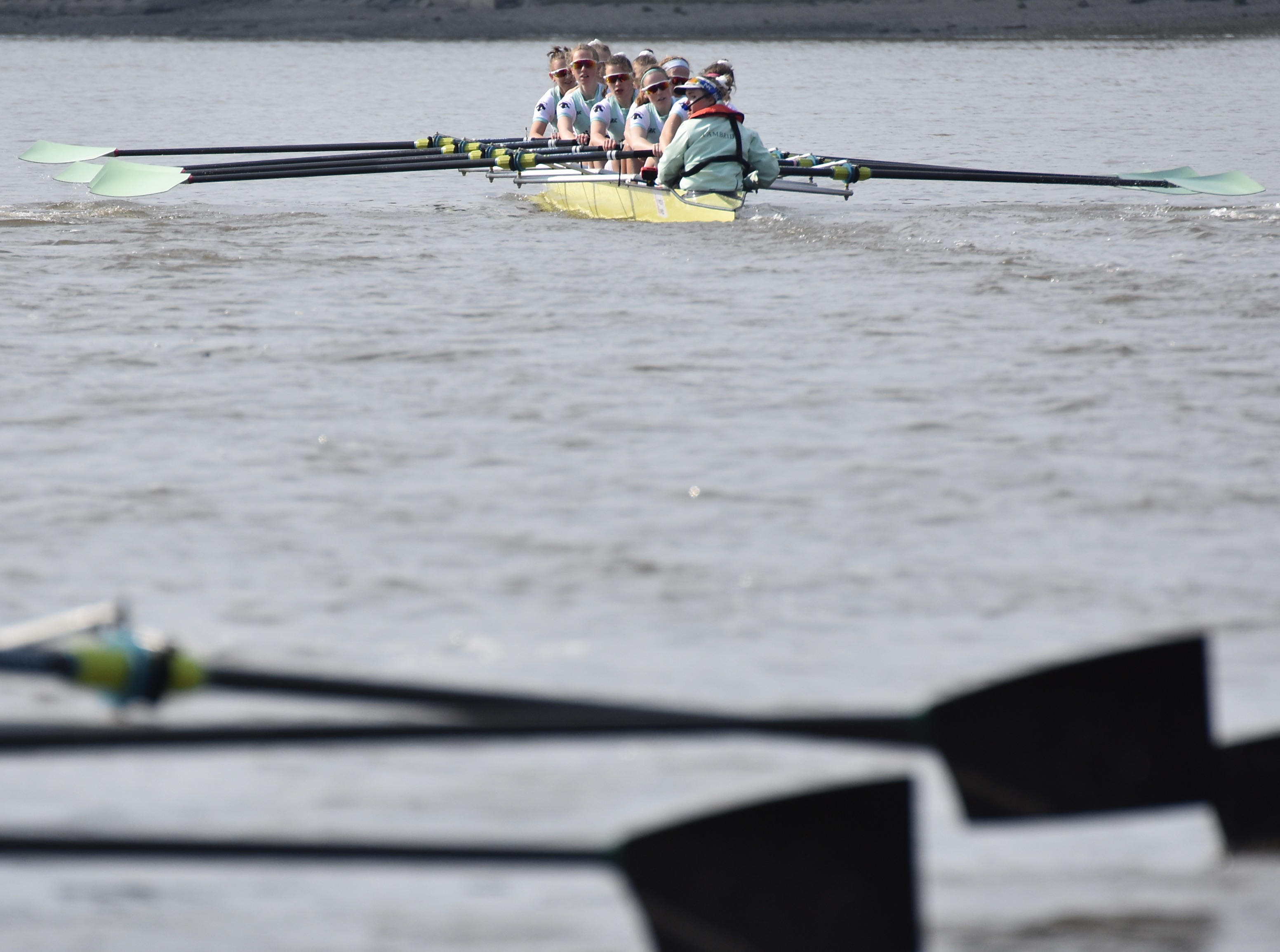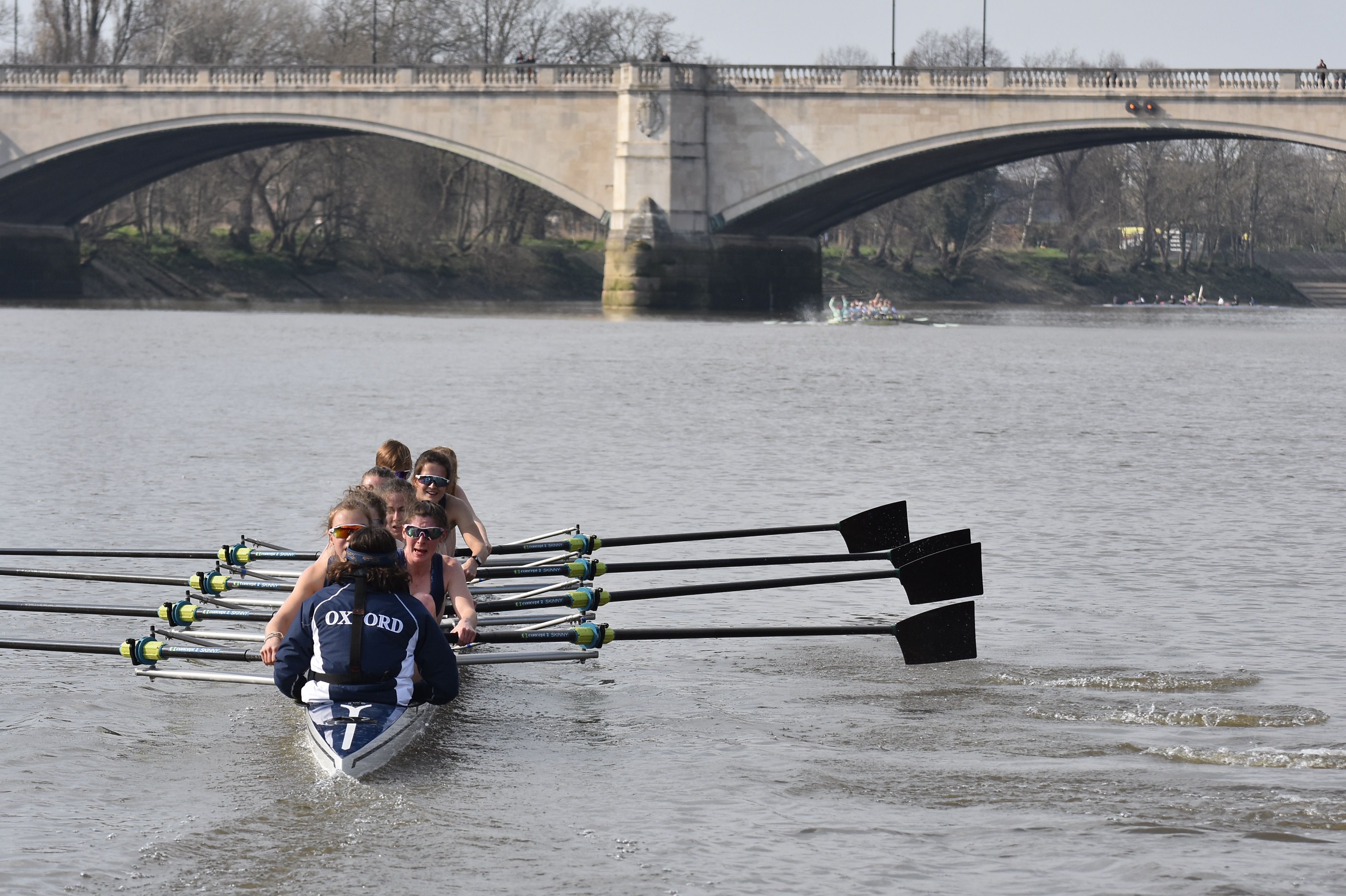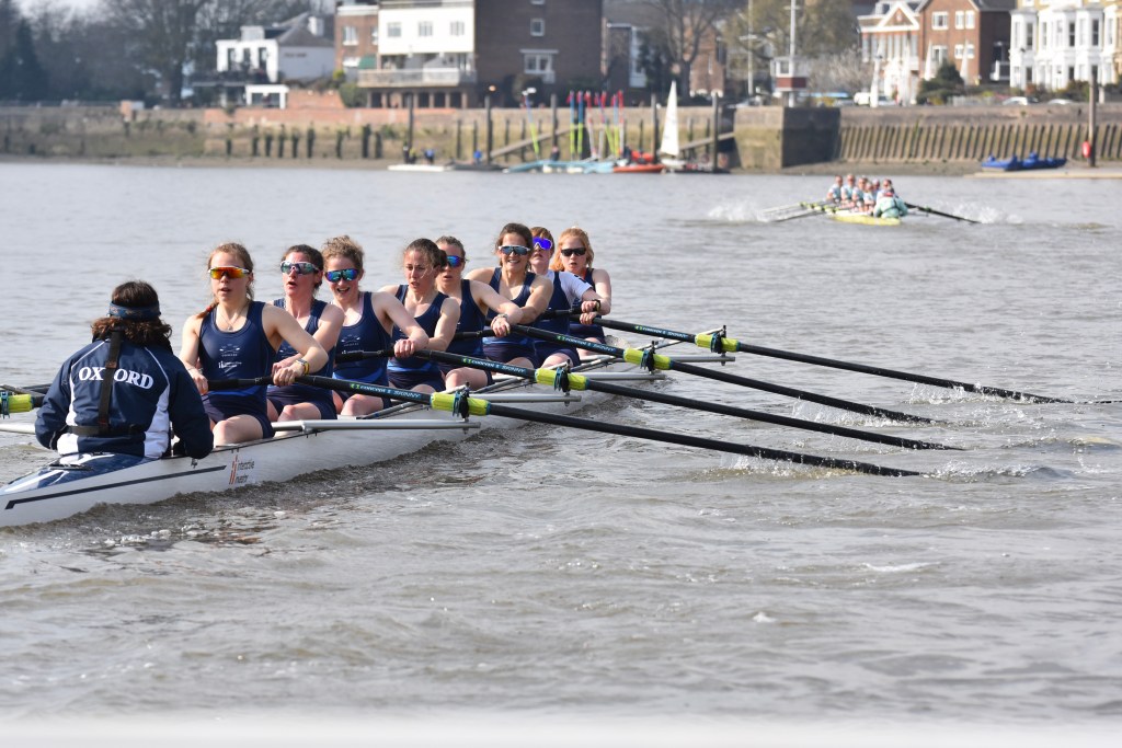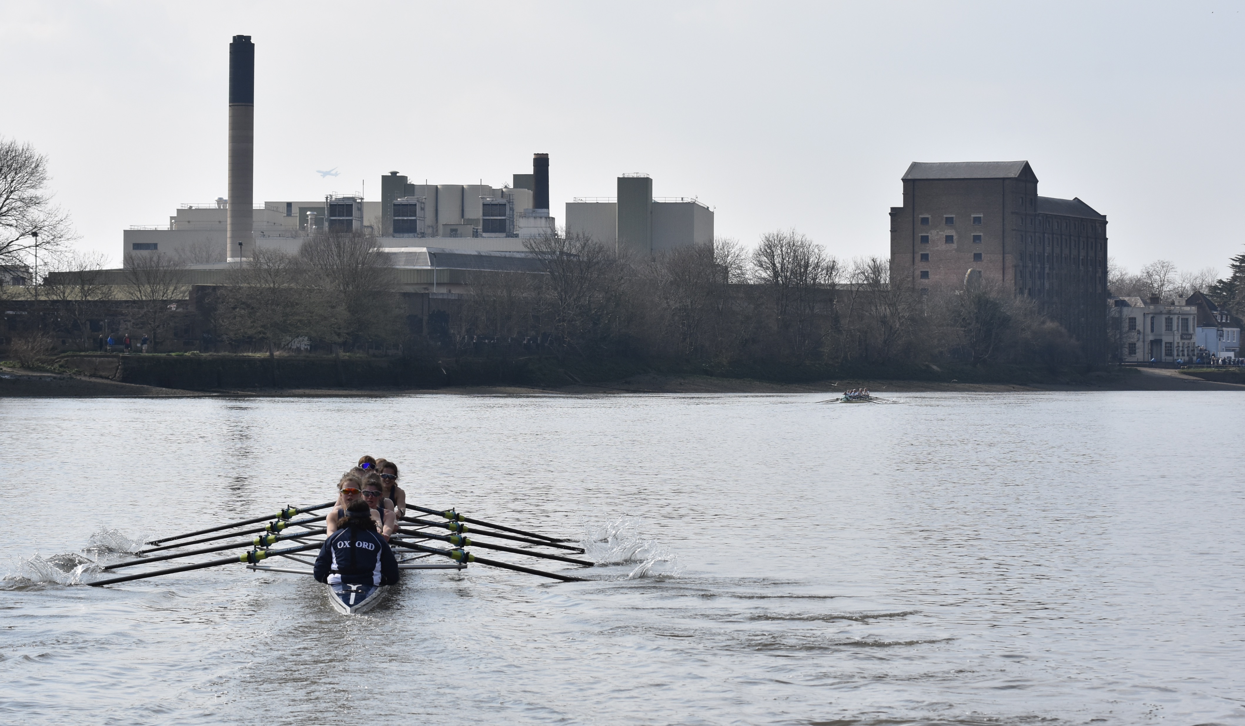 Umpire Judith Packer keeps a watch on the women’s crews racing along Putney Embankment, a few seconds off the start. It was a warm, calm day with a following breeze and a strong tide.Before the end of the Embankment, Cambridge were already looking confident.Oxford, also pictured near the end of Putney Embankment, but looking less settled than their opponents.After Barn Elms, two-and-a-half minutes into the race, Cambridge had clear water and cox Jodie Cameron decided on the bold move of switching stations.Twenty-seconds separated this picture and the one above. Umpire Packer warned Cambridge constantly during this move but there was no clash and the Light Blues got away with their risky manoeuvre.Oxford, voluntarily or not, accepted the change of stations, the gap between the two boats continued to increase and Judith Packer had little to do for the rest of the race.At Hammersmith Bridge, with 40 percent of the race gone Cambridge were 16 seconds ahead.Passing St Paul’s School.By the Old Ship pub, Cambridge take a look.The rates at Chiswick Eyot were Oxford 35, Cambridge 36. The Tabs were not content to just sit on their opponents, they seemed to want as much open water as possible.Eleven minutes in and, for those in second place, it was probably starting to sting a bit.At Chiswick Pier, Oxford stay sharp. At Chiswick Steps however, they were 28 seconds behind.The rates at Barnes Bridge were 32 for Oxford and 34 for Cambridge with a gap of 40 seconds.At “7”, Oxford’s Harriet Thomas looks as if she is giving the “110 percent” beloved of football players.Approaching the former Mortlake Brewery, now closed and no longer producing the distinctive brewing smell that signalled the finish for generations of rowers.Cambridge celebrate at the finish while Oxford still have more than 45 seconds of rowing left.