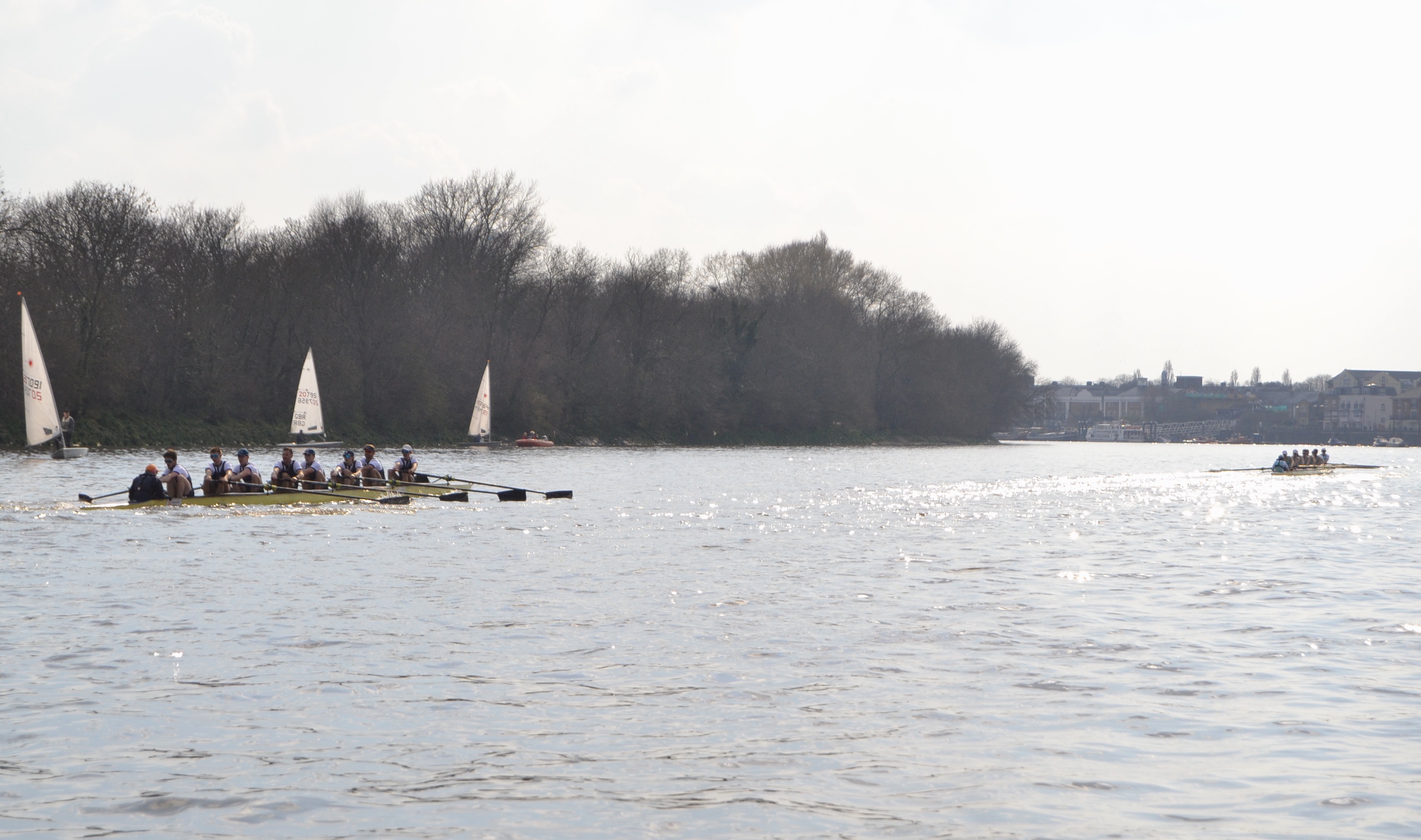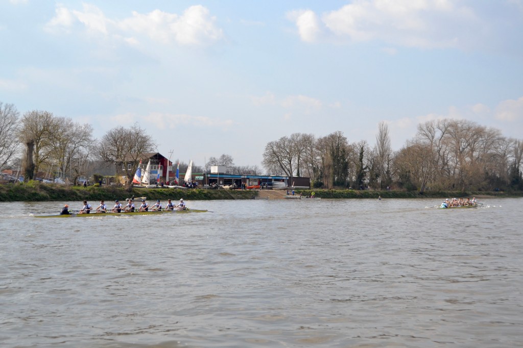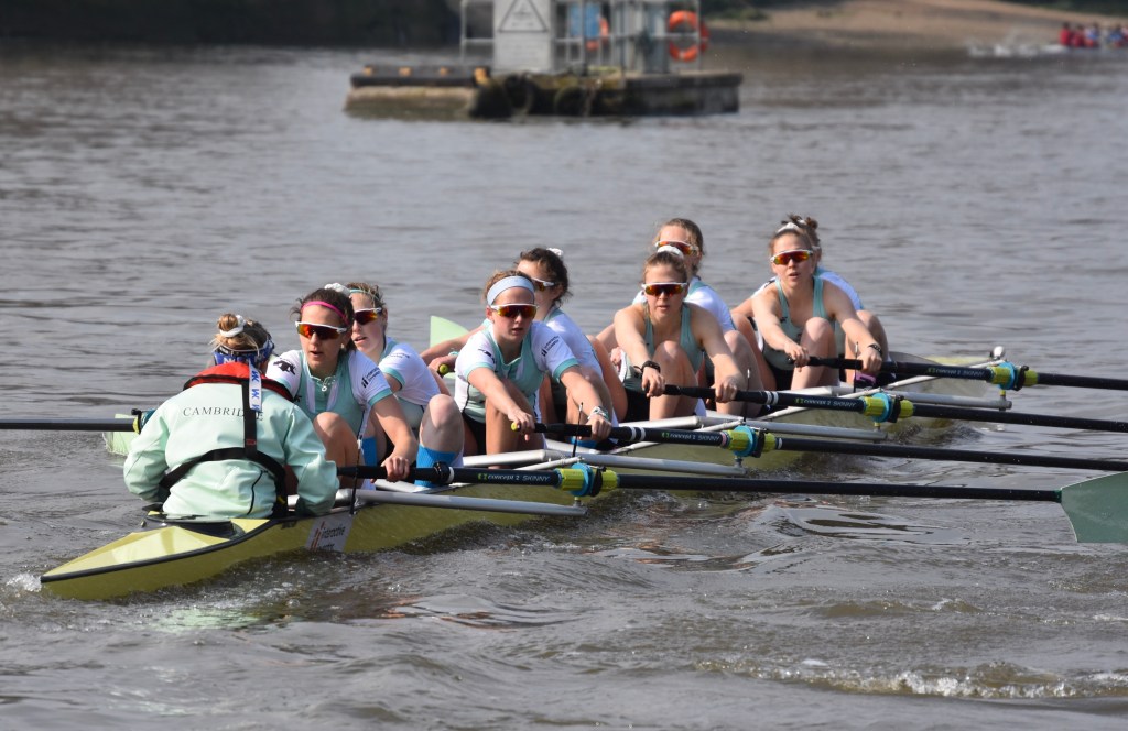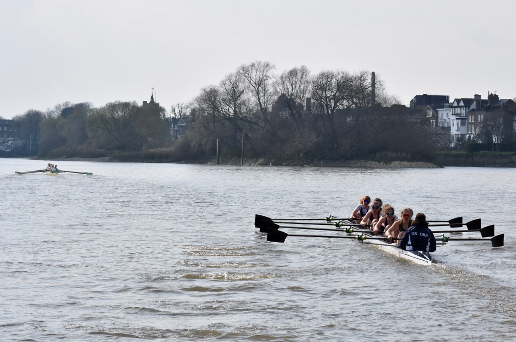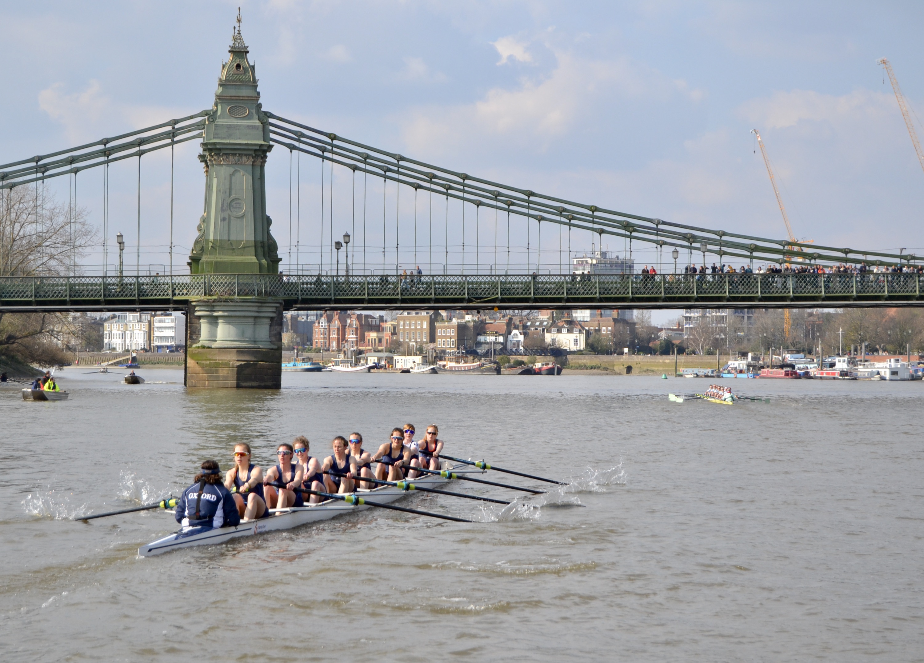 Umpire Judith Packer keeps a watch on the women’s crews racing along Putney Embankment, a few seconds off the start. It was a warm, calm day with a following breeze and a strong tide.Before the end of the Embankment, Cambridge were already looking confident.Oxford, also pictured near the end of Putney Embankment, but looking less settled than their opponents.After Barn Elms, two-and-a-half minutes into the race, Cambridge had clear water and cox Jodie Cameron decided on the bold move of switching stations.Twenty-seconds separated this picture and the one above. Umpire Packer warned Cambridge constantly during this move but there was no clash and the Light Blues got away with their risky manoeuvre.Oxford, voluntarily or not, accepted the change of stations, the gap between the two boats continued to increase and Judith Packer had little to do for the rest of the race.At Hammersmith Bridge, with 40 percent of the race gone Cambridge were 16 seconds ahead.Passing St Paul’s School.By the Old Ship pub, Cambridge take a look.The rates at Chiswick Eyot were Oxford 35, Cambridge 36. The Tabs were not content to just sit on their opponents, they seemed to want as much open water as possible.Eleven minutes in and, for those in second place, it was probably starting to sting a bit.At Chiswick Pier, Oxford stay sharp. At Chiswick Steps however, they were 28 seconds behind.The rates at Barnes Bridge were 32 for Oxford and 34 for Cambridge with a gap of 40 seconds.At “7”, Oxford’s Harriet Thomas looks as if she is giving the “110 percent” beloved of football players.Approaching the former Mortlake Brewery, now closed and no longer producing the distinctive brewing smell that signalled the finish for generations of rowers.Cambridge celebrate at the finish while Oxford still have more than 45 seconds of rowing left.