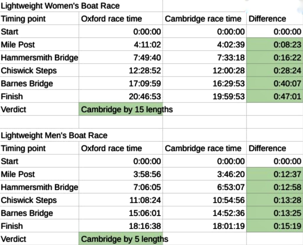 Cambridge won by 15 lengths in a time of 19m 59s. Last year at Ely, Cambridge won by 2 1/2 lengths. In the only other Lightweight Women’s Boat Race held on the Tideway, in 2020 Cambridge won by six lengths in a time of 23m 26s.