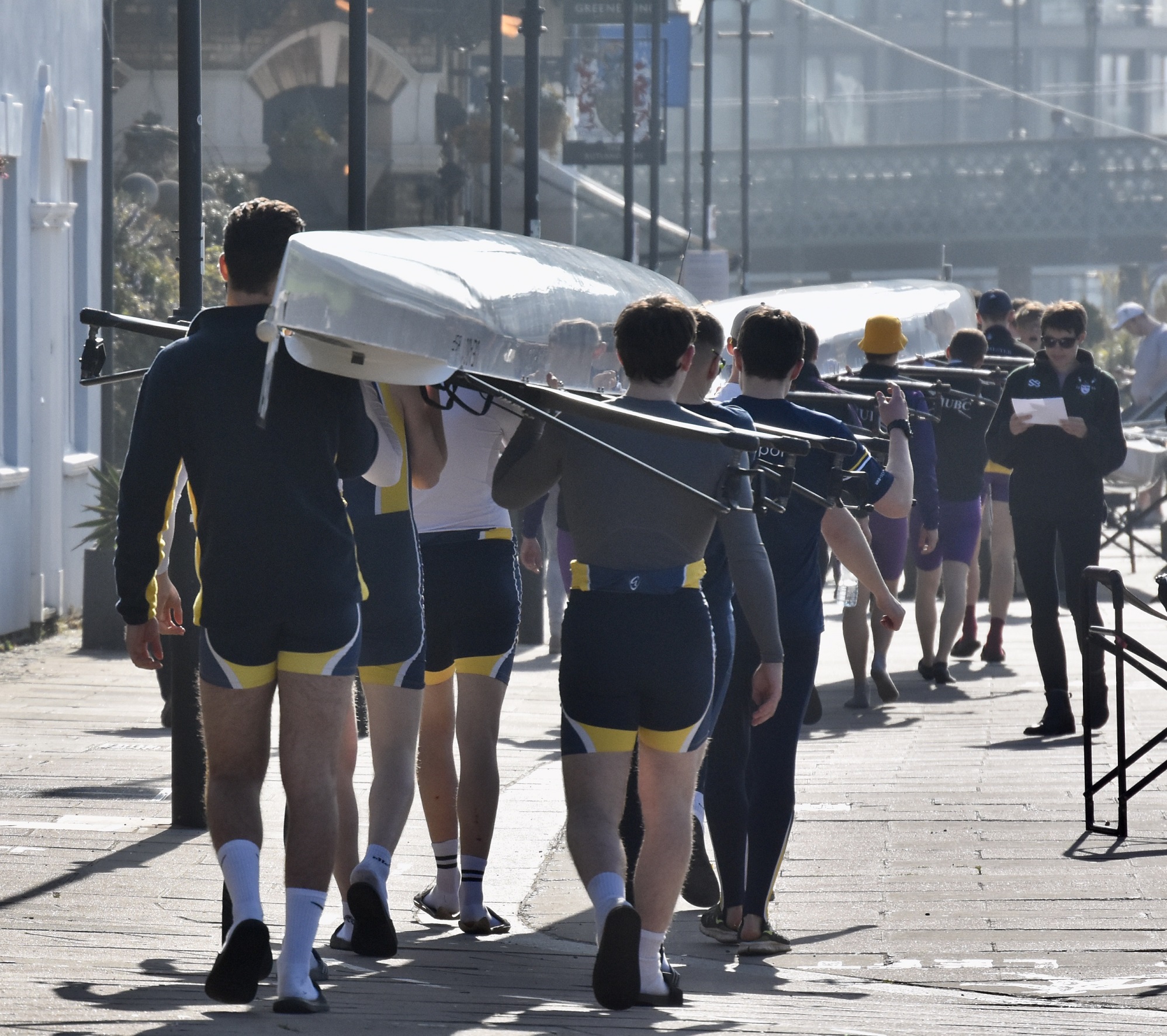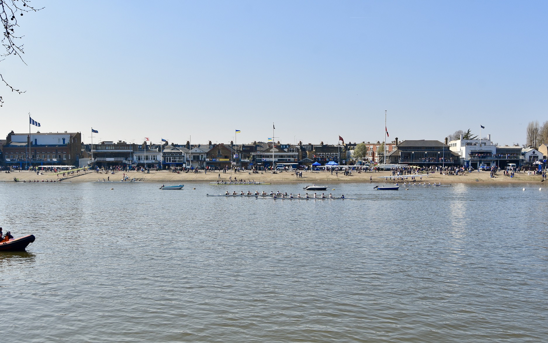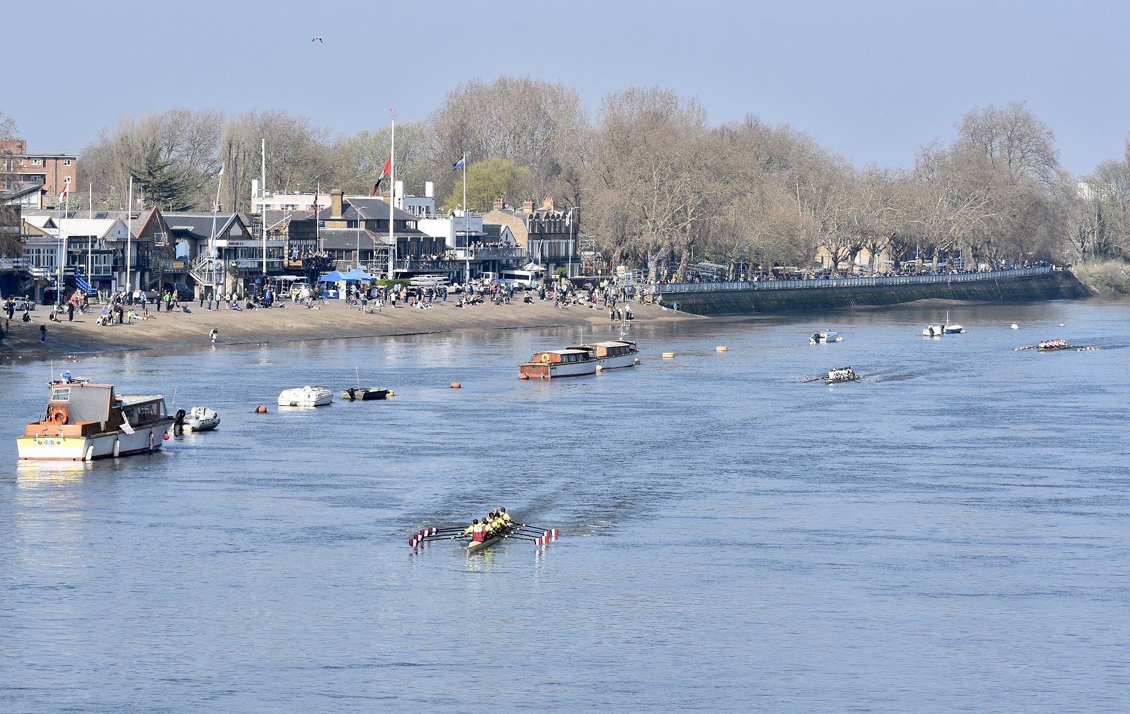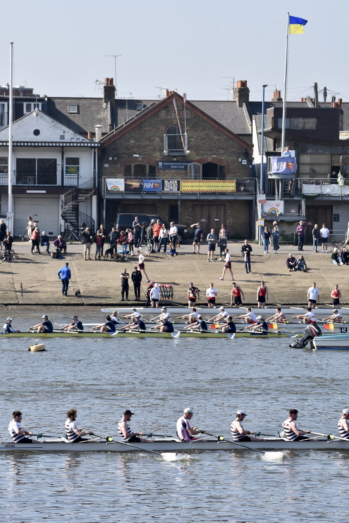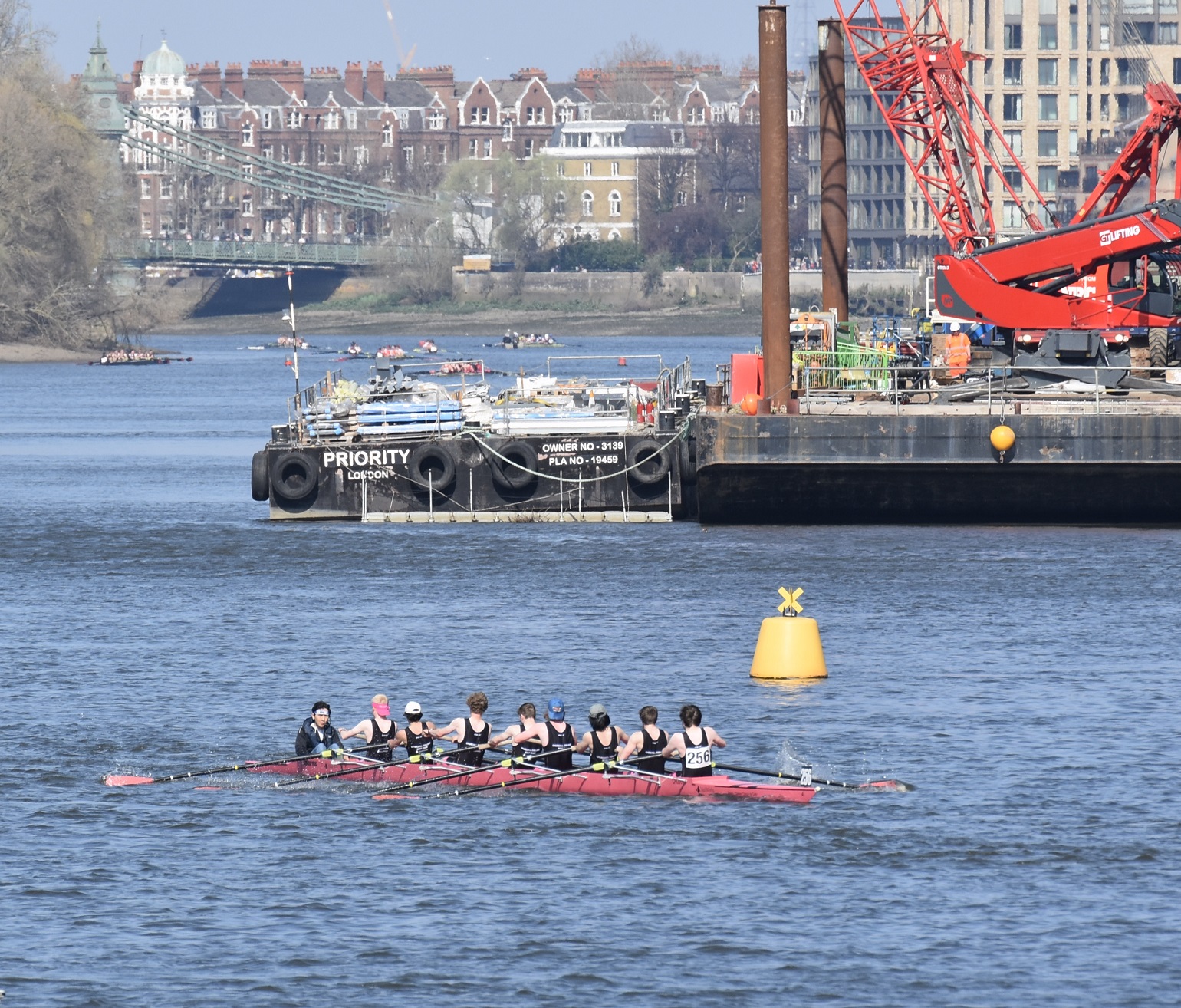 Hoping for a purple patch, Manchester University Boat Club B boat from Furnivall Gardens, Hammersmith. As this picture indicates, it was a bright, sunny and warm day with little wind.The University of East Anglia Boat Club A crew line up to boat from Furnivall Sculling Club’s ramp.One for the socials.Going to the start. In the foreground, Nottingham and Union Rowing Club “B” are about to pass under Hammersmith Bridge.University of York Boat Club B under Hammersmith Bridge on their way to Mortlake.Apart from being an occasional T-shirt model, James Lee is a cox, coach, event organiser, umpire, team manager, photographer and owner of the “Rock the Boat” clothing and accessory company.On land, there is a brief, strangely quiet period when all the crews are on the water, but racing has not yet started. Lines of deserted boat trailers line Putney Embankment…Footwear lies temporarily abandoned at Barn Elms…Crowds on Hammersmith Bridge wait for the first boats to pass under (the bridge will be closed for the Oxford – Cambridge Boat Races, 10.00 – 5.00 on 3 April). Picture: @JLee_RowThe first three boats pass Putney Embankment, and they were eventually placed in the order that they started. First: Oxford Brookes A, 16.59.8. Second: Leander A, 17.15.7. Third: Oxford Brookes B 17.17.1.In the foreground, Brookes A is finished but Leander A is nearly 16 seconds behind them, a great tribute to Brookes who seem to be in a class of their own.On their way home, Imperial College A (18.03.5) cheer on Imperial college B (18.38.0) for their last few strokes.Nottingham RC cross the line while Lea A look on.Putney Embankment in mid-race viewed from Bishop’s Park.Bath University BC A pass London’s clubhouse.Cork Boat Club B, Ireland, pass the Westminster School boathouse – which is flying the Ukrainian flag – and, on the left, Crabtree Boat Club.Commercial Rowing Club, Ireland, and Auriol Kensington RC A opposite Thames and Imperial College.Butler College Boat Club (background), University of York Boat Club A (middle ground) and Pembroke College (Cambridge) Boat Club A (foreground) passing Chas Newens chandlers and the Putney High School boathouse.A view of the finish and of Putney Embankment from Putney Bridge.Churchill College Boat Club B passes the developments at Fulham Football Ground.Fulham Reach BC A is photobombed by a gull.The beer in North Rhine-Westphalia is possibly superior to the brew this German visitor is drinking, but few things taste better than post-race alcohol.The full results are here. Remarkably, there is over a minute between the first and the tenth crew. This year’s entry was 295 crews, it has been a long time since the entry reached the 420 maximum allowed. Speculation is that this drop is due to the number of times that the event has had to be cancelled in recent times.Although he is 160 years old, it seems that Steve can still attract the ladies. Briefly back at Thames, the Fairbairn bust is readied for the prize giving ceremony when it will be presented to Brookes A as the Head of the River Crew. Picture: @EightsHead.