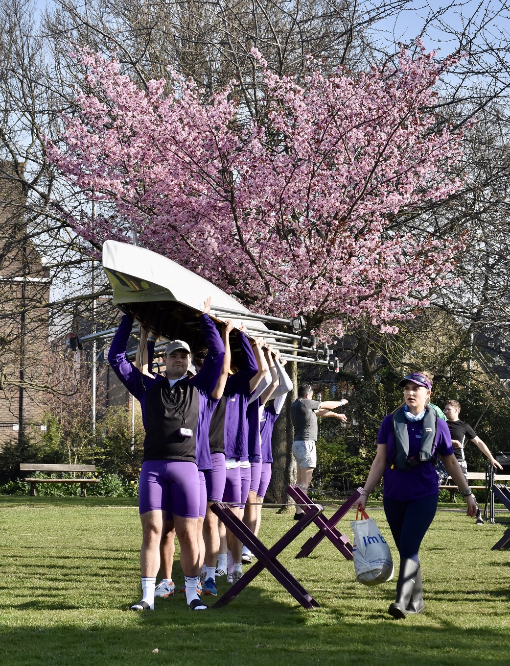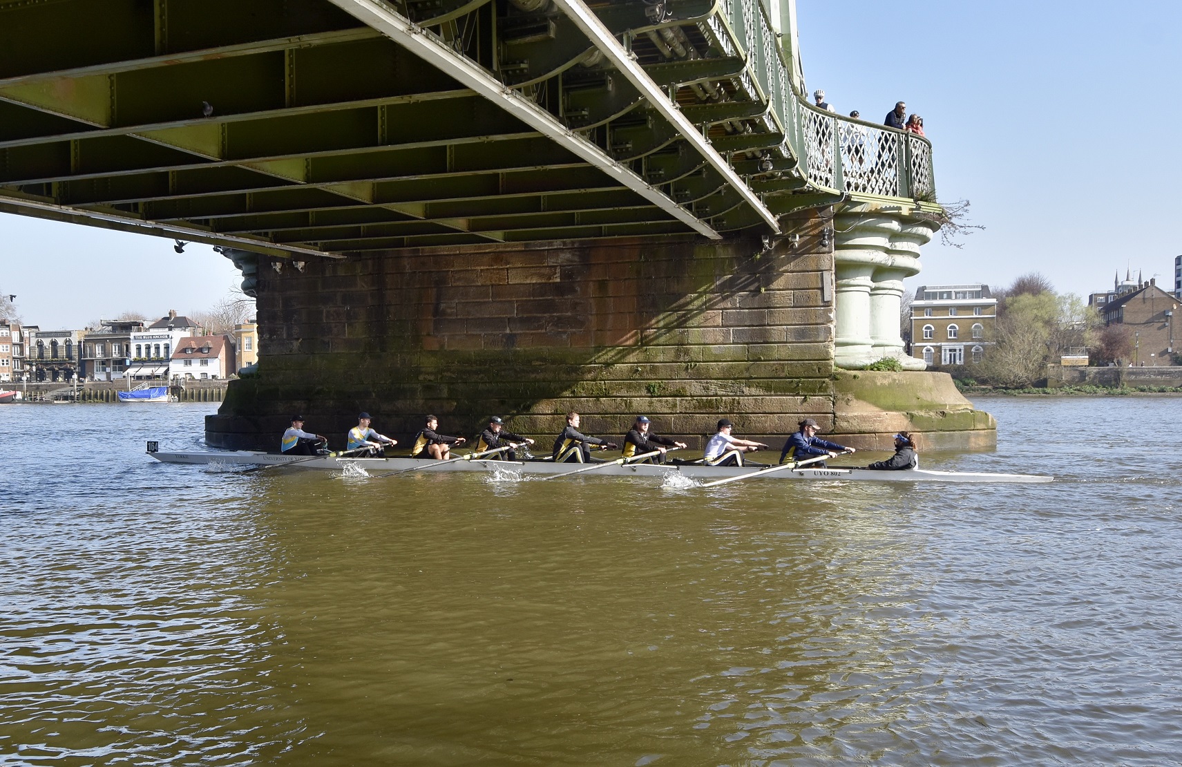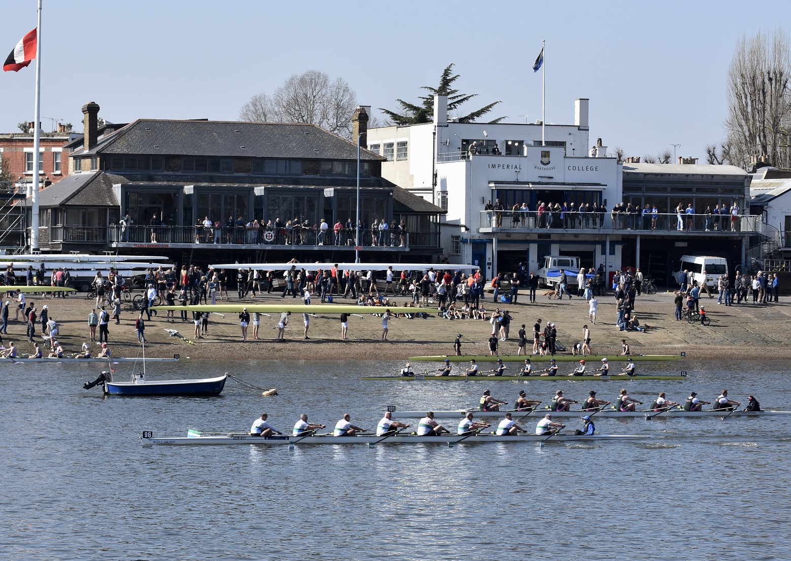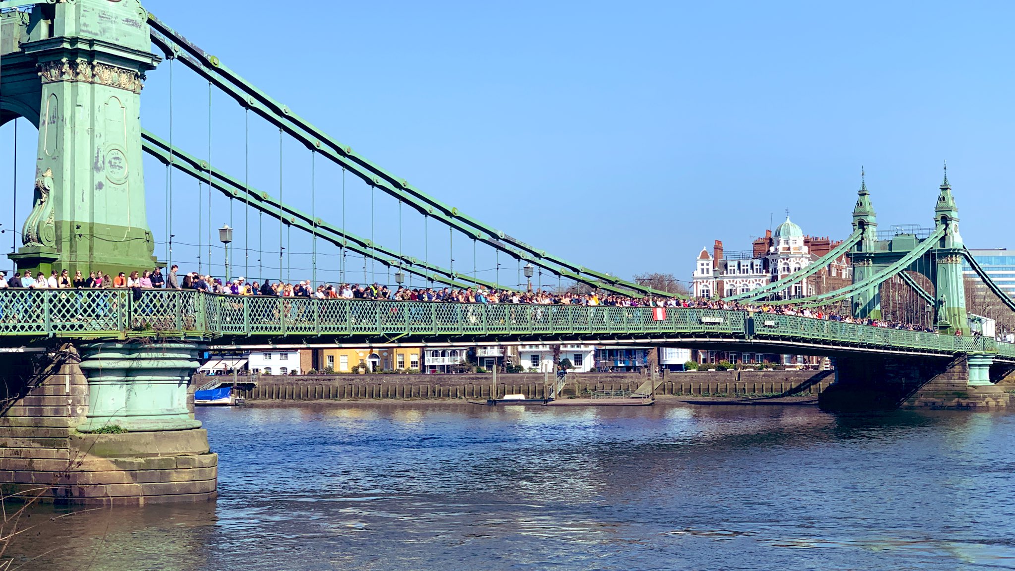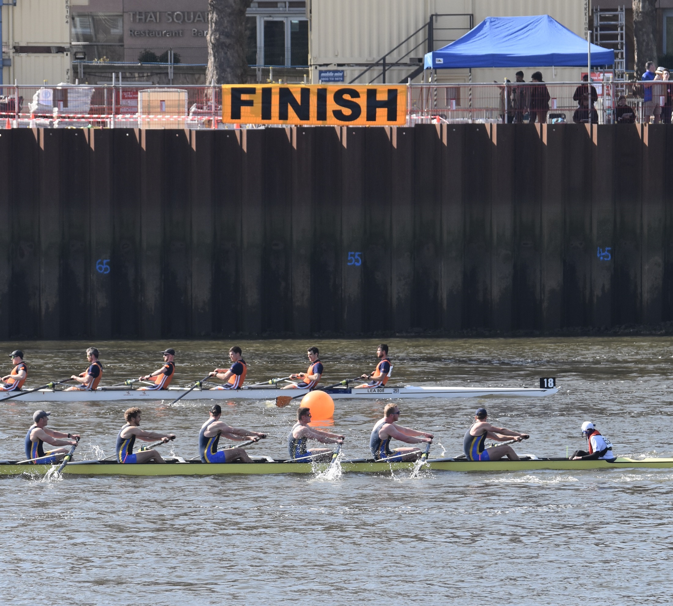 Hoping for a purple patch, Manchester University Boat Club B boat from Furnivall Gardens, Hammersmith. As this picture indicates, it was a bright, sunny and warm day with little wind.The University of East Anglia Boat Club A crew line up to boat from Furnivall Sculling Club’s ramp.One for the socials.Going to the start. In the foreground, Nottingham and Union Rowing Club “B” are about to pass under Hammersmith Bridge.University of York Boat Club B under Hammersmith Bridge on their way to Mortlake.Apart from being an occasional T-shirt model, James Lee is a cox, coach, event organiser, umpire, team manager, photographer and owner of the “Rock the Boat” clothing and accessory company.On land, there is a brief, strangely quiet period when all the crews are on the water, but racing has not yet started. Lines of deserted boat trailers line Putney Embankment…Footwear lies temporarily abandoned at Barn Elms…Crowds on Hammersmith Bridge wait for the first boats to pass under (the bridge will be closed for the Oxford – Cambridge Boat Races, 10.00 – 5.00 on 3 April). Picture: @JLee_RowThe first three boats pass Putney Embankment, and they were eventually placed in the order that they started. First: Oxford Brookes A, 16.59.8. Second: Leander A, 17.15.7. Third: Oxford Brookes B 17.17.1.In the foreground, Brookes A is finished but Leander A is nearly 16 seconds behind them, a great tribute to Brookes who seem to be in a class of their own.On their way home, Imperial College A (18.03.5) cheer on Imperial college B (18.38.0) for their last few strokes.Nottingham RC cross the line while Lea A look on.Putney Embankment in mid-race viewed from Bishop’s Park.Bath University BC A pass London’s clubhouse.Cork Boat Club B, Ireland, pass the Westminster School boathouse – which is flying the Ukrainian flag – and, on the left, Crabtree Boat Club.Commercial Rowing Club, Ireland, and Auriol Kensington RC A opposite Thames and Imperial College.Butler College Boat Club (background), University of York Boat Club A (middle ground) and Pembroke College (Cambridge) Boat Club A (foreground) passing Chas Newens chandlers and the Putney High School boathouse.A view of the finish and of Putney Embankment from Putney Bridge.Churchill College Boat Club B passes the developments at Fulham Football Ground.Fulham Reach BC A is photobombed by a gull.The beer in North Rhine-Westphalia is possibly superior to the brew this German visitor is drinking, but few things taste better than post-race alcohol.The full results are here. Remarkably, there is over a minute between the first and the tenth crew. This year’s entry was 295 crews, it has been a long time since the entry reached the 420 maximum allowed. Speculation is that this drop is due to the number of times that the event has had to be cancelled in recent times.Although he is 160 years old, it seems that Steve can still attract the ladies. Briefly back at Thames, the Fairbairn bust is readied for the prize giving ceremony when it will be presented to Brookes A as the Head of the River Crew. Picture: @EightsHead.