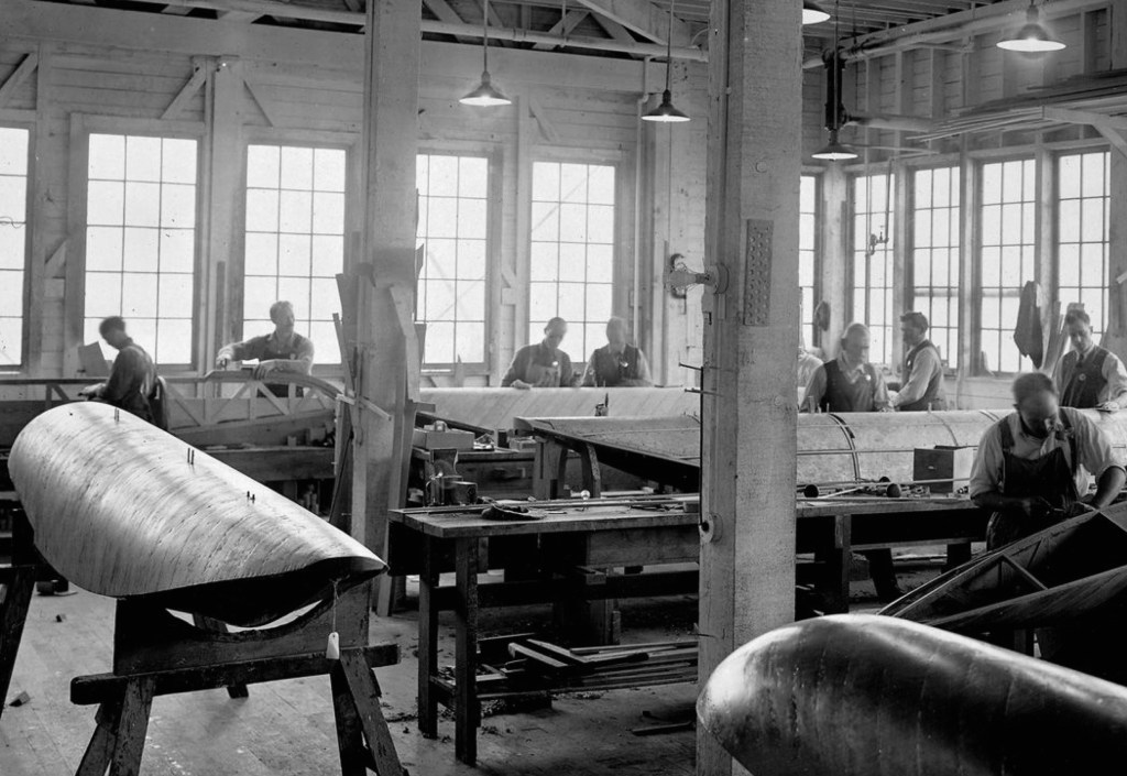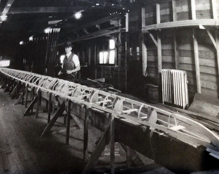 Then came a turn of events when world war broke out in Europe. Dr Suzzalo, the president of the university, brought a friend to the Tokyo Tearoom to inspect the workmanship. Mr W E Boeing was looking for someone to build pontoons for his new seaplane. Boeing asked George to make two pairs – essentially large Eton sculling boats enclosed by decks. When the U.S. entered the war in 1917, Boeing ordered 50 twin-float C-type planes. George, now working for the aeroplane company, hired 12 men and built all 150 pontoons at the rate of two a day. They were completed before a single airframe was ready.