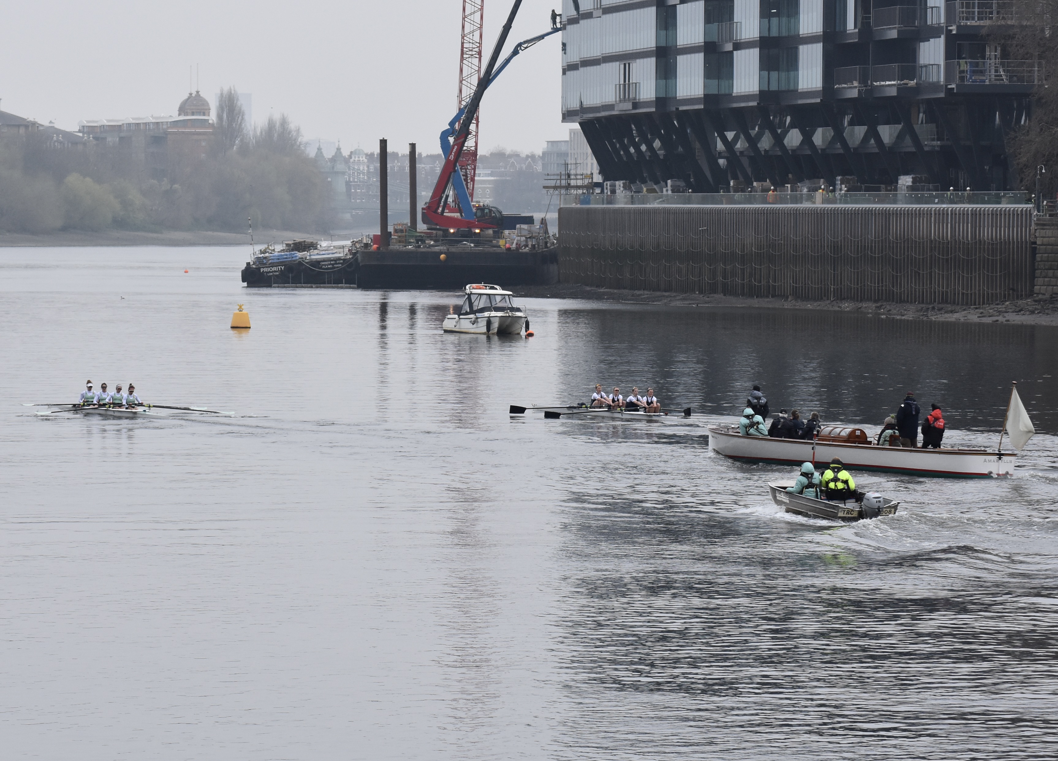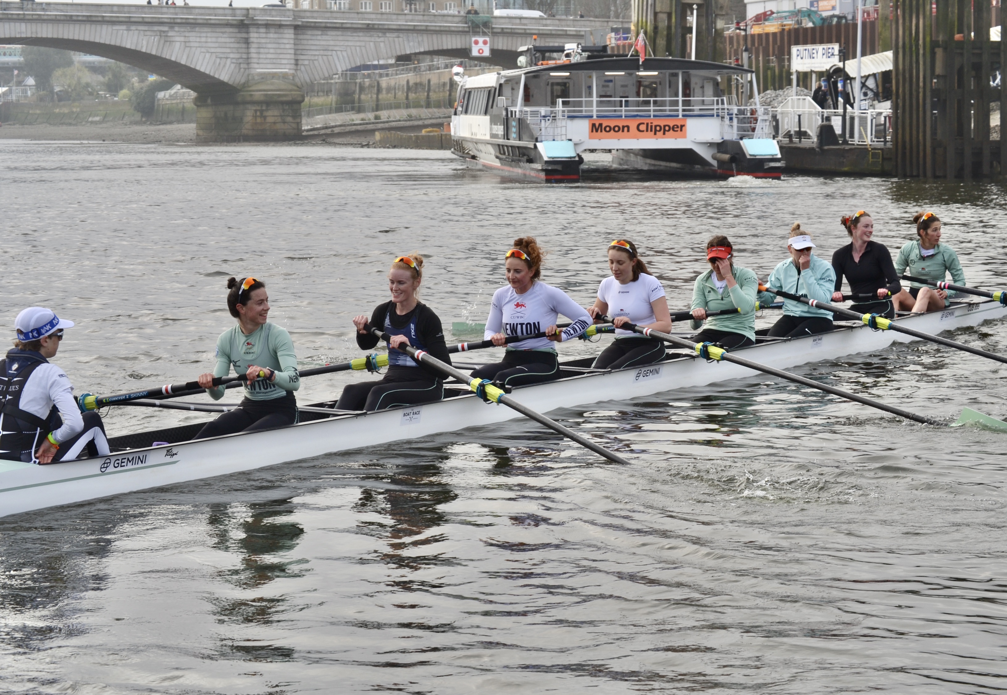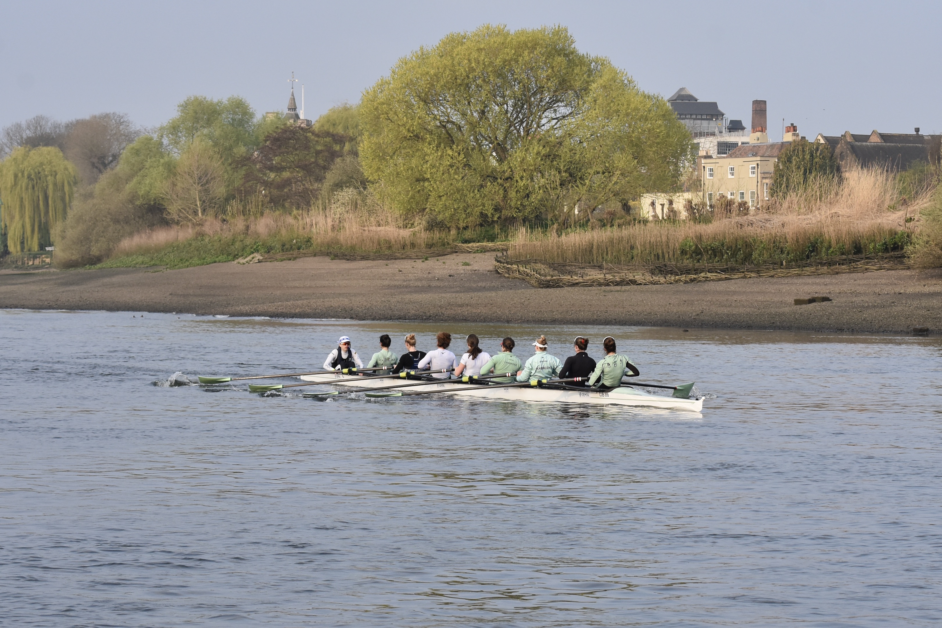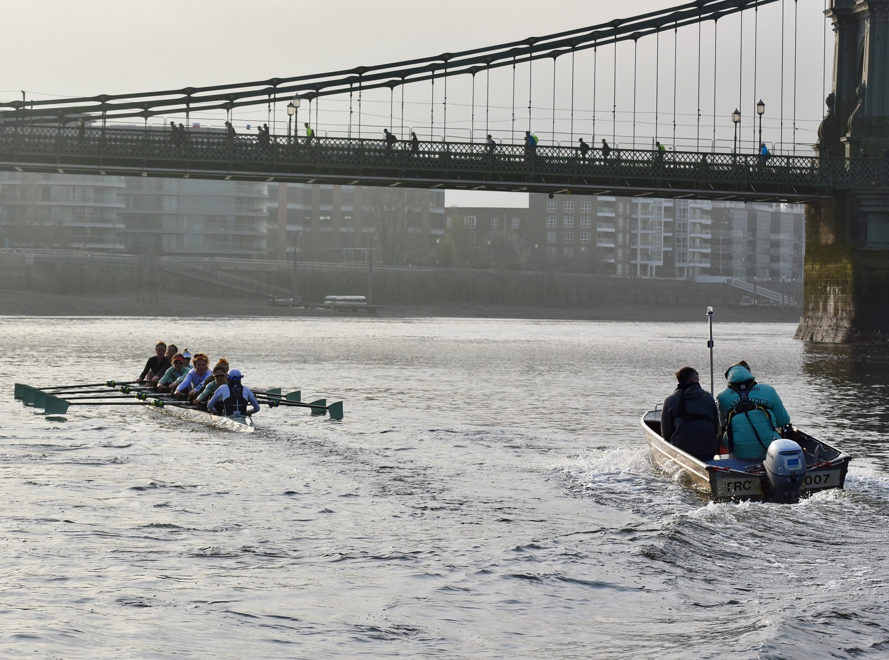 Golden Days: Head on.Golden Days: Reaching out.Passing the Mile Post in their new Filippi.The 2022 Cambridge Women’s Blue Boat Crew, bow to cox.Jasper Parish, cox, and Imogen Grant, stroke. Jasper is studying computer science. Last year, his St Paul’s crew narrowly lost Henley’s Princess Elizabeth to Eton. Imogen is back studying medicine after intermitting for two years to trial and represent Team GB at the Tokyo Olympics. She was fourth in the lightweight double sculls and is a double Blue.Grace Prendergast is studying an MPhil in Planning, Growth and Regeneration. Rowing for New Zealand, she won gold in the women’s pairs and silver in the women’s eight at the Tokyo Olympics, was the world’s highest-ranked female rower in 2019 and is a double world record holder.Grace cuts an ungainly figure at “7” due to her scoliosis, a sideways curvature of the spine, a condition that she shares with Usain Bolt. She told Row2k.com: “I’m fortunate that it hasn’t hindered my ability to row, although it has caused me to end up with a slightly unique rowing style to watch and sitting behind me in the boat probably takes a bit of getting used to… It also means that you’ll never catch me rowing stroke (port) side.”Bronya Sykes (5, President) is studying archaeology. She was selected for the Blue boat for the cancelled 2020 race and was then part of the victorious crew in 2021. Caoimhe (phonetically, Kwee-vuh) Dempsey (6) is studying for a PhD in psychology. She represented Ireland at the Under-23 European Championships in 2017 and is a returning Blue from last year’s winning crew.Ruby Tew (4) is studying for an MBA at the Judge Business School. She has rowed for New Zealand at the last two Olympics, 2020 and 2016. Paige Badenhorst is studying management, also at the Judge Business School. She represented South Africa at the 2016 Junior World Rowing Championships and then went to the University of Michigan, USA, where she was Big Ten Champion 2021 with the Second Varsity Eight.Sarah Portsmouth (2) is studying architecture. She represented England at the Coupe de la Jeunesse in 2018, was in the Blue boat for the cancelled 2020 race and is a returning Blue from last year’s winning crew. Adriana Perez Rotondo is studying for a PhD in engineering. She is a product of the club’s development squad having taken up the sport at Cambridge. She was a part of the Blondie crew in 2019, and last year became the first Spaniard to row in the Women’s Boat Race.Passing Chiswick Eyot.Under Hammersmith Bridge shadowed by the women’s chief coach, Paddy Ryan, and Al Taylor, one of the CUBC support team.Below Putney Bridge.The crew looks pleased with the outing.Instead of the traditional “Spare Pairs Race”, the women ran a “Spare Fours Race” in, oddly, coxed fours. Coxless fours would seem to be a more sensible transition from an eight (assuming both crews can steer such a craft).Cambridge won the “Spare Fours” by three lengths, racing from the Boat Race start to St Paul’s School.