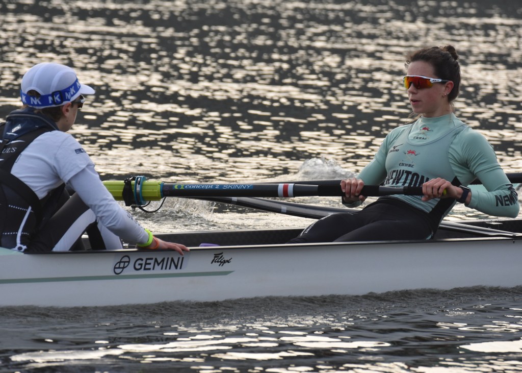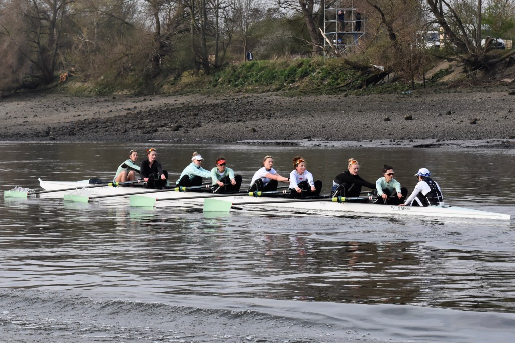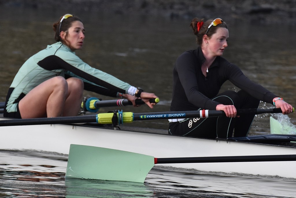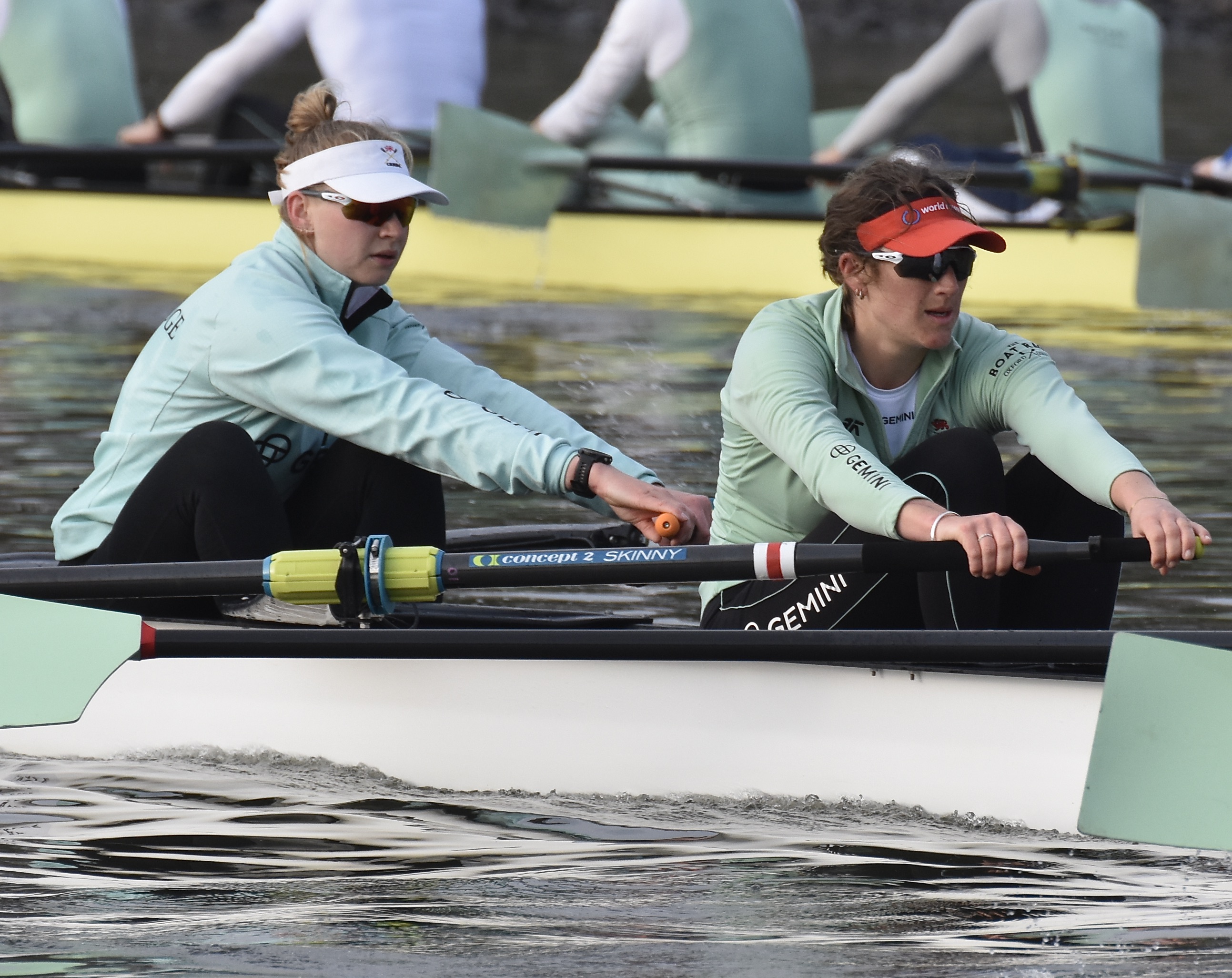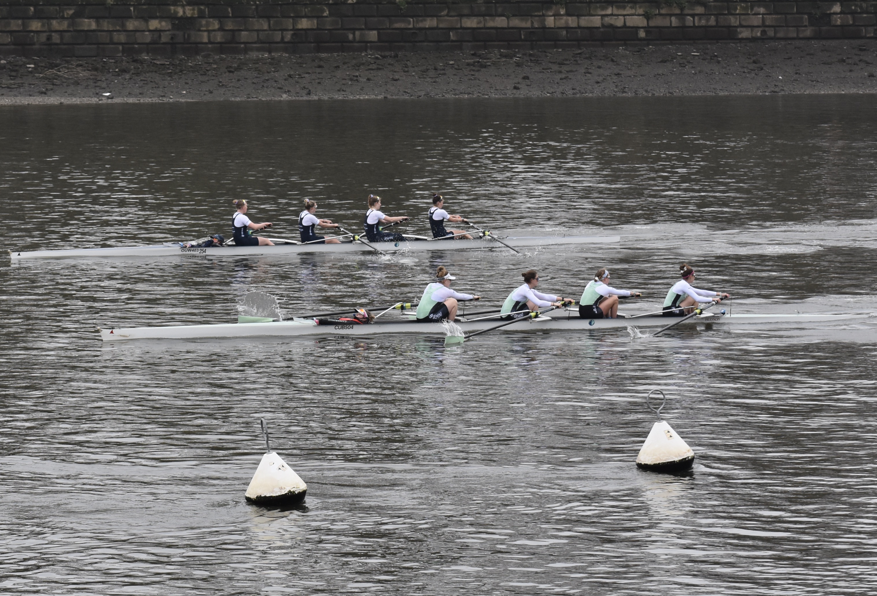 Golden Days: Head on.Golden Days: Reaching out.Passing the Mile Post in their new Filippi.The 2022 Cambridge Women’s Blue Boat Crew, bow to cox.Jasper Parish, cox, and Imogen Grant, stroke. Jasper is studying computer science. Last year, his St Paul’s crew narrowly lost Henley’s Princess Elizabeth to Eton. Imogen is back studying medicine after intermitting for two years to trial and represent Team GB at the Tokyo Olympics. She was fourth in the lightweight double sculls and is a double Blue.Grace Prendergast is studying an MPhil in Planning, Growth and Regeneration. Rowing for New Zealand, she won gold in the women’s pairs and silver in the women’s eight at the Tokyo Olympics, was the world’s highest-ranked female rower in 2019 and is a double world record holder.Grace cuts an ungainly figure at “7” due to her scoliosis, a sideways curvature of the spine, a condition that she shares with Usain Bolt. She told Row2k.com: “I’m fortunate that it hasn’t hindered my ability to row, although it has caused me to end up with a slightly unique rowing style to watch and sitting behind me in the boat probably takes a bit of getting used to… It also means that you’ll never catch me rowing stroke (port) side.”Bronya Sykes (5, President) is studying archaeology. She was selected for the Blue boat for the cancelled 2020 race and was then part of the victorious crew in 2021. Caoimhe (phonetically, Kwee-vuh) Dempsey (6) is studying for a PhD in psychology. She represented Ireland at the Under-23 European Championships in 2017 and is a returning Blue from last year’s winning crew.Ruby Tew (4) is studying for an MBA at the Judge Business School. She has rowed for New Zealand at the last two Olympics, 2020 and 2016. Paige Badenhorst is studying management, also at the Judge Business School. She represented South Africa at the 2016 Junior World Rowing Championships and then went to the University of Michigan, USA, where she was Big Ten Champion 2021 with the Second Varsity Eight.Sarah Portsmouth (2) is studying architecture. She represented England at the Coupe de la Jeunesse in 2018, was in the Blue boat for the cancelled 2020 race and is a returning Blue from last year’s winning crew. Adriana Perez Rotondo is studying for a PhD in engineering. She is a product of the club’s development squad having taken up the sport at Cambridge. She was a part of the Blondie crew in 2019, and last year became the first Spaniard to row in the Women’s Boat Race.Passing Chiswick Eyot.Under Hammersmith Bridge shadowed by the women’s chief coach, Paddy Ryan, and Al Taylor, one of the CUBC support team.Below Putney Bridge.The crew looks pleased with the outing.Instead of the traditional “Spare Pairs Race”, the women ran a “Spare Fours Race” in, oddly, coxed fours. Coxless fours would seem to be a more sensible transition from an eight (assuming both crews can steer such a craft).Cambridge won the “Spare Fours” by three lengths, racing from the Boat Race start to St Paul’s School.