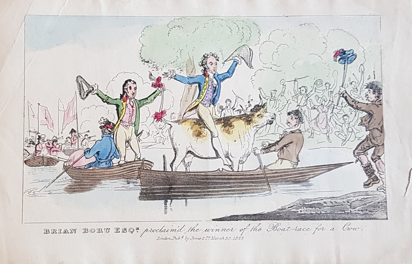 One of a series of caricatures of Mr. Boru, (the principal character in Pierce Egan’s ‘The Real Life in Ireland’, named after that country’s legendary first king), this image lampoons the practice of the time of awarding wherries to the winners of boat races. That wherries were big, heavy, and of little use to anyone but a waterman, may have inspired this satirist to suggest a cow as a prize of comparable bulk and higher utility.