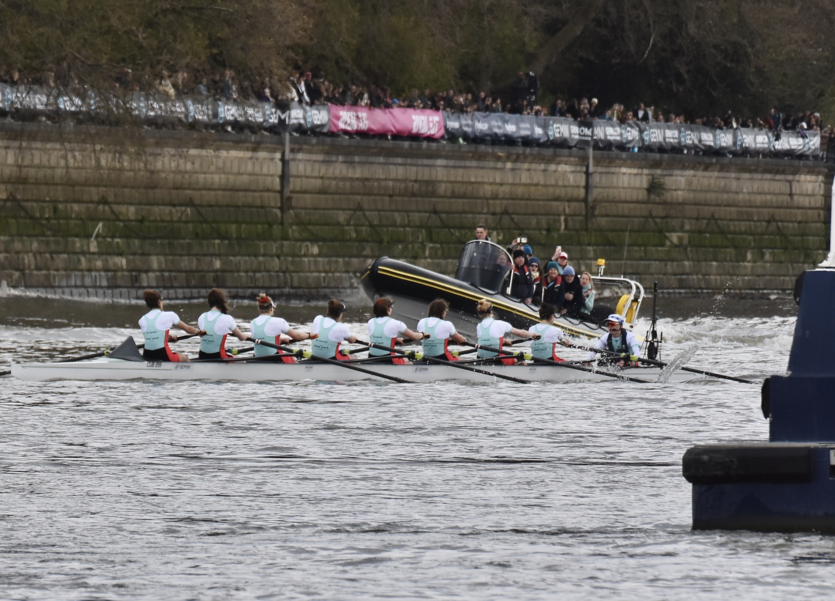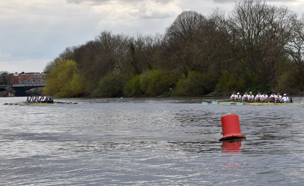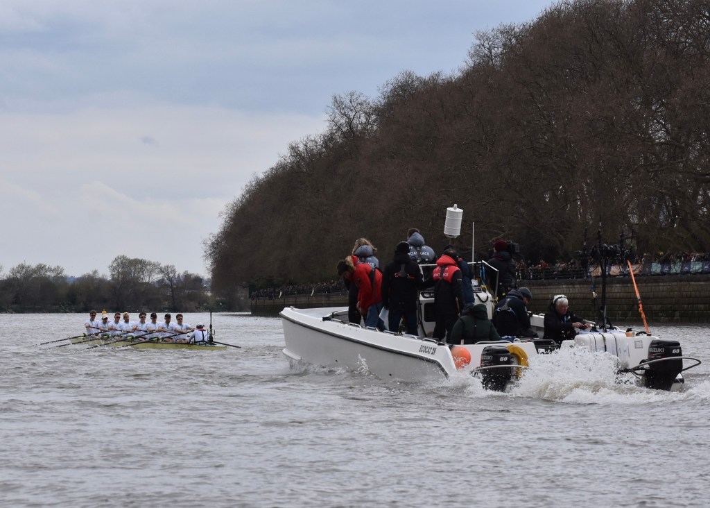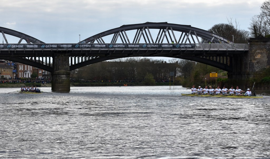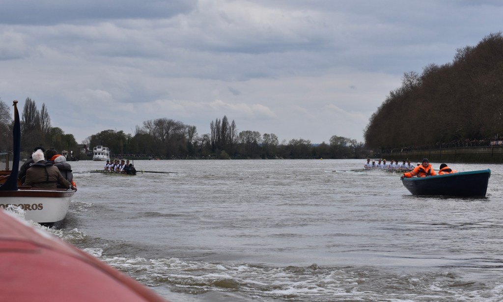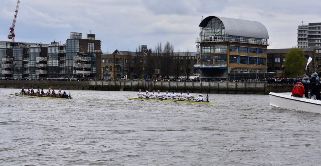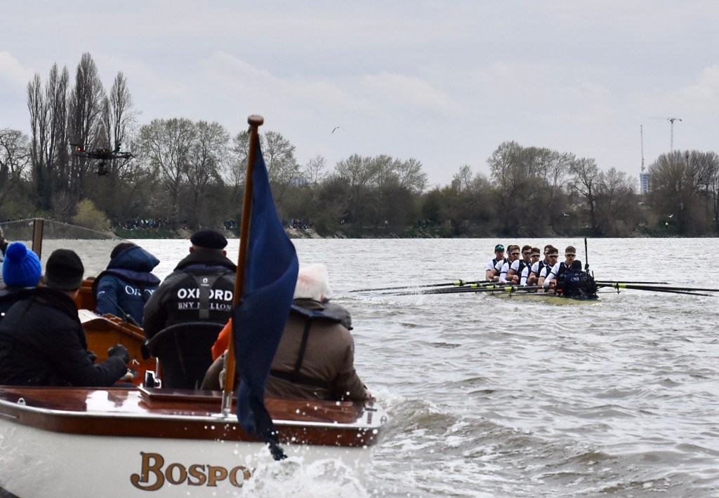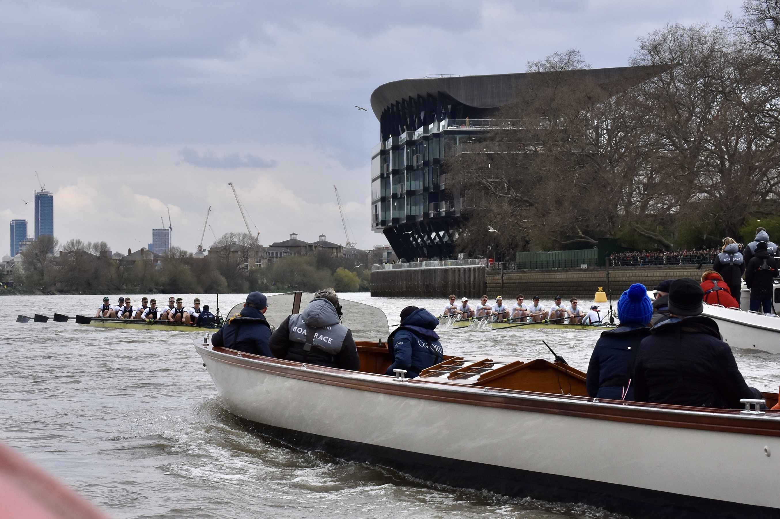 A shot from the church tower of St Mary’s, Putney. Although I was delighted and flattered to be given a seat in the press launch following the men’s race (the orange rib on the left), it did mean that that I could not cover any of the other three contests – though I did manage to get a few shots of the women’s race as it passed the Fulham Wall. Picture: @StMarysPutney.A shot taken 8 seconds after the start (henceforth styled “+ 8 sec”). Unfortunately, for the next vital minute, the press boat only had view of one or the other of the crews at any one time, their line of sight blocked by the umpire (unavoidable) or the Oxford launch (avoidable).+ 13 secs: Cambridge won the toss and took the unconventional decision to pick the Middlesex station. This gave the underdogs a two-thirds length advantage in the first mile. Presumably, the thinking was that going up and trying to stay up was preferable to coming from behind.+ 44 secs: If Cambridge’s plan was to gain an early advantage, it did not work. From the start, Oxford powered away and never yielded their advantage.+ 1 min 25 secs: Oxford were already half-a-length ahead as they passed the new-look Craven Cottage football ground.+ 2 mins 28 secs: From early on, Oxford clearly had found a rhythm while Cambridge, conscious that they had to make a comeback, never settled as well as their opponents.+ 3 mins 36 secs: Passing the Mile Post buoy. Oxford’s time to the Mile Post was 3 mins 38 secs, Cambridge’s was 3 mins 39 secs.+ 4 mins 42 secs. In Fulham Reach. Of course, the crews were photographed astern and from the side so it needs to be remembered that “parallax error” (the change in the apparent position of an object when viewed from different points) in this case makes the Oxford boat look further ahead than it actually was.+ 5 mins 22 secs: Cambridge down too much too soon.+ 5 mins 34 secs: Oxford look confident as they pass Fulham Reach Boat Club.+ 6 mins 34 secs: Oxford’s time to Hammersmith Bridge was 6 mins 34 secs, Cambridge recorded 6 mins 35 secs.The following flotilla passes Auriol Kensington Rowing Club. In the Cambridge blue jacket, coach Rob Baker understandably looks pensive.+ 7 mins 04 secs: Passing the Dove pub and Hammersmith Pier.+ 7 mins 59 secs: Alongside Furnivall Gardens, one of the “fan zones”.+ 8 mins 58 secs: Oxford at the Chiswick Eyot with Chiswick Church in the background.+ 11 mins 38 secs: For most of Boat Race history, this Cambridge crew would have been the favourites to win.+ 11 mins 48 secs: At the Chiswick Crossing with Barnes Bridge in the background, it looks hopeless for Cambridge.+ 13 mins 27 secs: Cambridge passes the steps shared by the Civil Service Boat House (home to Barnes Bridge Ladies and Cygnet Rowing Clubs) and the Emanuel School Boathouse. + 13 mins 41 secs: Oxford’s Barnes Bridge time was 13 min 51 secs, while Cambridge reached it in 13 mins 59 secs.+ 14 mins 50 secs: Less than two minutes to go, Oxford are hurting but not as much as Cambridge.+ 15 mins 41 secs: Until recently, crews could sometimes literally smell the finish if the now dormant Mortlake Brewery was doing its magic with hops, barley water and yeast. However, at this point, Oxford can probably still smell (and taste) victory.+ 15 mins 36 secs: Cambridge are valiant to the finish.+ 15 mins 41 secs: One minute left and the coxes can see the finish post.+ 16 mins 23 secs: The finish flag is raised, ready to be dropped.Oxford wins the 167th Boat Race, their first victory since 2017, in 16 mins 42 secs. Cambridge were 6 seconds behind.Graphic: BRCL