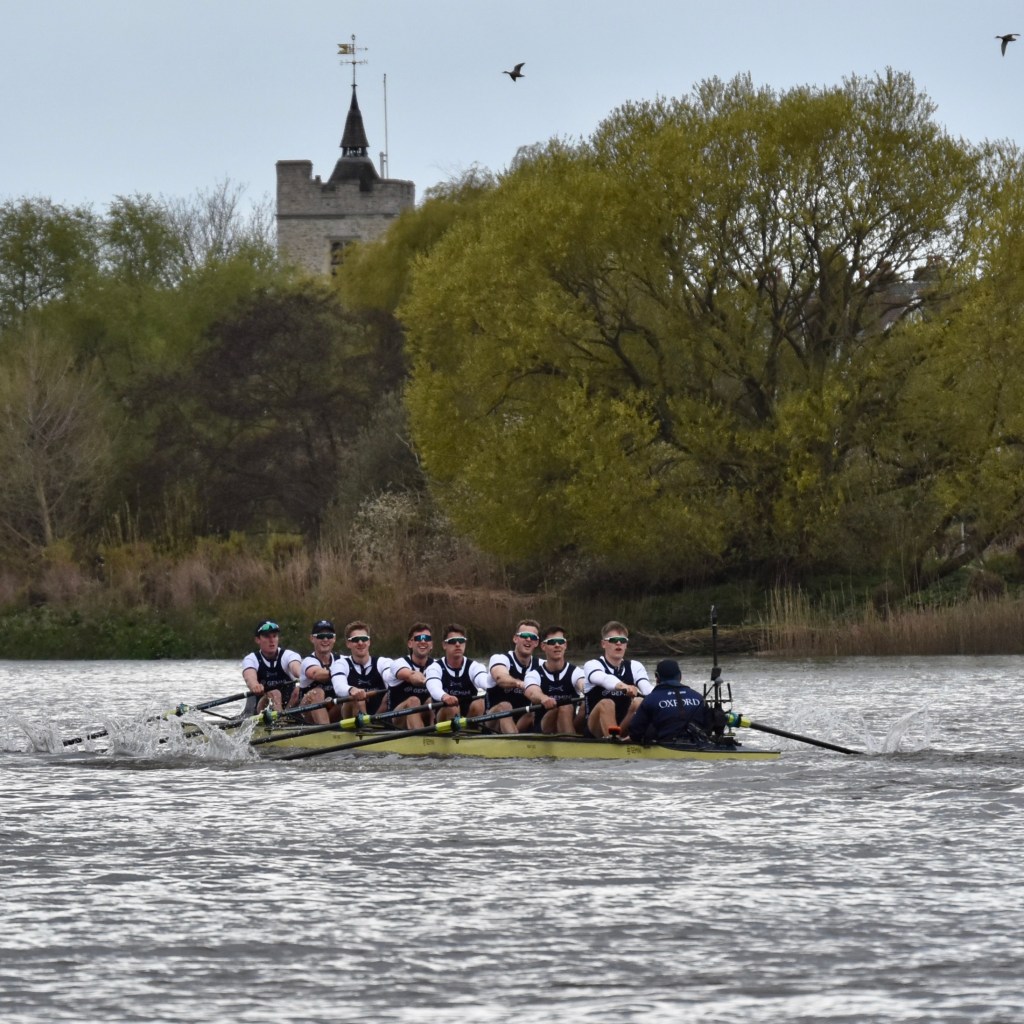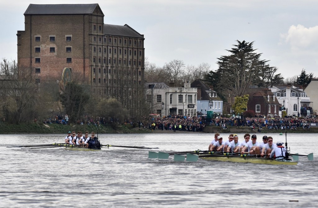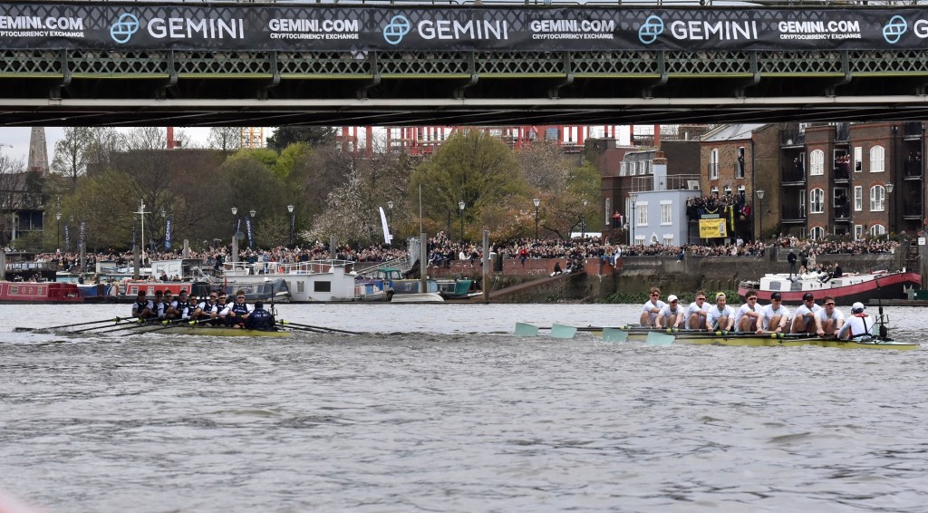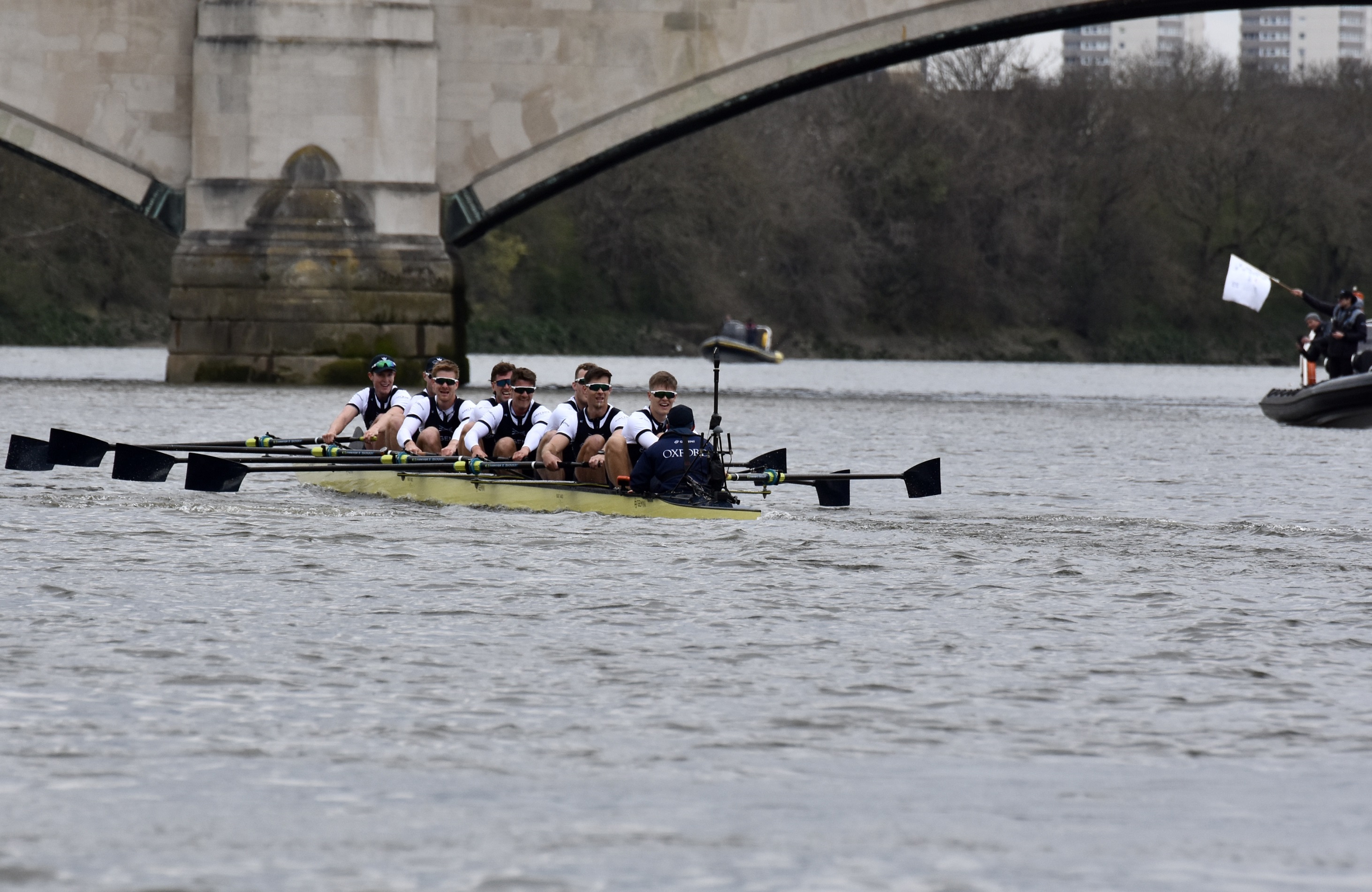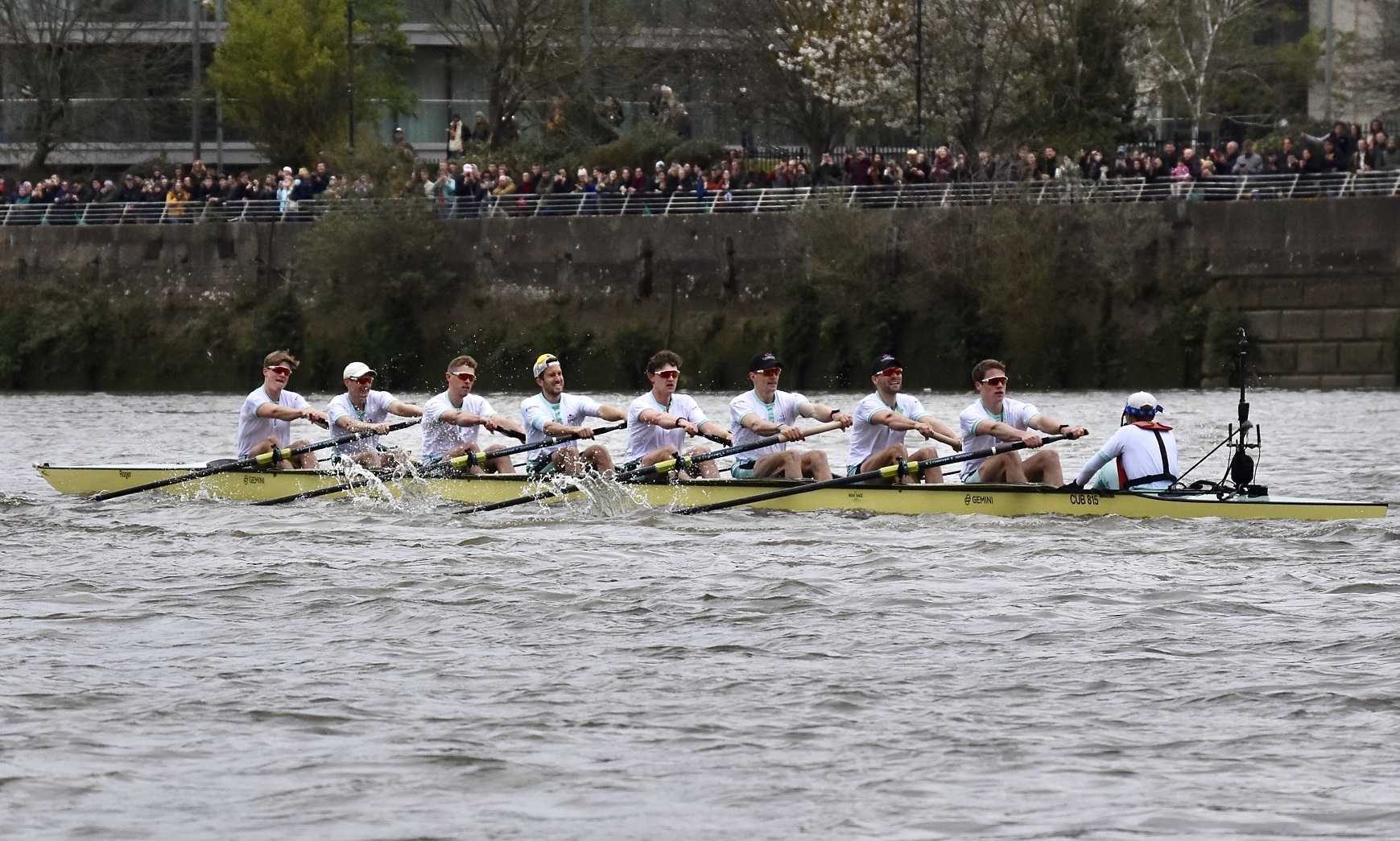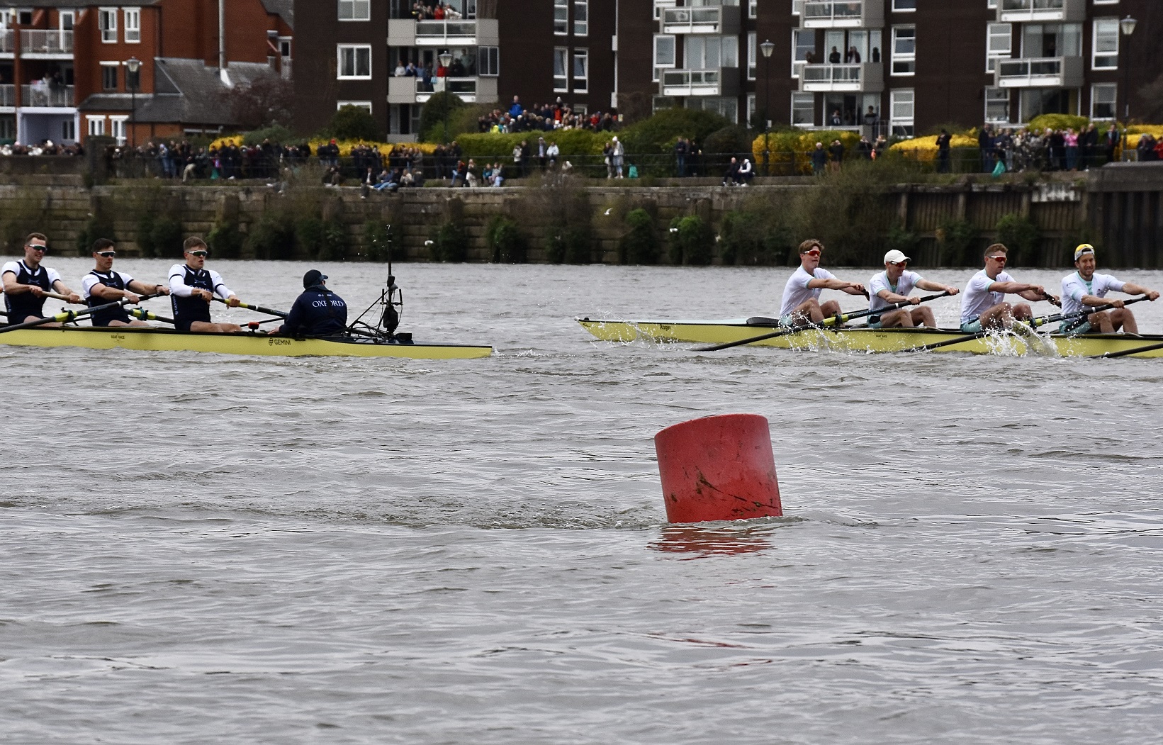 A shot from the church tower of St Mary’s, Putney. Although I was delighted and flattered to be given a seat in the press launch following the men’s race (the orange rib on the left), it did mean that that I could not cover any of the other three contests – though I did manage to get a few shots of the women’s race as it passed the Fulham Wall. Picture: @StMarysPutney.A shot taken 8 seconds after the start (henceforth styled “+ 8 sec”). Unfortunately, for the next vital minute, the press boat only had view of one or the other of the crews at any one time, their line of sight blocked by the umpire (unavoidable) or the Oxford launch (avoidable).+ 13 secs: Cambridge won the toss and took the unconventional decision to pick the Middlesex station. This gave the underdogs a two-thirds length advantage in the first mile. Presumably, the thinking was that going up and trying to stay up was preferable to coming from behind.+ 44 secs: If Cambridge’s plan was to gain an early advantage, it did not work. From the start, Oxford powered away and never yielded their advantage.+ 1 min 25 secs: Oxford were already half-a-length ahead as they passed the new-look Craven Cottage football ground.+ 2 mins 28 secs: From early on, Oxford clearly had found a rhythm while Cambridge, conscious that they had to make a comeback, never settled as well as their opponents.+ 3 mins 36 secs: Passing the Mile Post buoy. Oxford’s time to the Mile Post was 3 mins 38 secs, Cambridge’s was 3 mins 39 secs.+ 4 mins 42 secs. In Fulham Reach. Of course, the crews were photographed astern and from the side so it needs to be remembered that “parallax error” (the change in the apparent position of an object when viewed from different points) in this case makes the Oxford boat look further ahead than it actually was.+ 5 mins 22 secs: Cambridge down too much too soon.+ 5 mins 34 secs: Oxford look confident as they pass Fulham Reach Boat Club.+ 6 mins 34 secs: Oxford’s time to Hammersmith Bridge was 6 mins 34 secs, Cambridge recorded 6 mins 35 secs.The following flotilla passes Auriol Kensington Rowing Club. In the Cambridge blue jacket, coach Rob Baker understandably looks pensive.+ 7 mins 04 secs: Passing the Dove pub and Hammersmith Pier.+ 7 mins 59 secs: Alongside Furnivall Gardens, one of the “fan zones”.+ 8 mins 58 secs: Oxford at the Chiswick Eyot with Chiswick Church in the background.+ 11 mins 38 secs: For most of Boat Race history, this Cambridge crew would have been the favourites to win.+ 11 mins 48 secs: At the Chiswick Crossing with Barnes Bridge in the background, it looks hopeless for Cambridge.+ 13 mins 27 secs: Cambridge passes the steps shared by the Civil Service Boat House (home to Barnes Bridge Ladies and Cygnet Rowing Clubs) and the Emanuel School Boathouse. + 13 mins 41 secs: Oxford’s Barnes Bridge time was 13 min 51 secs, while Cambridge reached it in 13 mins 59 secs.+ 14 mins 50 secs: Less than two minutes to go, Oxford are hurting but not as much as Cambridge.+ 15 mins 41 secs: Until recently, crews could sometimes literally smell the finish if the now dormant Mortlake Brewery was doing its magic with hops, barley water and yeast. However, at this point, Oxford can probably still smell (and taste) victory.+ 15 mins 36 secs: Cambridge are valiant to the finish.+ 15 mins 41 secs: One minute left and the coxes can see the finish post.+ 16 mins 23 secs: The finish flag is raised, ready to be dropped.Oxford wins the 167th Boat Race, their first victory since 2017, in 16 mins 42 secs. Cambridge were 6 seconds behind.Graphic: BRCL
