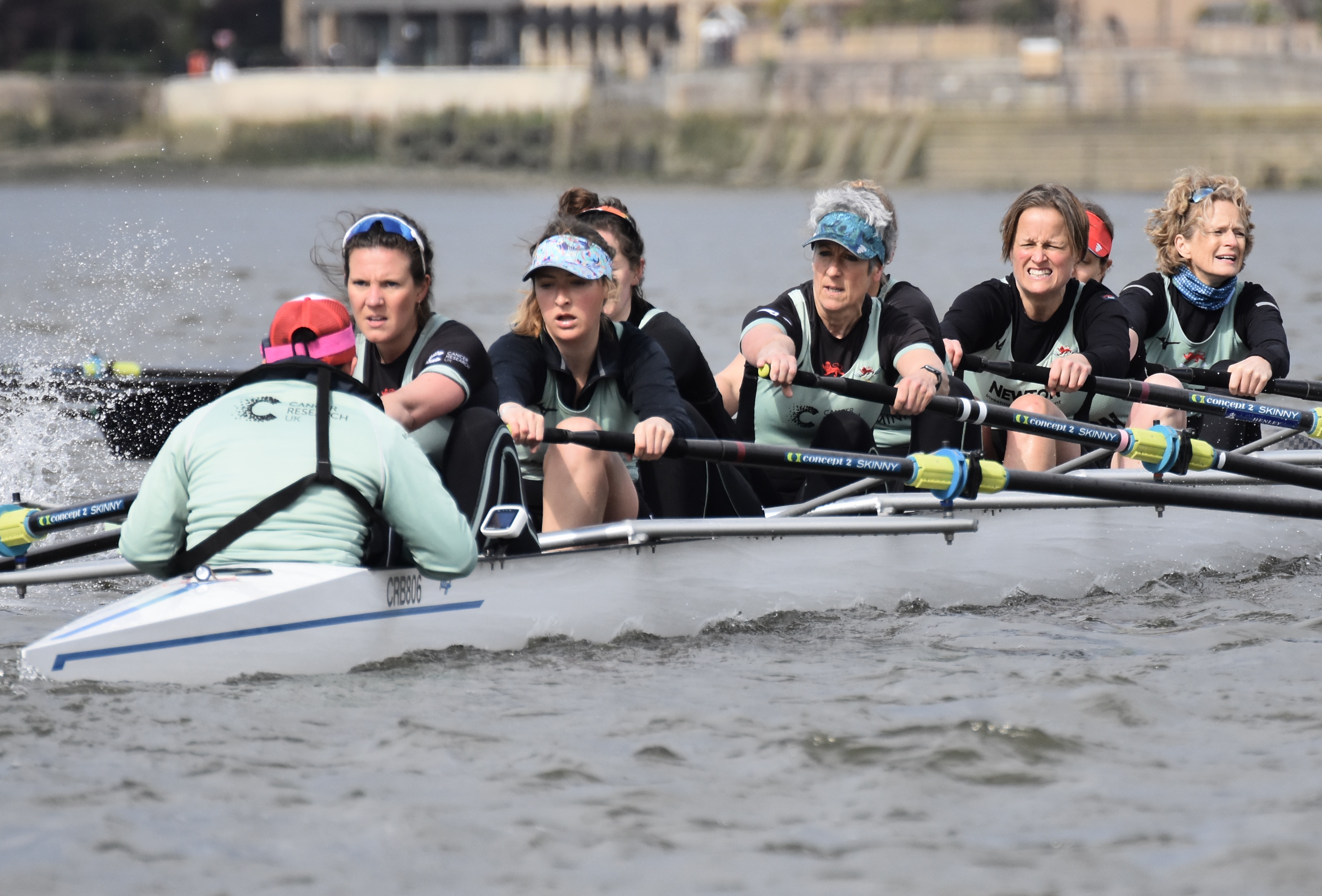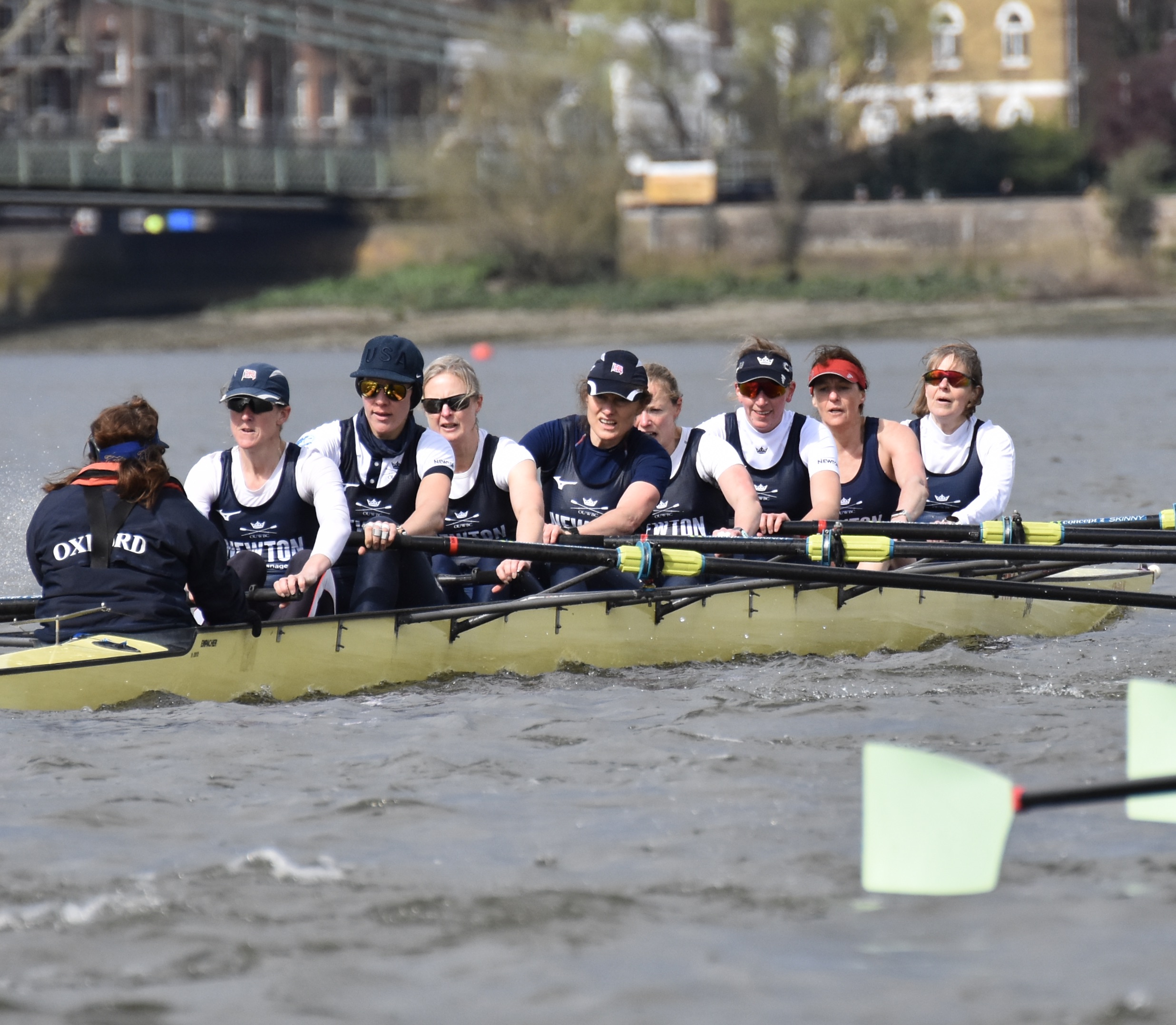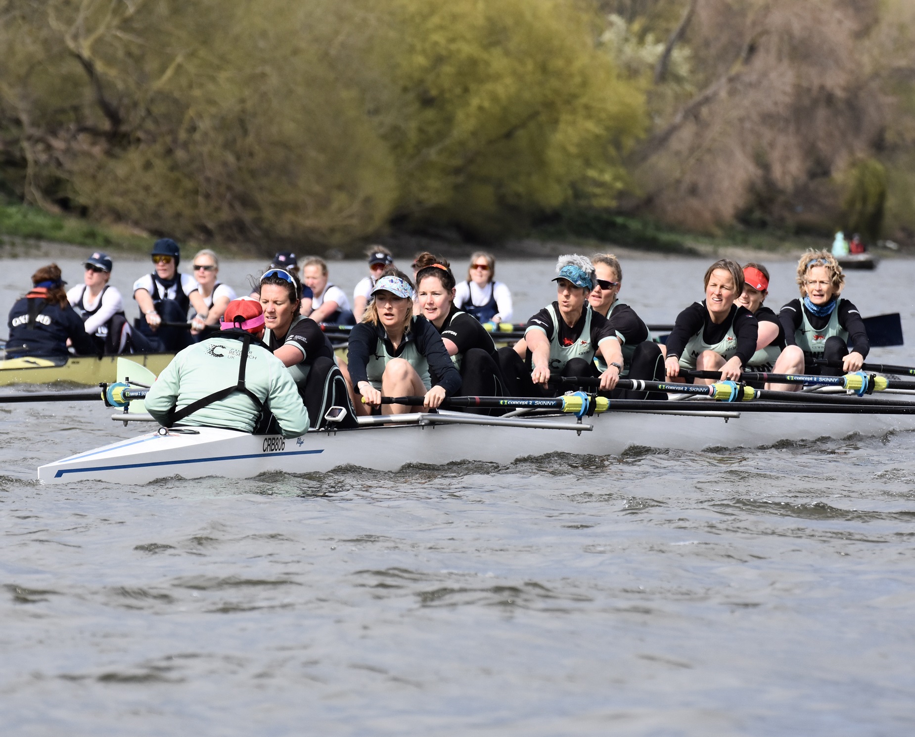 While the rules of the Vets’ Race demand a minimum age of 35 and an average of at least 42, the problems of COVID and of recruiting for a new event meant that the women agreed to be flexible on this. Thus, Cambridge was stroked by 24-year-old Sophie Paine, a youngster who only got her Blue last year – though the average age given in the programme was still 39. Oxford averaged five years older but did have 39-year-old double Olympic champion, Caryn Davies, at “7”.
