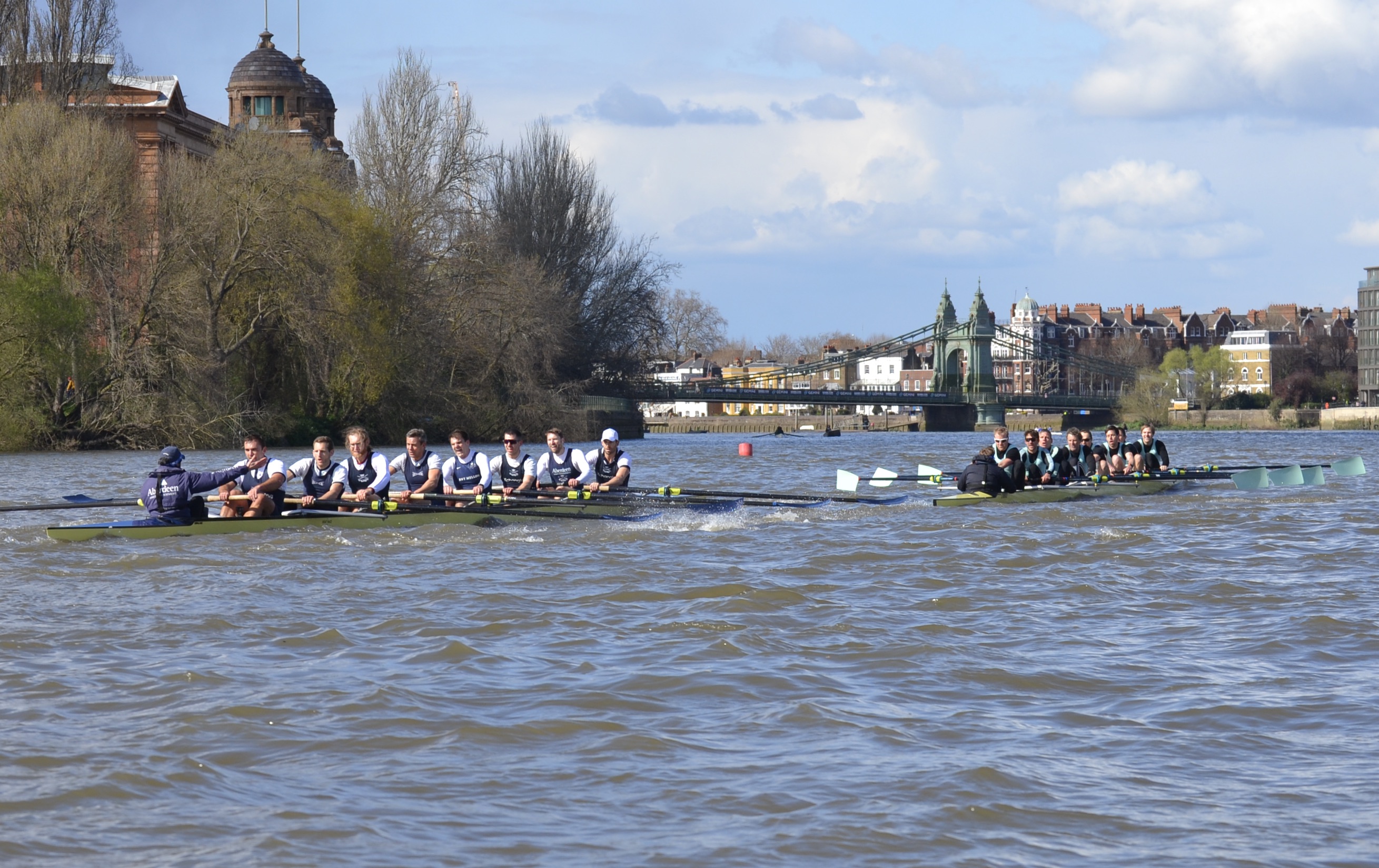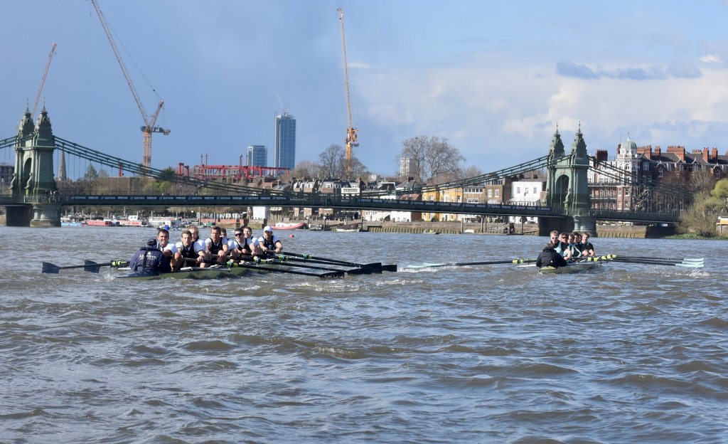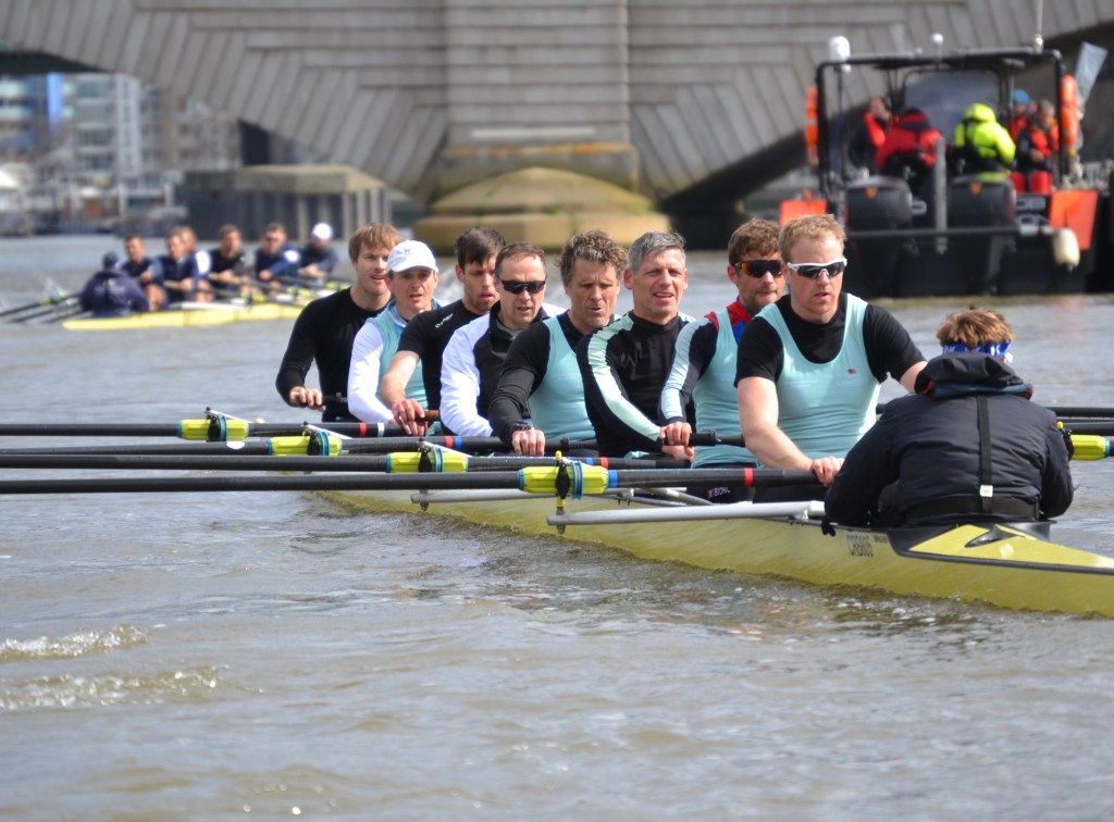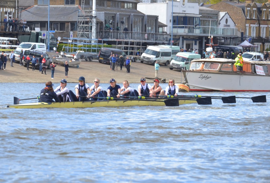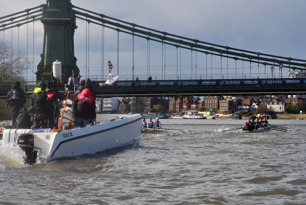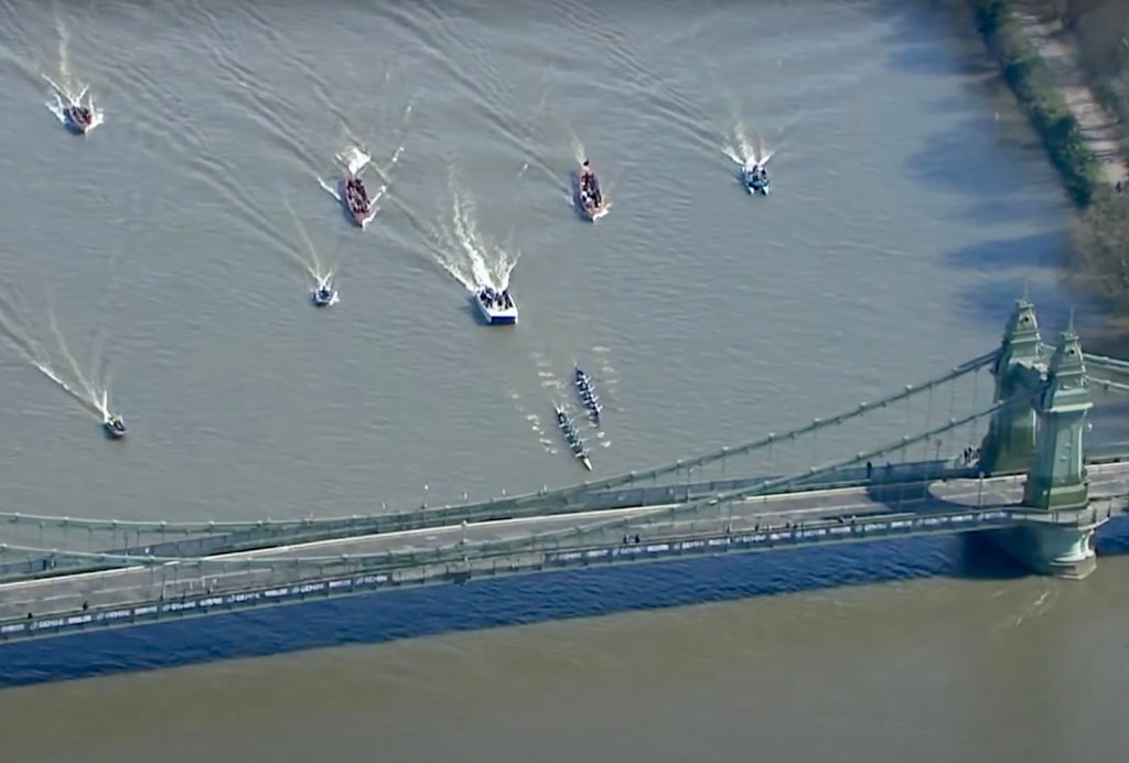 I was impressed with the Cambridge start, they got out to a 1/4 – 1/2 length pretty quickly and kept going right through… The Oxford crew looked tired and ragged and I thought that it was all over. But, before right Hammersmith Bridge, Cambridge seemed to hit a brick wall, they really slowed down, Oxford started coming through and I think that they knew that they had a chance. Then there was a big clash under the bridge (as Cambridge were being warned) and Cambridge were disqualified. The rules are quite clear, Oxford were coming through and Cambridge were not getting out of the way. It is fine if you are out of your water and leading but, if the other guys catch up, you’ve got to move – and Cambridge didn’t.