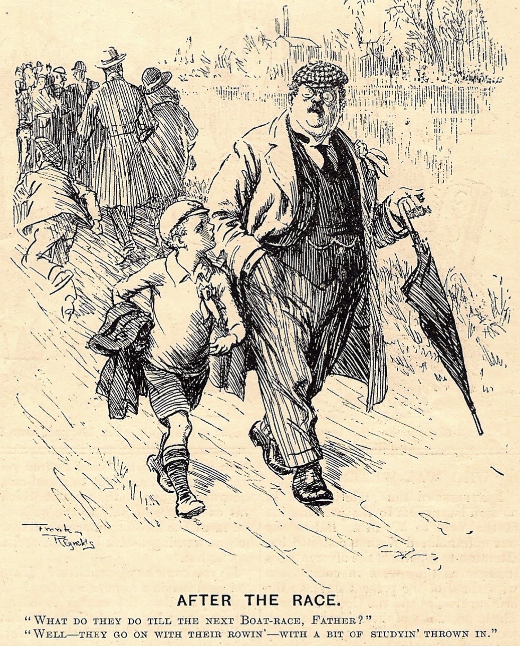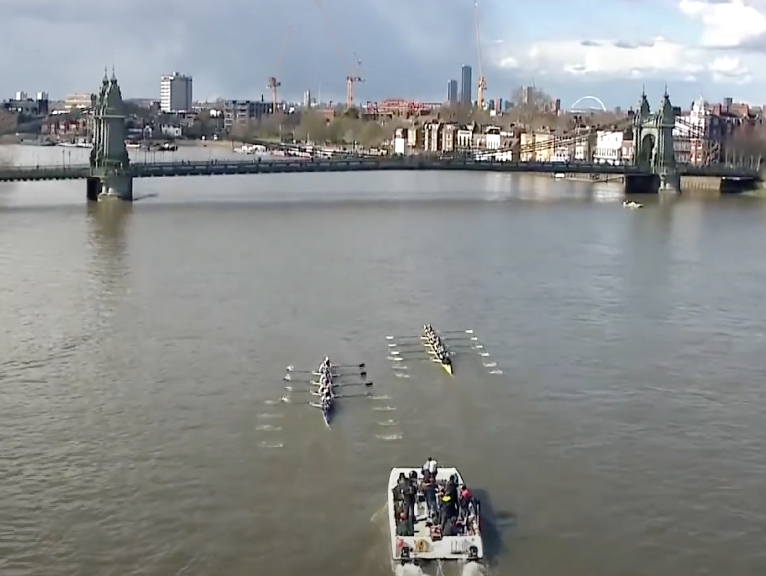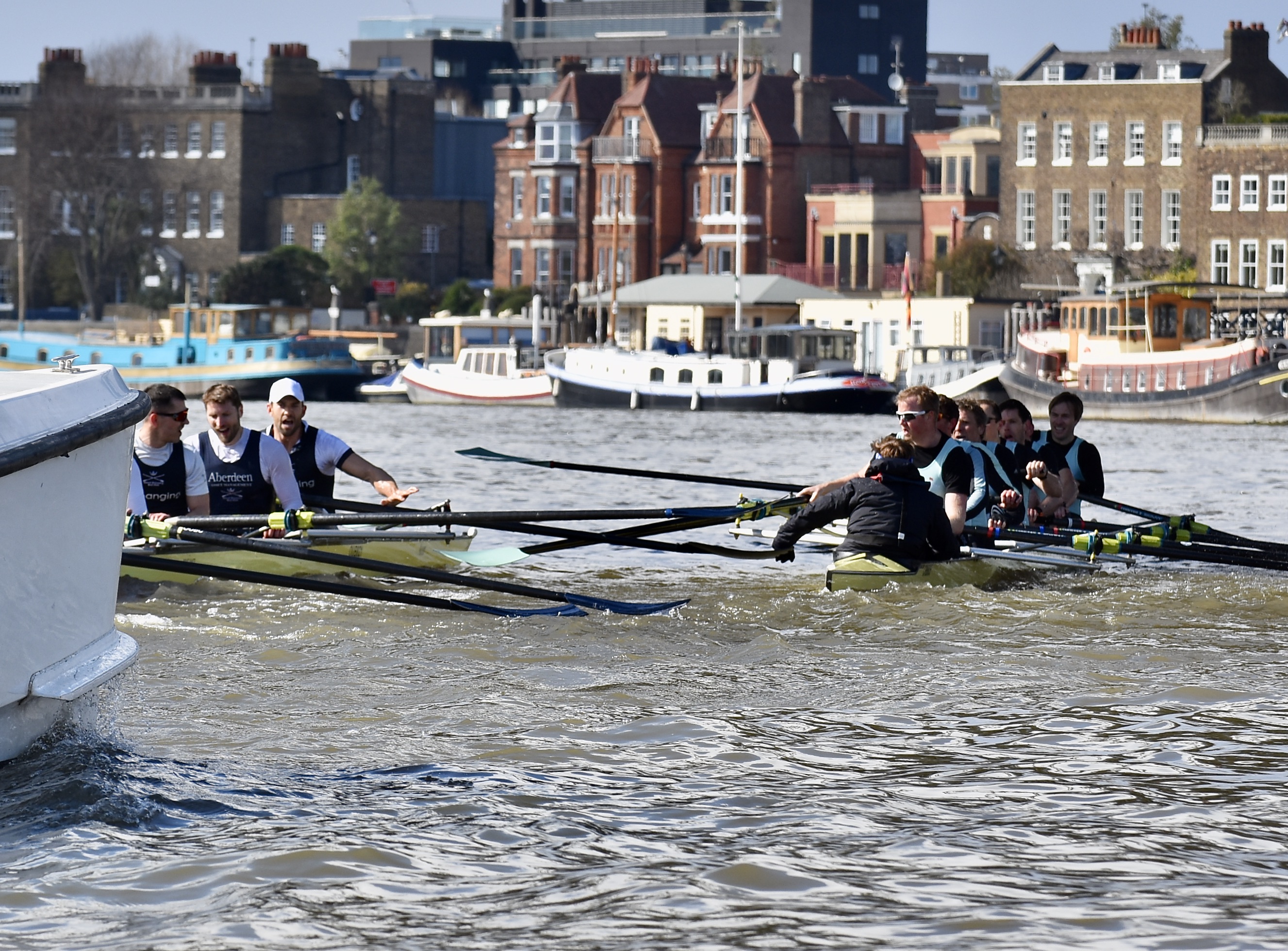 Approaching Hammersmith Bridge, the long-threatened disaster struck, Oxford bow Robin Ejsmond-Frey clashing with Cambridge stroke Fred Gill, after which the Oxford bow-ball got stuck under Cambridge’s riggers forcing a stoppage. Floating entangled under Hammersmith Bridge the crews eventually started rowing again, Cambridge crossing the line first only to be told by Pinsent that they were disqualified, since he had been warning them (for some time) when the collision happened.