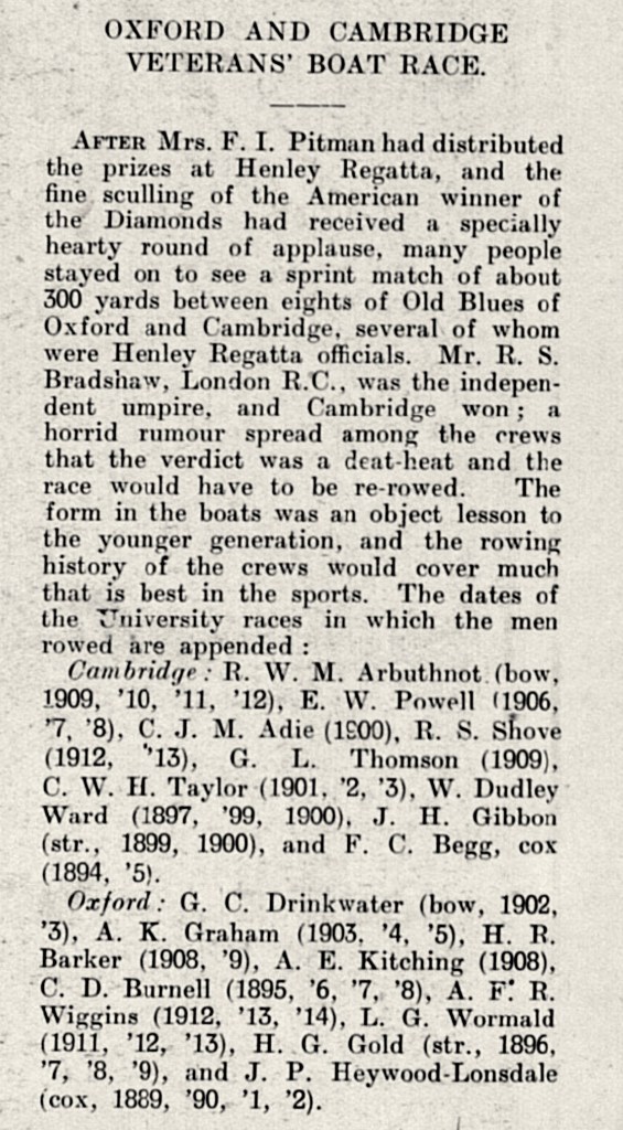 Despite their double loss, I have some good news for Cambridge. Officially, the score in the men’s veteran race is now Oxford 10, Cambridge 16. However, I have found that there was a 300-yard Oxford – Cambridge Vets race held at Henley immediately after the 1922 regatta. The Light Blues won and so could now put their score at 17. Also, this makes 2022 the Centenary Veteran’s Race, albeit with a break of 75-years between the first and second contests. However, there was also a break (of seven years) between the first and second Boat Races, 1829 and 1836.