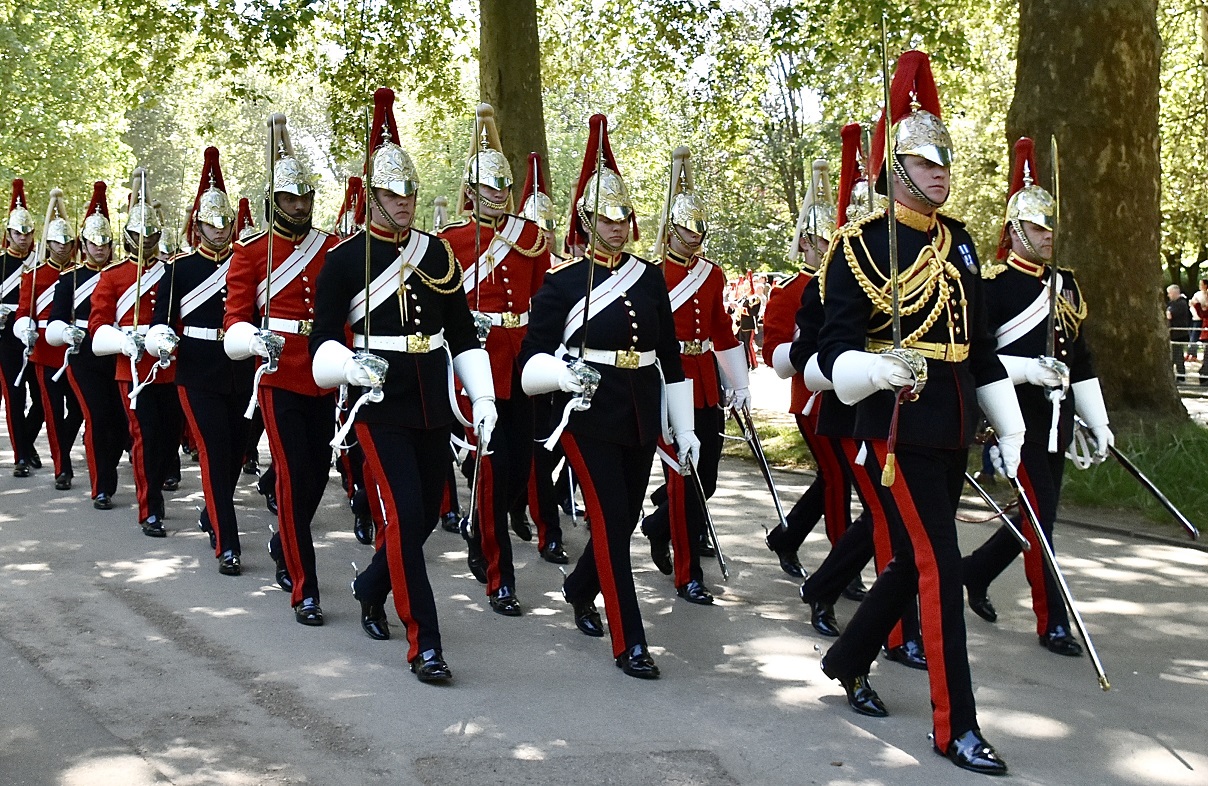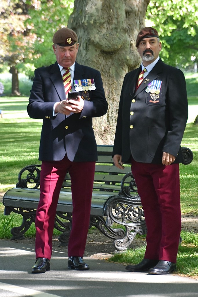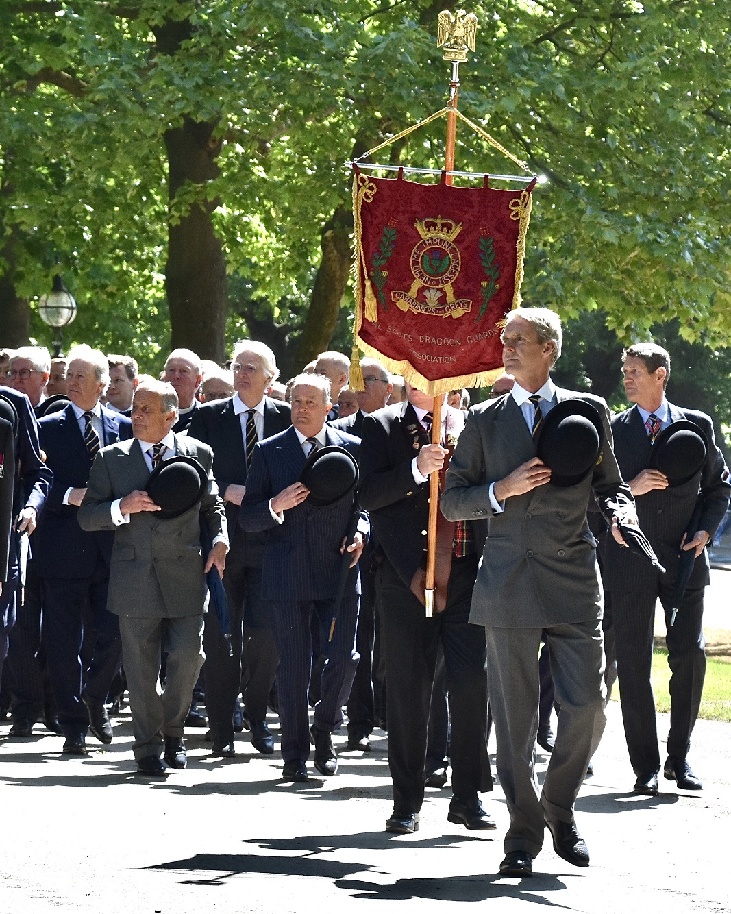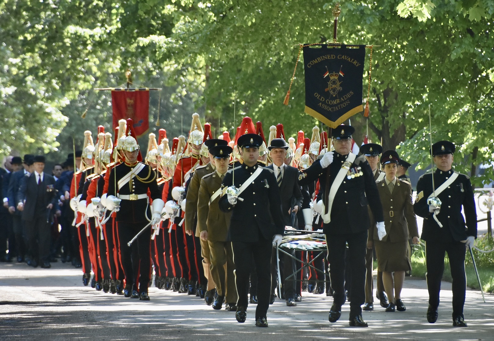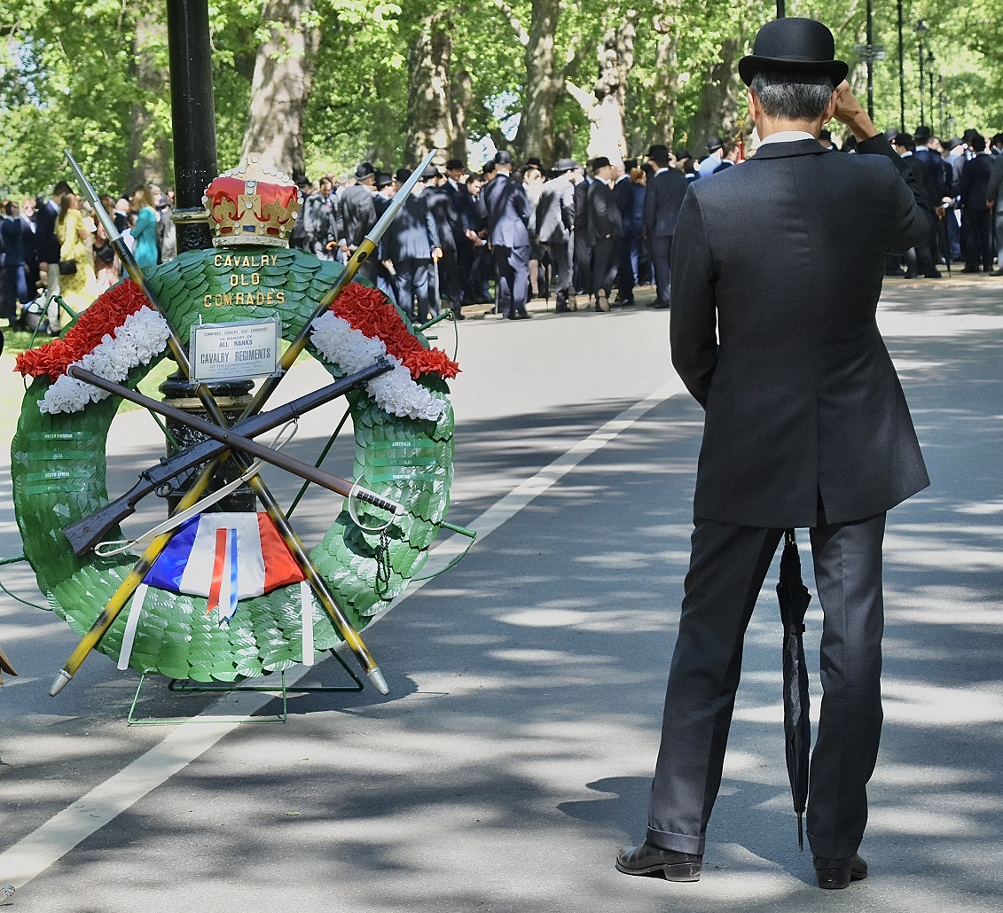 It was a warm and sunny day and Hyde Park’s Broad Walk with its long archway of shady trees was the perfect gathering spot. The order for those marching was “RV at your Regimental Standard by 1045hrs”.The King’s Royal Hussars are easily identifiable by their brown berets and crimson trousers. Prince Albert’s personal livery was crimson, and he granted permission for the 11th Light Dragoons to wear overalls in that colour after they escorted him to his marriage with Queen Victoria. Not exactly The Charge of the Light Brigade but an interesting honour nonetheless.Old soldiers, old jokes? A Chelsea Pensioner and a member of the Queen’s Royal Lancers.The gentleman on the centre is wearing a Brigade of Guards tie, the regimental tie of both the Foot Guards and the Household Cavalry. The medal on his right is the Royal Victorian Order which recognises “distinguished personal service to the monarch”.It is always interesting to see how women interpret what the female version of a suit and tie is. On the left, the tie is Light Dragoons and the medal is from the UN, awarded in recognition of the United Nations Multidimensional Integrated Stabilisation Mission in Mali. The woman on the right is wearing the Operational Service Medal for Iraq and Syria. Her lapel badge is probably that of the Queen’s Royal Hussars.They seem terribly young, but I imagine that these boys are currently serving. The two on the left are wearing the Light Dragoons tie. On the sartorial front, they may have tried their best and this probably passes muster amongst their contemporaries. I suppose that I should not be too churlish as at some future point they may put themselves in harm’s way on our behalf.Men of the Life Guards at their “RV Point.”Two troopers of the Life Guards, the senior regiment of the British Army. For some reason, probably forgotten, they wear their chin strap below their lower lip, as opposed to the other regiment of the Household Cavalry, the Blues and Royals, who wear it under their chin. The Cavalry Memorial or The Cavalry of the Empire Memorial shows England’s patron saint, St George, on horseback standing victorious over a slain dragon. Incongruously, the dying beast has an upturned Germanic moustache.The Salute was taken by HRH Prince Edward, Earl of Wessex, Royal Honorary Colonel of the Royal Wessex Yeomanry. Also pictured here are representatives of the armed forces of Australia, Canada and India.The parade was led by uniformed members of this year’s organising regiment, The Royal Wessex Yeomanry, carrying the standard of the Combined Cavalry Old Comrades followed by the Comrades’ wreath. Wearing the bowler hat is the Parade Commander, Colonel The Lord De Mauley.Serving members of the Household Cavalry, the Life Guards (white plumes) and Blues and Royals (red plumes). Amongst other duties, they act as the Queen’s personal bodyguard.