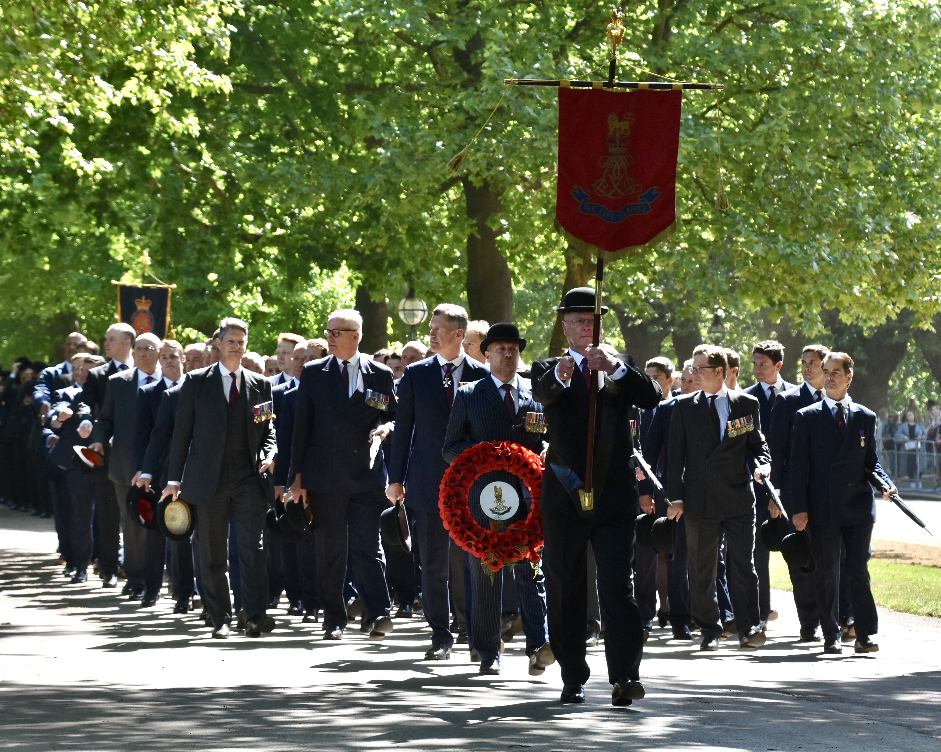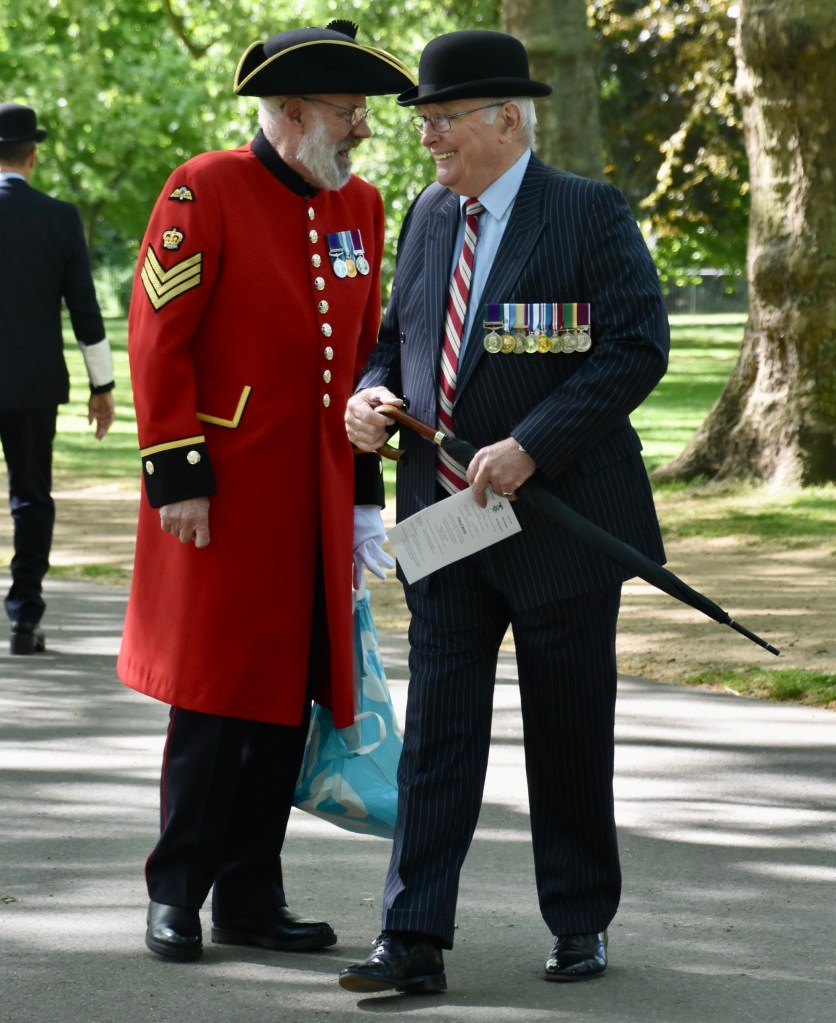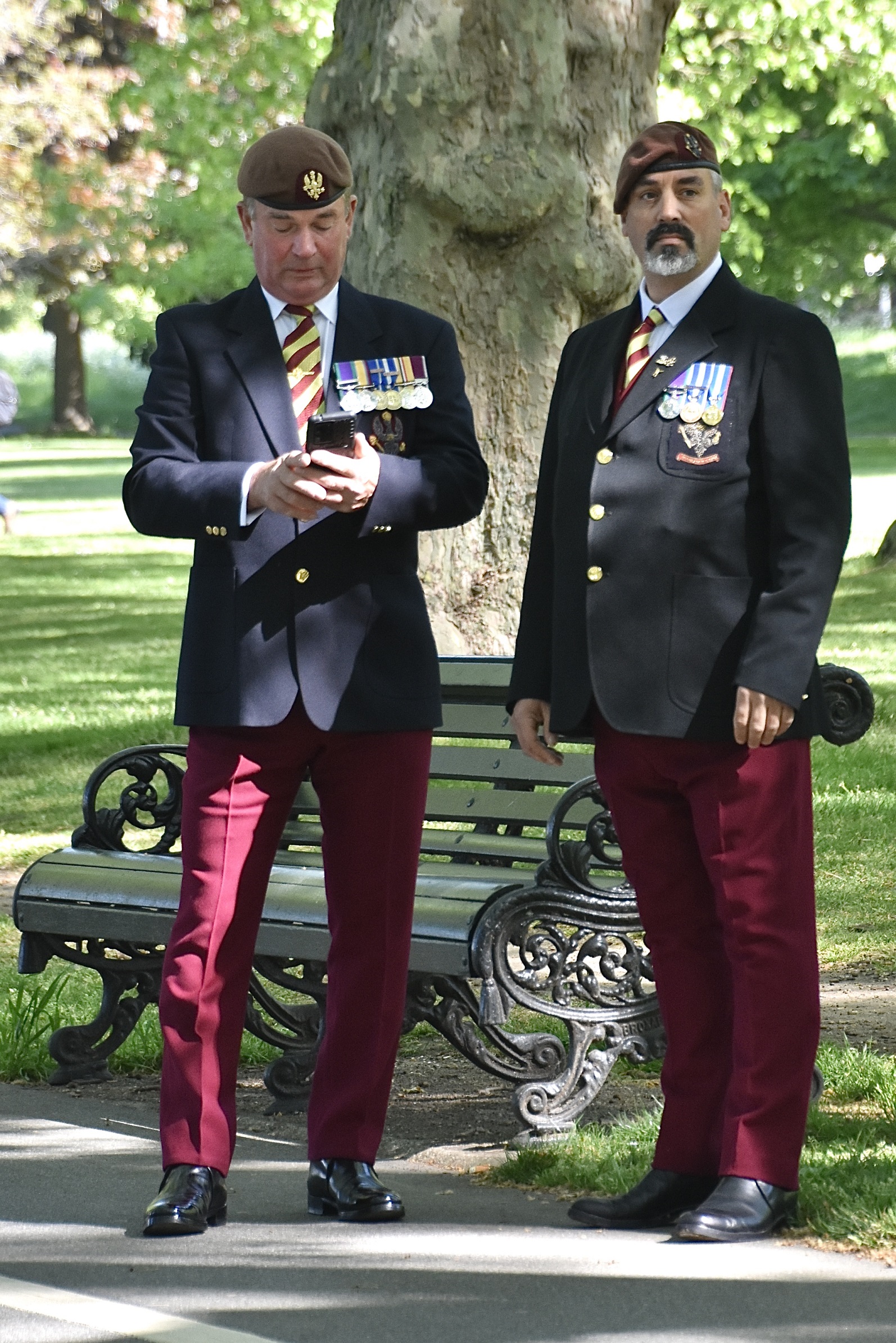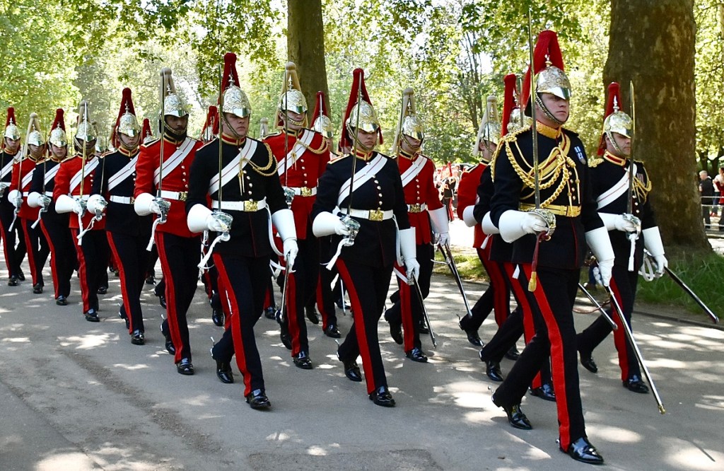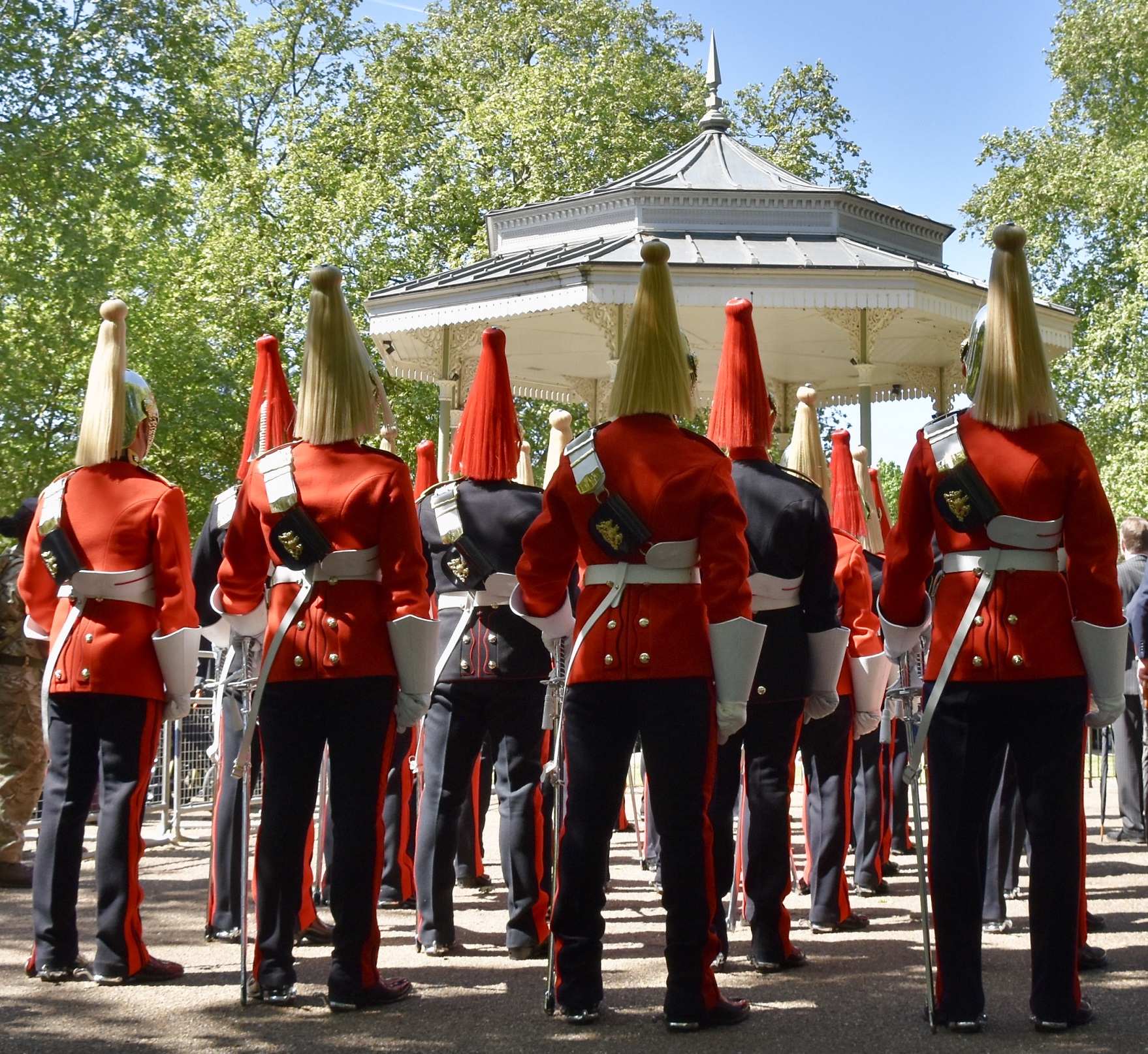 It was a warm and sunny day and Hyde Park’s Broad Walk with its long archway of shady trees was the perfect gathering spot. The order for those marching was “RV at your Regimental Standard by 1045hrs”.The King’s Royal Hussars are easily identifiable by their brown berets and crimson trousers. Prince Albert’s personal livery was crimson, and he granted permission for the 11th Light Dragoons to wear overalls in that colour after they escorted him to his marriage with Queen Victoria. Not exactly The Charge of the Light Brigade but an interesting honour nonetheless.Old soldiers, old jokes? A Chelsea Pensioner and a member of the Queen’s Royal Lancers.The gentleman on the centre is wearing a Brigade of Guards tie, the regimental tie of both the Foot Guards and the Household Cavalry. The medal on his right is the Royal Victorian Order which recognises “distinguished personal service to the monarch”.It is always interesting to see how women interpret what the female version of a suit and tie is. On the left, the tie is Light Dragoons and the medal is from the UN, awarded in recognition of the United Nations Multidimensional Integrated Stabilisation Mission in Mali. The woman on the right is wearing the Operational Service Medal for Iraq and Syria. Her lapel badge is probably that of the Queen’s Royal Hussars.They seem terribly young, but I imagine that these boys are currently serving. The two on the left are wearing the Light Dragoons tie. On the sartorial front, they may have tried their best and this probably passes muster amongst their contemporaries. I suppose that I should not be too churlish as at some future point they may put themselves in harm’s way on our behalf.Men of the Life Guards at their “RV Point.”Two troopers of the Life Guards, the senior regiment of the British Army. For some reason, probably forgotten, they wear their chin strap below their lower lip, as opposed to the other regiment of the Household Cavalry, the Blues and Royals, who wear it under their chin. The Cavalry Memorial or The Cavalry of the Empire Memorial shows England’s patron saint, St George, on horseback standing victorious over a slain dragon. Incongruously, the dying beast has an upturned Germanic moustache.The Salute was taken by HRH Prince Edward, Earl of Wessex, Royal Honorary Colonel of the Royal Wessex Yeomanry. Also pictured here are representatives of the armed forces of Australia, Canada and India.The parade was led by uniformed members of this year’s organising regiment, The Royal Wessex Yeomanry, carrying the standard of the Combined Cavalry Old Comrades followed by the Comrades’ wreath. Wearing the bowler hat is the Parade Commander, Colonel The Lord De Mauley.Serving members of the Household Cavalry, the Life Guards (white plumes) and Blues and Royals (red plumes). Amongst other duties, they act as the Queen’s personal bodyguard.