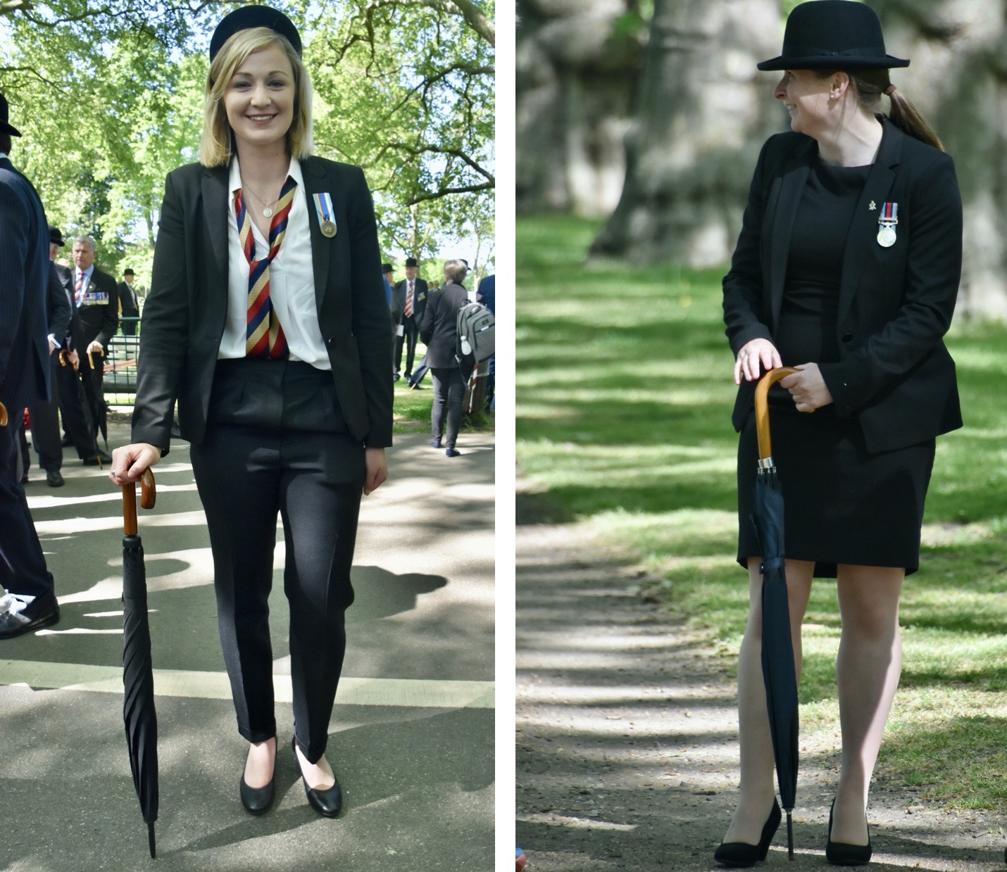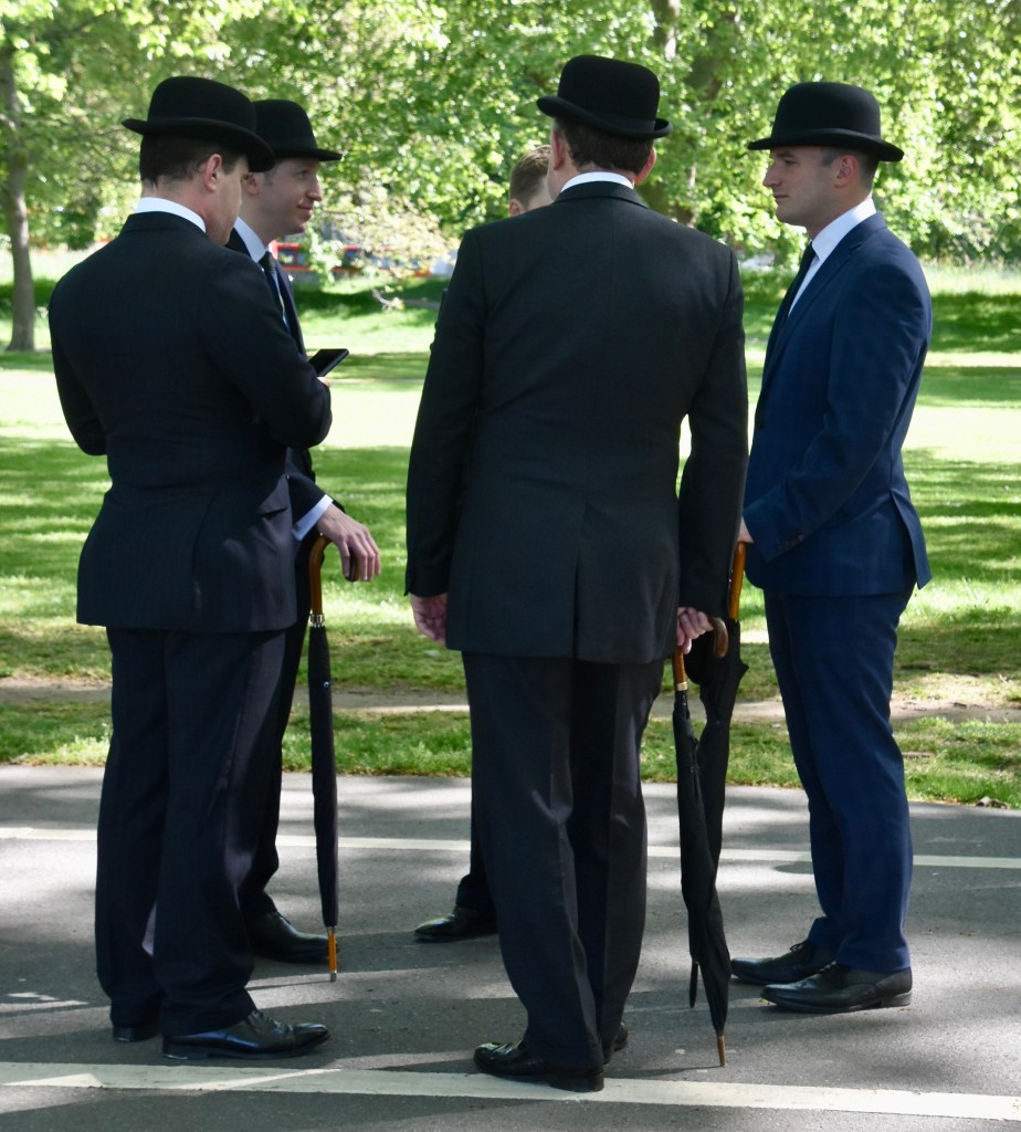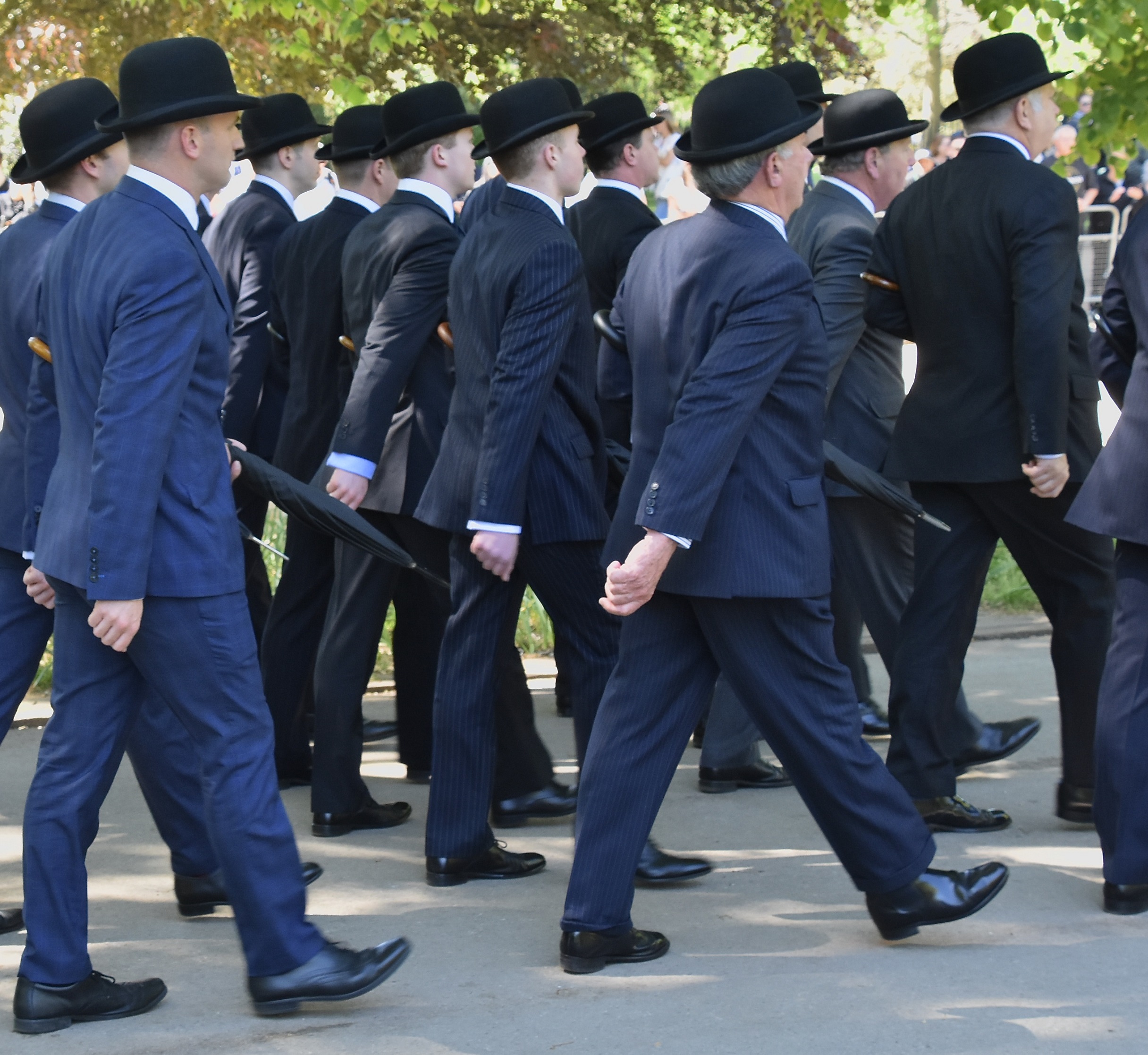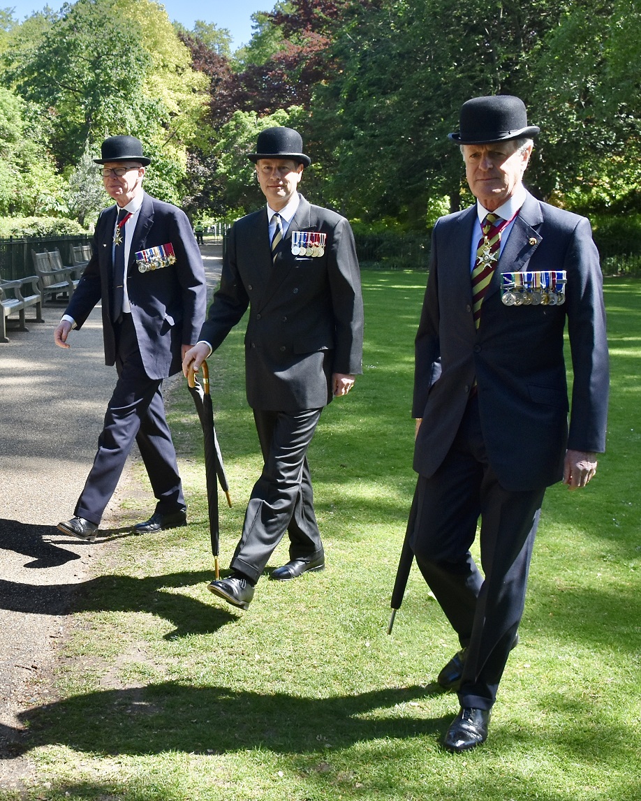 “The traditional dress of bowler hat, suit and tie, while carrying a furled umbrella was the accepted walking out dress in 1920s London when the annual parade started… Although now a stereotype of the English gentleman, the bowler hat was what the working classes wore in the 19th century and was the hat of choice for working horsemen, like our cavalrymen today. (Unlike a top hat) not only does it afford protection from low lying branches but does not blow off in the wind. The umbrellas are carried not in case of rain but carried in place of a sword or pace stick. (When the late Queen Mother) took the Salute on a particularly wet parade she insisted the umbrellas remained firmly furled as a reminder to all that these were soldiers marching”.