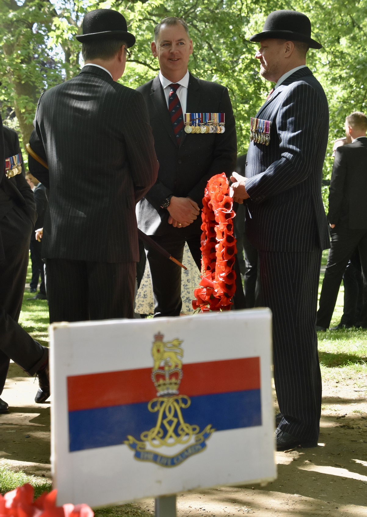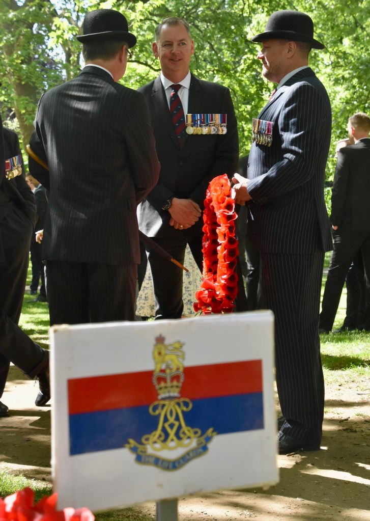 The wreath depicted is of the Combined Cavalry Old Comrades Association and is laid at the Cavalry Memorial in London’s Hyde Park every year on “Cavalry Sunday”. On the right is a Cavalryman (who may or may not be currently serving) in the traditional dress for the occasion, lounge suit with bowler hat and furled umbrella.