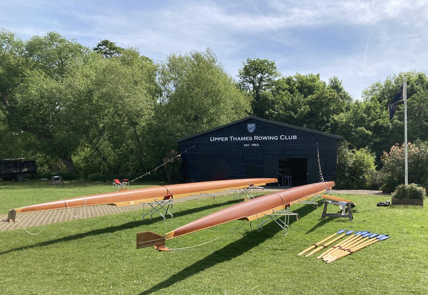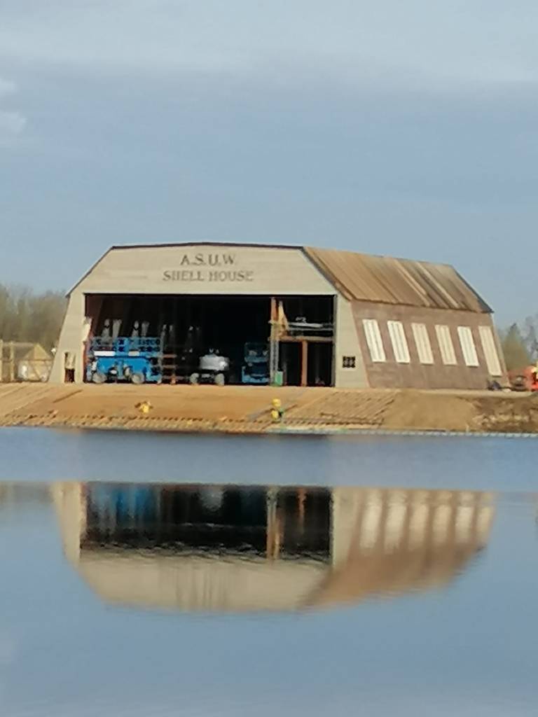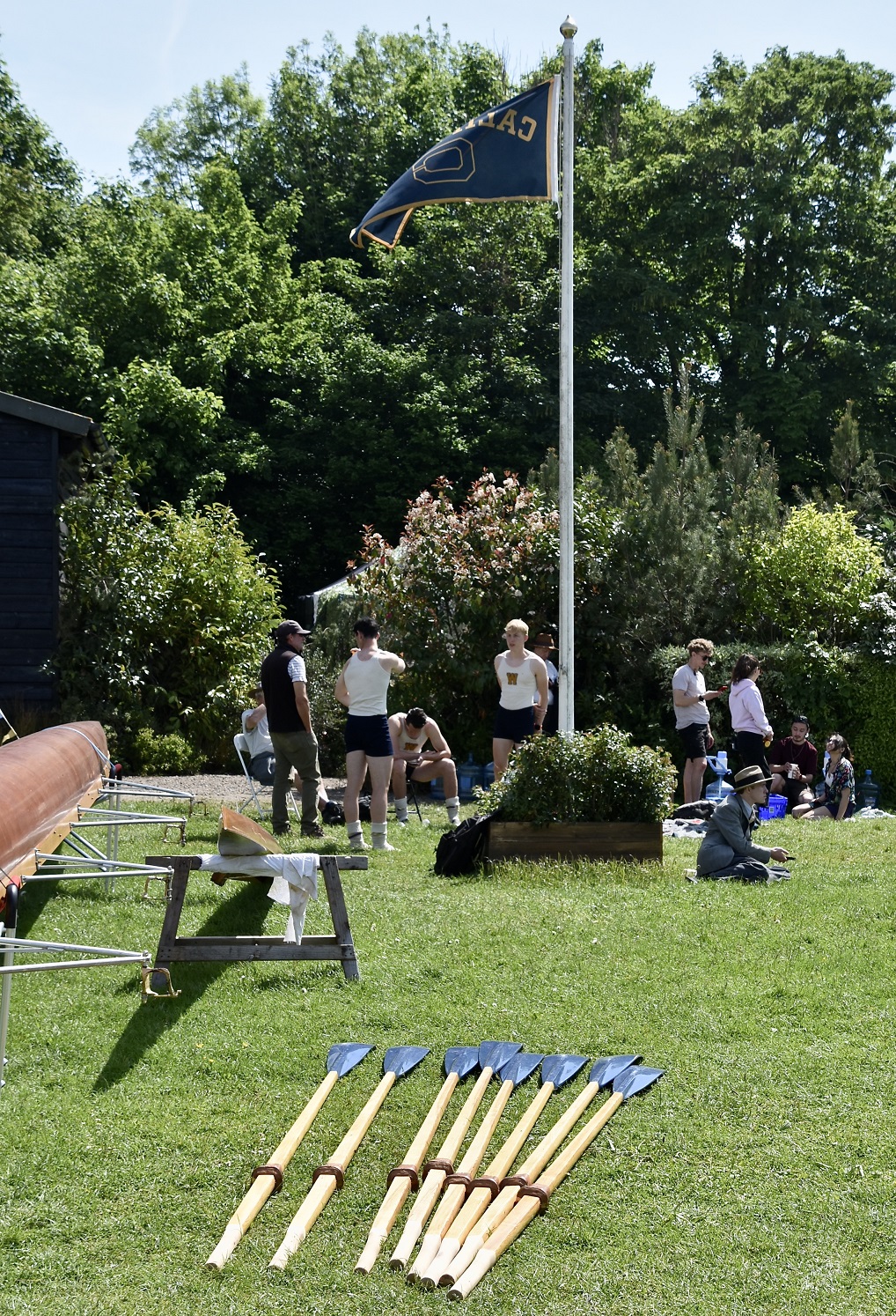 I understand that the “new” shellhouse is an exact replica of the original, both inside and out. The Gloucestershire Live website reveals that it is sited at Cleveland Lakes near South Cerney in Gloucestershire. A Callum Turner fan Twitter account, @calupdates, has eight pictures taken on 6 May showing filming at this location. The final three pictures in the second batch of photos indicate that the actors have learned to row convincingly.