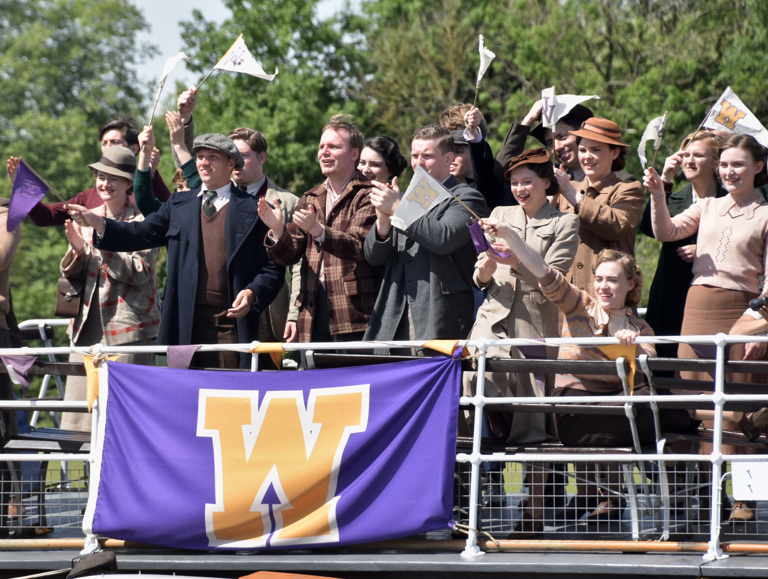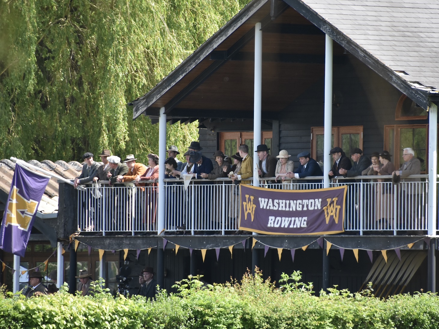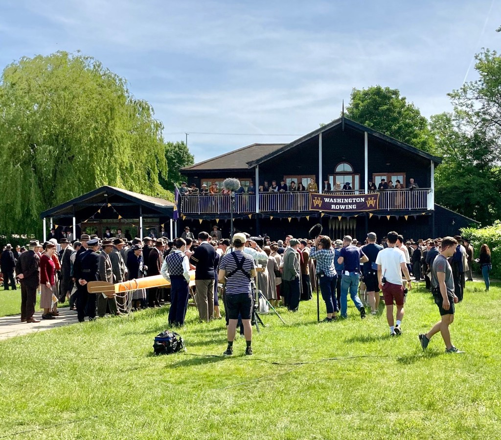 On 16 May, Henley-on-Thames temporarily became Georgetown when the whole film production circus moved there for a week. Part of the Henley Regatta course outside Upper Thames Rowing Club was to stand in for Seattle’s Lake Washington where, in April 1936, the Boys had their first real test at the Pacific Coast Regatta. The University of Washington Freshmen, Junior Varsity and Varsity all won, beating University of California crews. “Cal” had produced the winning US Olympic eight in both 1928 and 1932 so it was the start of the Boys’ journey to the Berlin Olympic Regatta.
