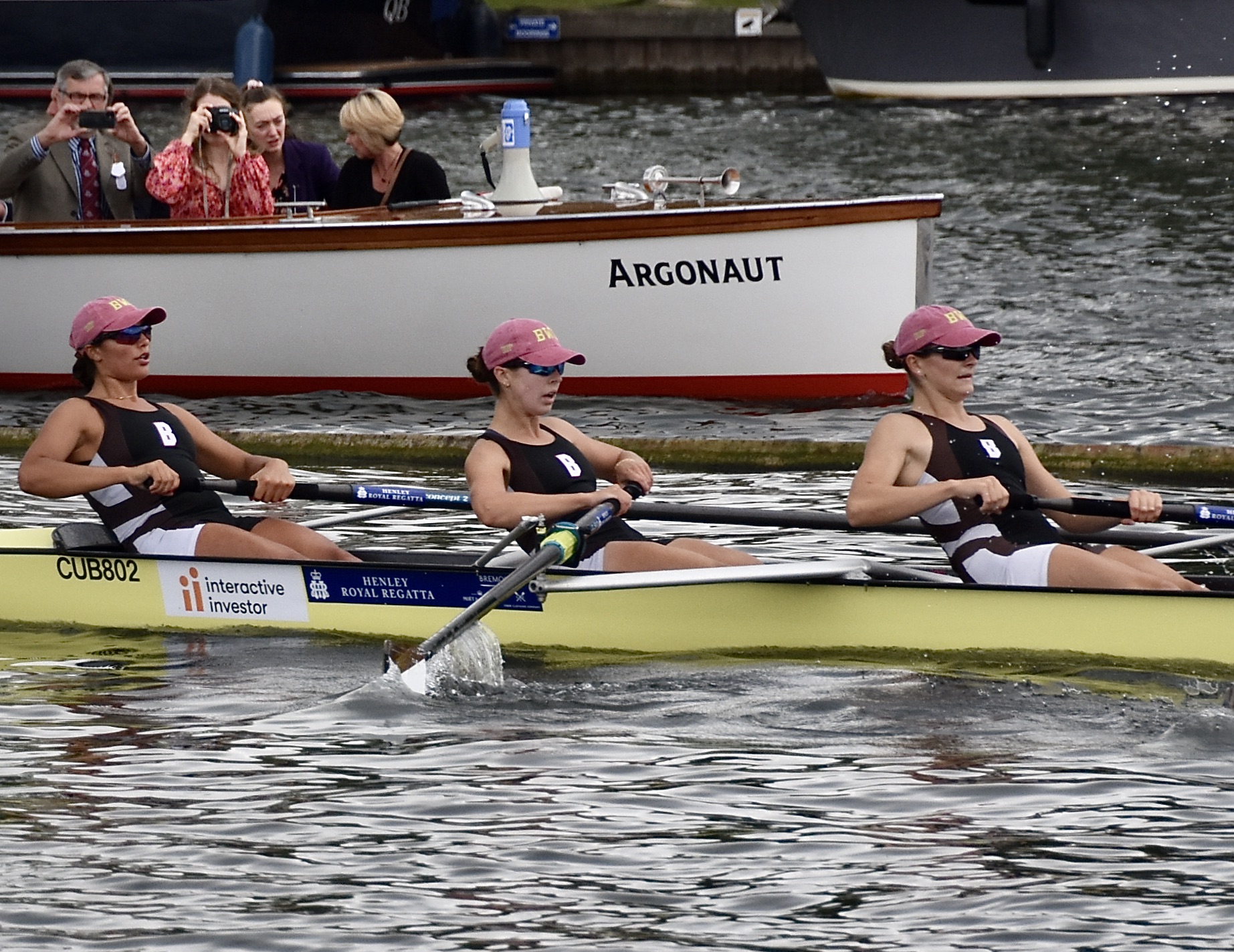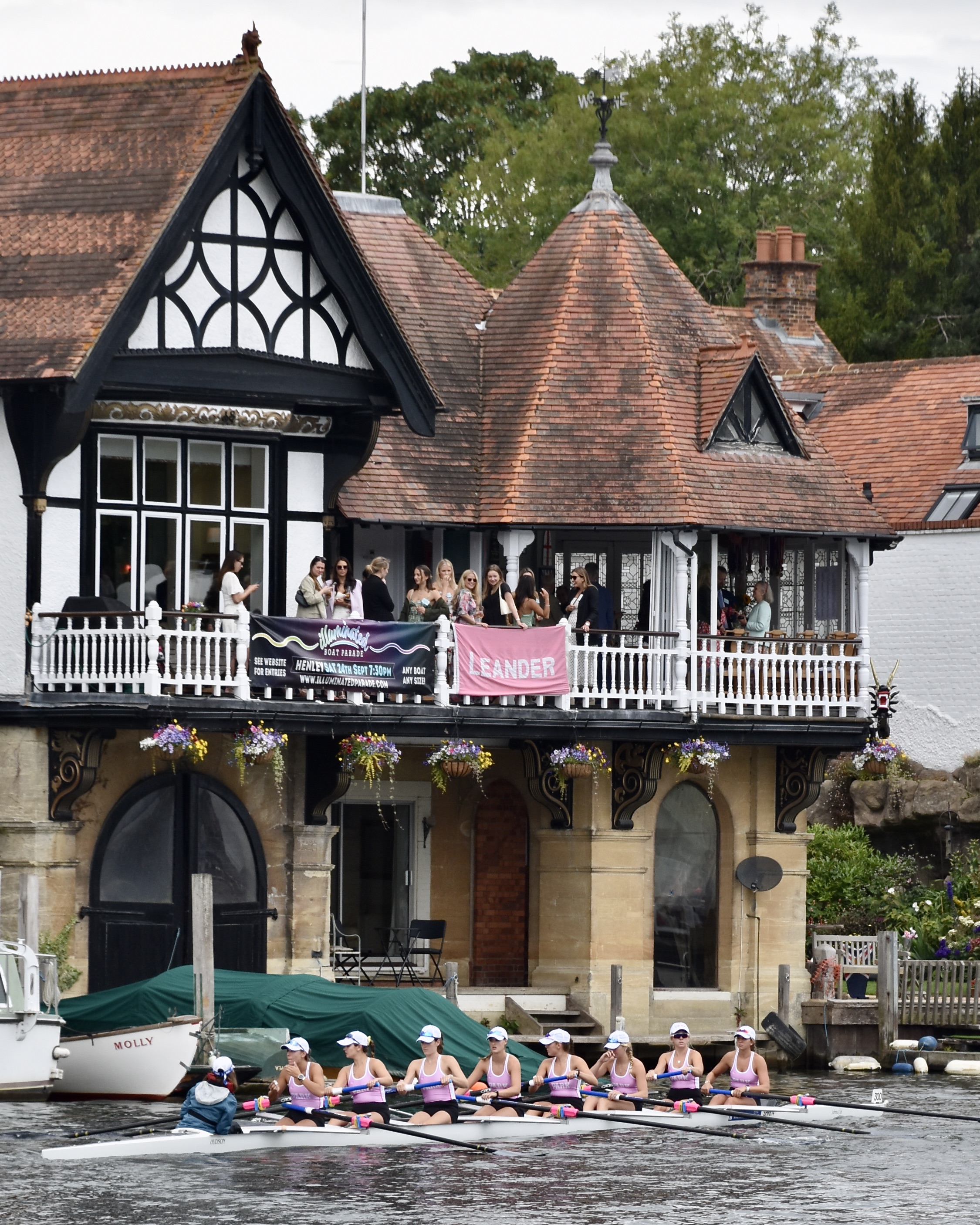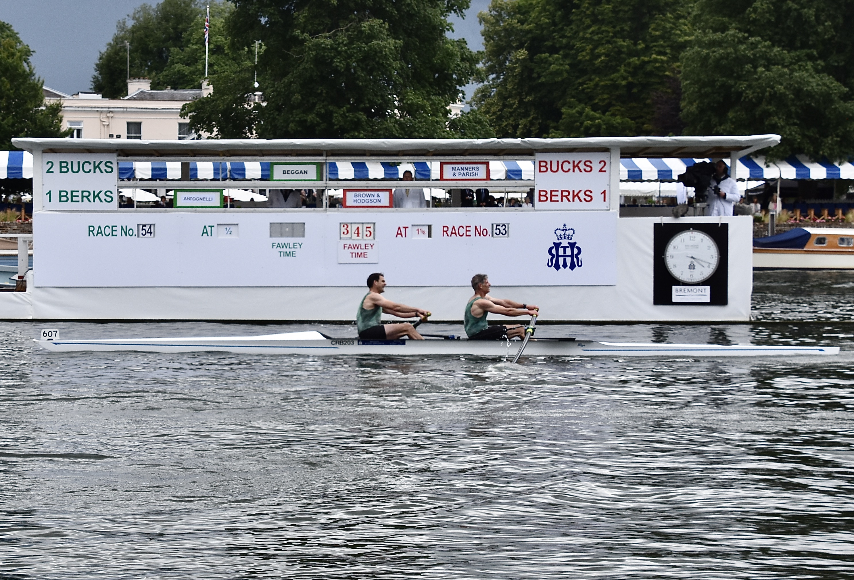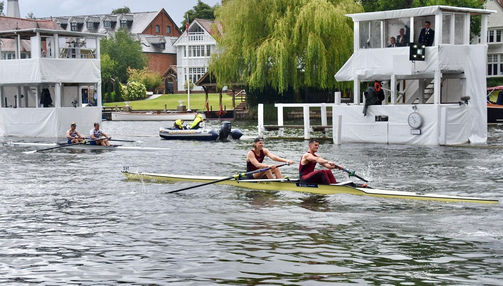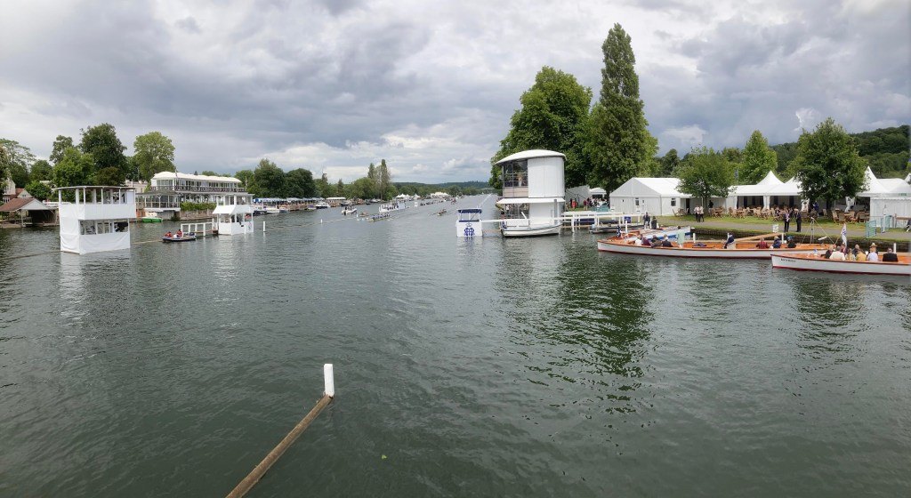 The course seen from the press box.Münchener Ruder-Club who beat City of Bristol in a heat of the Thames, go through Henley Bridge.City of Bristol in recovery.Upstream of Henley Bridge away from the course, crews can warm up, warm down and practice. Old school double sculls.Headington School, last year’s inaugural winners of the Prince Philip Challenge Trophy Junior Women’s Eights). Last minute words to the Headington crew.Winter Park from Florida came through the Qualifying Races and on Thursday knocked Headington out of the Prince Philip.Davidson of California Rowing Club, USA, beating Zawojski of Akademicki Zwiazek Sportowy Akademia Wychowania Fizycznego Warszawa, Poland, in the Diamonds (Open Men’s Single Sculls). Davison has talked about an American not having won the Diamonds for 17 years – all he has to do is get past Oliver Zeidler.Zeidler of Frankfurter Rudergesellschaft Germania 1869 e.V., Germany, beating Young of Cambridge ’99 Rowing Club in the Diamonds (Open Men’s Single Sculls). Oliver Zeidler, the 6ft 8in European and World Champion.Another view of Zeidler to worry Davidson.Kohler of the Texas Rowing Center pictured while beating Kennedy of Cambridge University in the Princess Royal (Open Women’s Single Sculls).Brown University, USA, have an unusually long layback but still used it to beat Newcastle University in the Island (Student Women’s Eights).Newcastle chasing Brown in the Island.At 3.30, there was a heavy downpour of rain. The continuance of racing was in doubt for a time when there was a distant flash of lightning. However, no more followed and the planned programme was kept to.Shelter is at a premium in Stewards’ when it rains.Rain does not stop play. Leander (left) race Brown University, USA, in the Princess Grace (Open Women’s Quad Sculls).Aitchison and Cracknell of Itchen Imperial Rowing Club beat Bell and Nesom of Oxford Brookes University in the Silver Goblets (Open Men’s Pairs).
