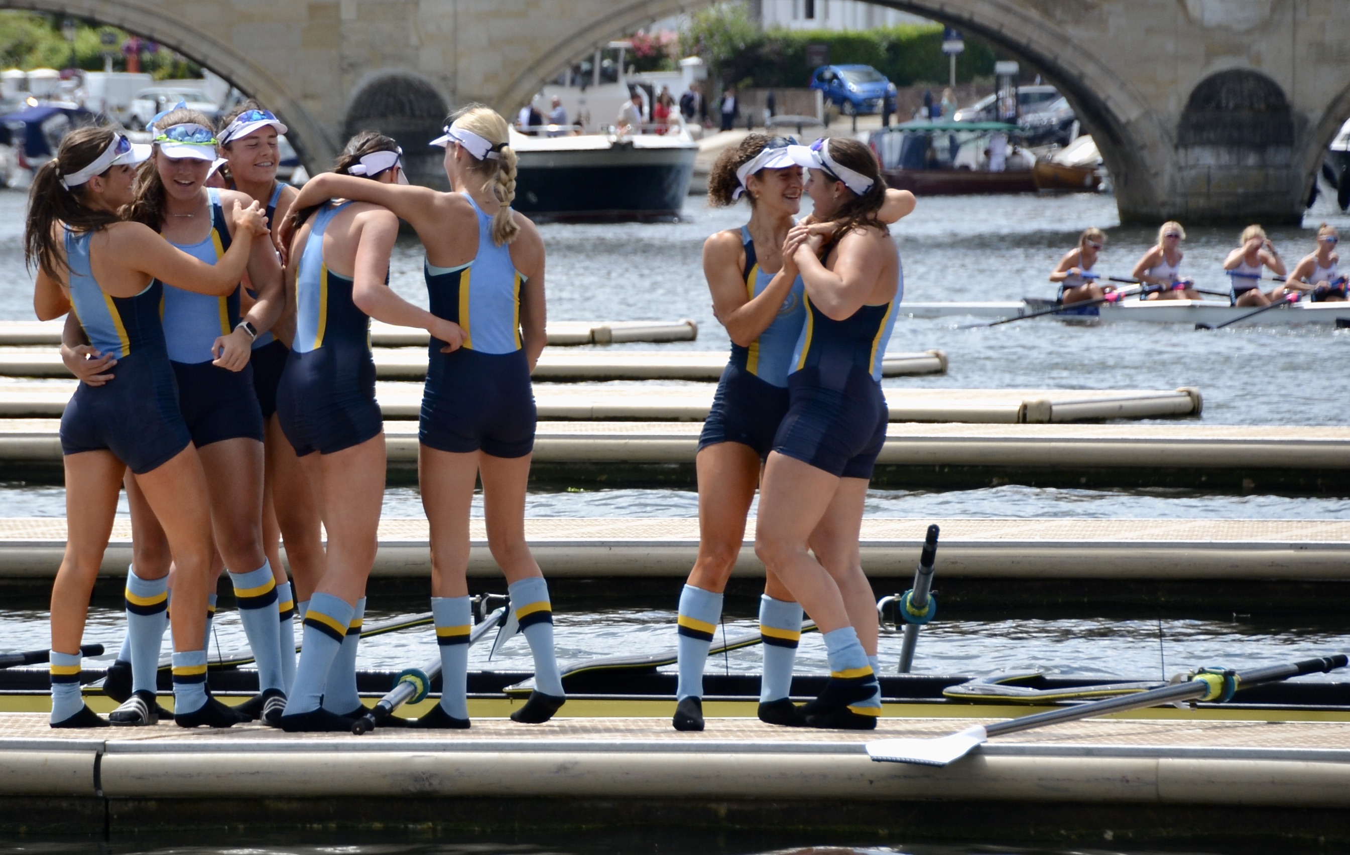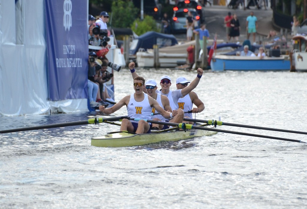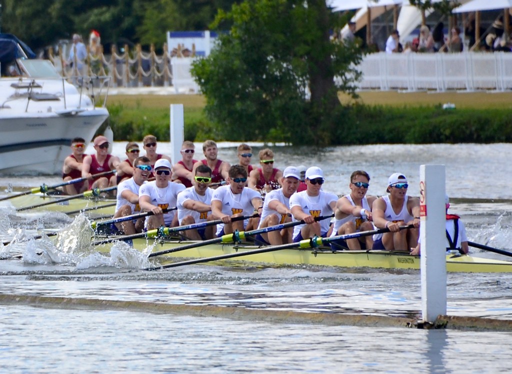 The UW Huskies gave their huge Henley team (they brought nine crews to this year’s Regatta) something to cheer about by winning another nail biter in The Visitors’ Challenge Cup and setting a new Course record of 6:26.
