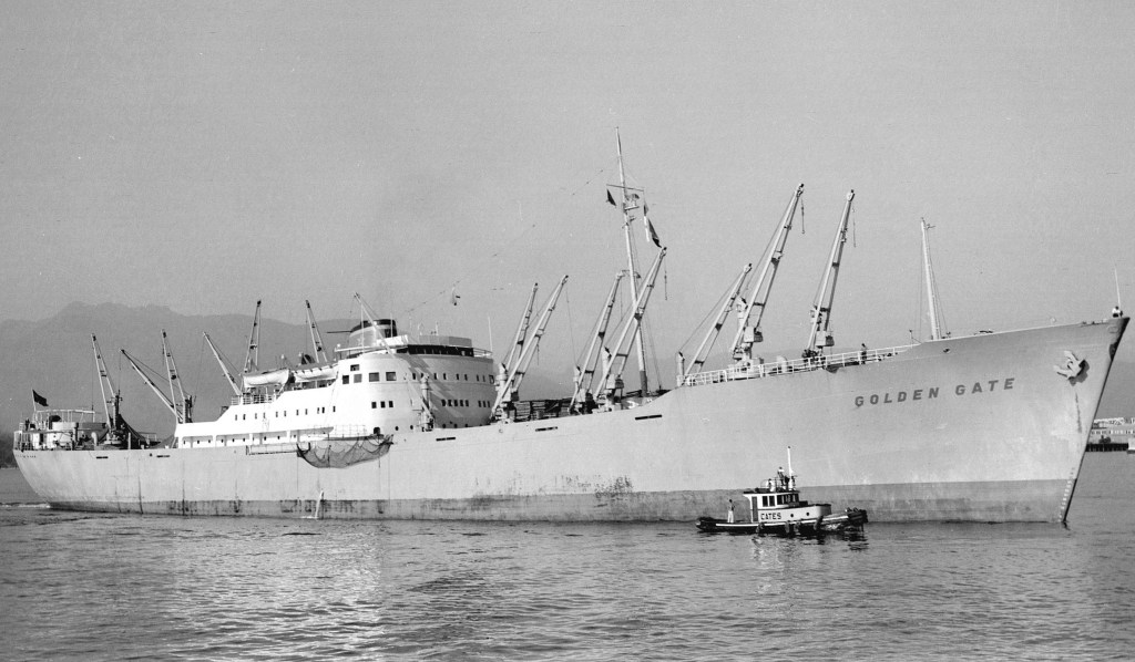 Thus, the Pococks’ steamship adventure began on 1 June 1952 aboard the refrigerated freighter M.S. Golden Gate under the command of Captain Gunnar Dahlquist. They sailed from Seattle up the Columbia River to Longview to pick up a load of timber bound for Hamburg. They continued south to San Francisco. ‘Life on board for the first five days was like having your own yacht with plenty of help,’ wrote George in his memoir. ‘Even better, you had no responsibility. Crossing the Columbia River bar was an experience in a rolling and pitching ship.’