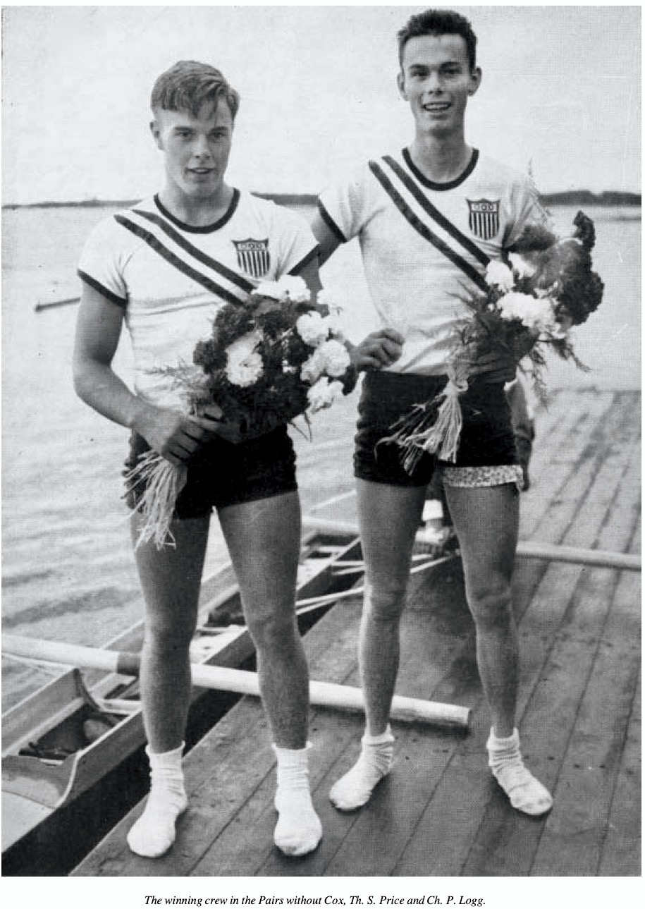 The American pair also won gold, to George’s prediction. Chuck Logg (6ft 5in) and Tom Price (5ft 11in) from Rutgers, trained without a rudder. George wrote in his memories: ‘Dad reckoned that a boat without a rudder would beat one with (a rudder) by at least two lengths. Chuck and Tom could row down the course as straight as a string. If they had had a rudder it would be only human nature for Chuck to use it against Tom for the last 1000 metres to hold him, and they would have lost.’
