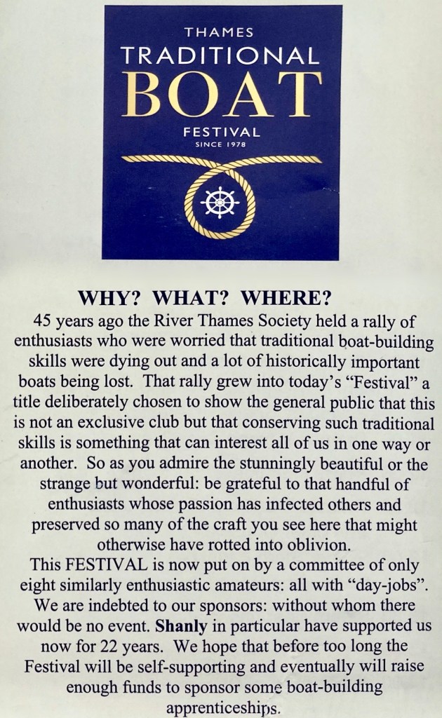 The three-day programme. The original boat-centred festival has expanded to include other non-aquatic British fascinations including dogs, veteran cars and militaria.The skiff dock was the base for oar-powered craft.As this extract from the programme explains, the TTBF is a labour of love by a small group of enthusiastic amateurs (“all with day-jobs”) who are motivated by altruism, not profit.