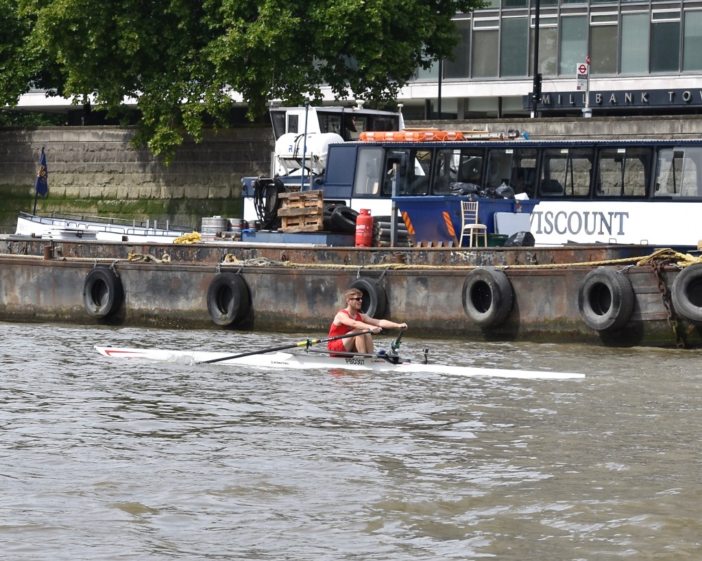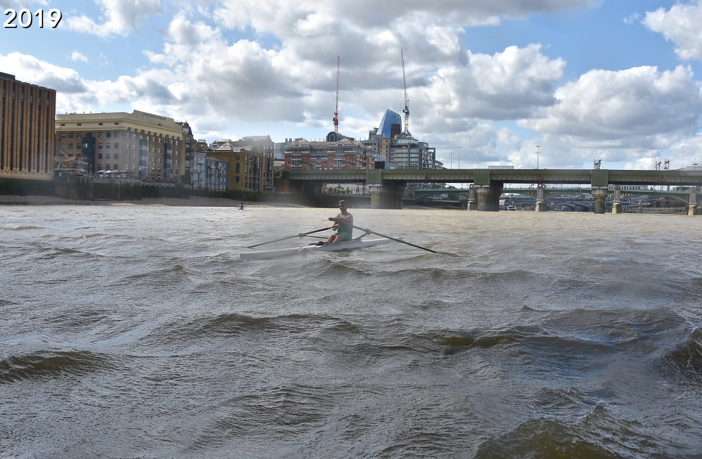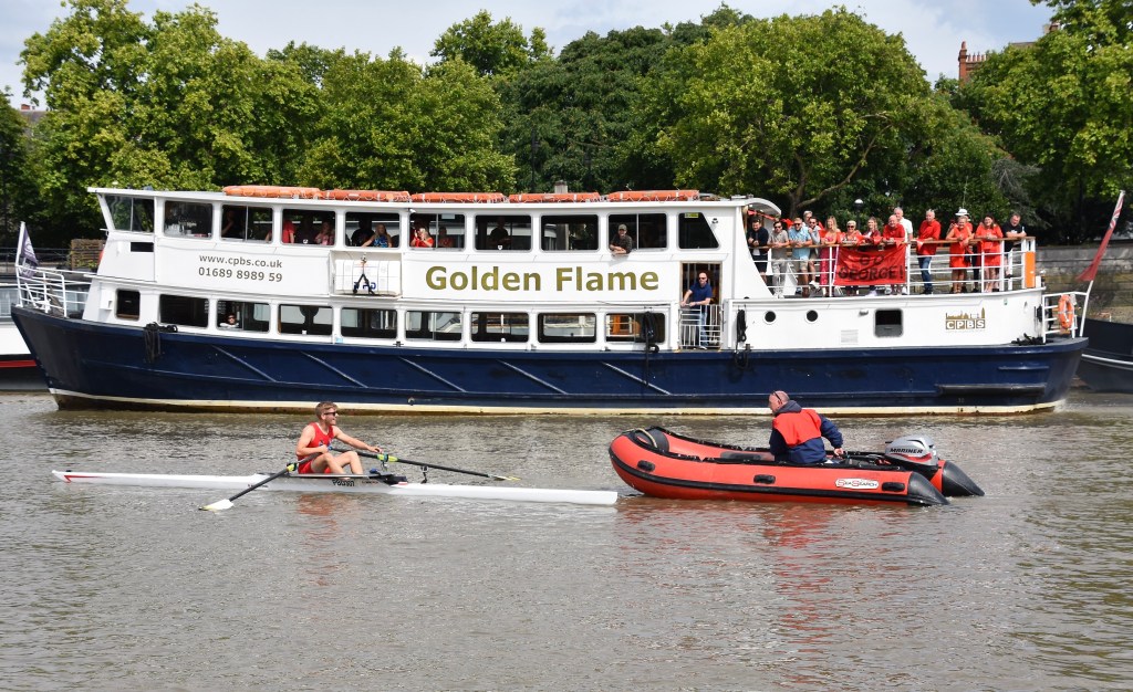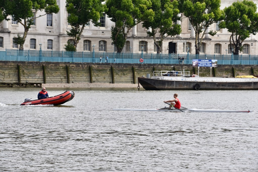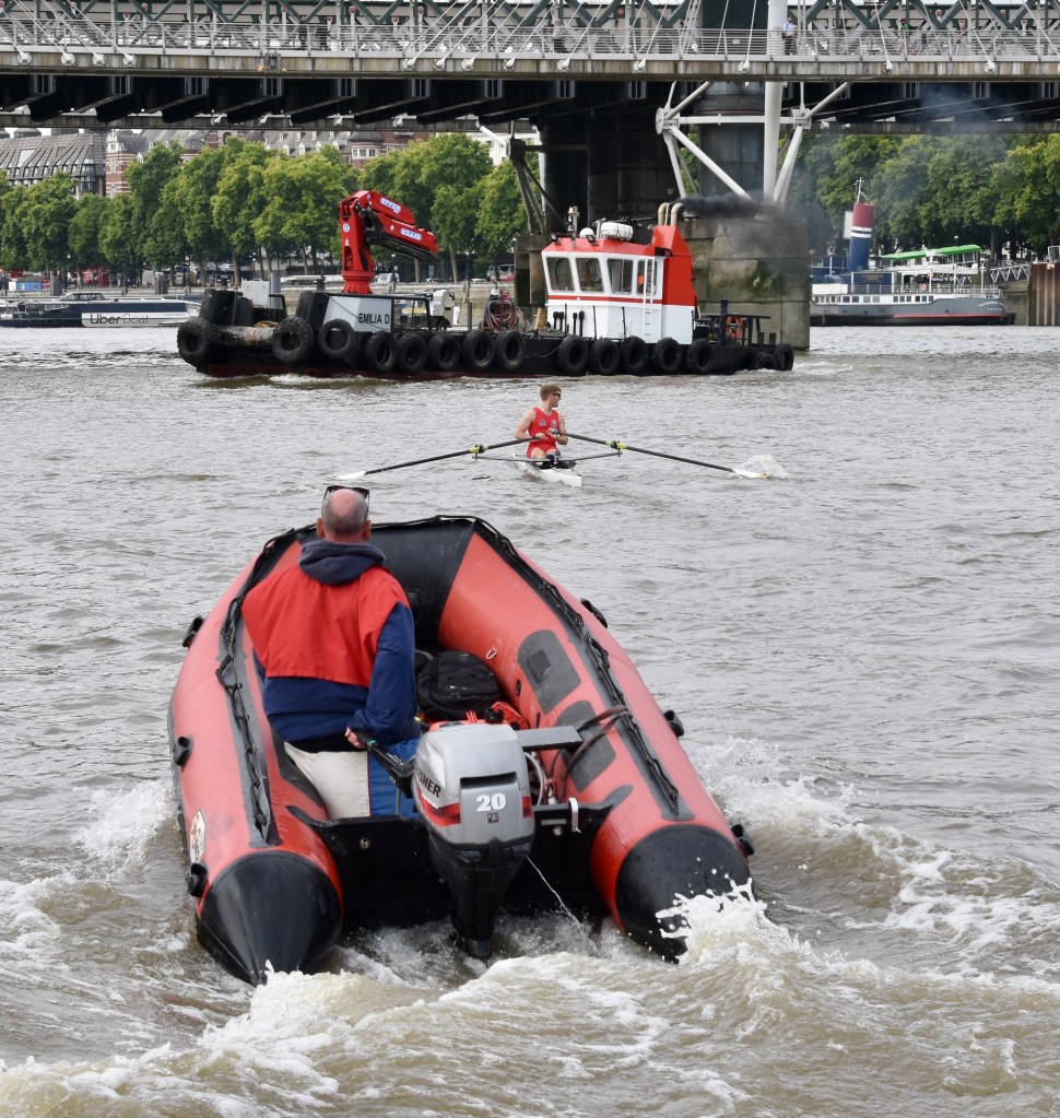 The hastily revised date also meant that the usual rolling river close was not in place – although the Port of London Authority was still managing the river and providing safety cover. Despite this, Gilbert was sculling on a busier river than has been seen in the race for many years.