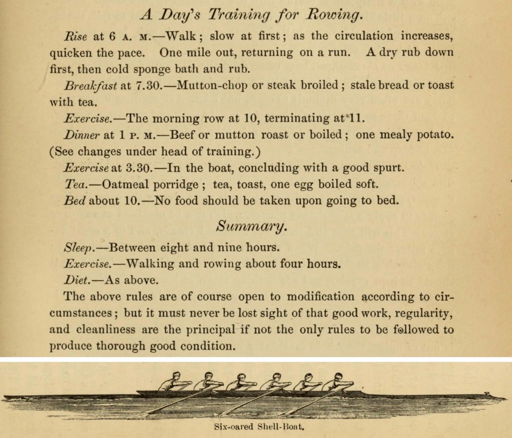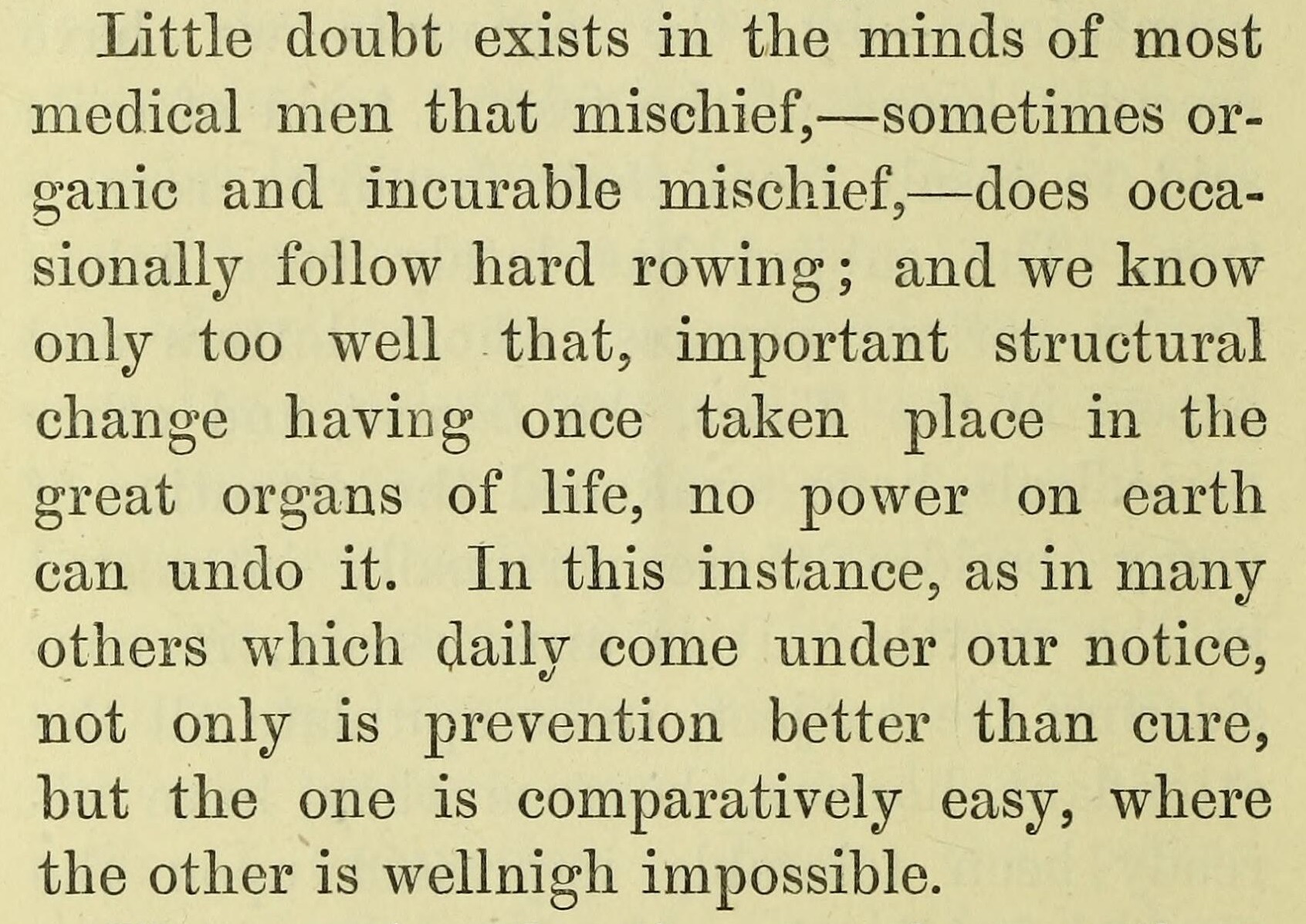 The Wellcome Collection has also digitised another Victorian study into rowing and health, John Morgan’s 1873 work University Oars: Being a critical enquiry into the after health of the men who rowed in the Oxford and Cambridge boat-race from the year 1829 -1869, based on the personal experience of the rowers themselves. It deserves – and will get – a post of its own in the near future.