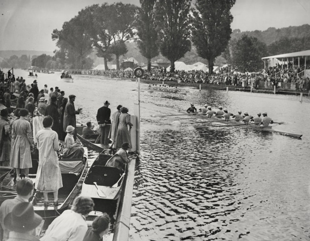 In the first heat, Tokyo met First Trinity Boat Club, Cambridge, established in 1825. First Trinity had produced the crews that won the Olympic coxless fours in 1924 and 1928, the college’s two boat clubs had nineteen Henley wins between them since the war, and their 1936 Marlow crew had been successful in that year’s May bumping races at Cambridge. However, the Japanese visitors started at 46 strokes per minute to Trinity’s 40 and were two lengths up after two minutes. They eventually won by three-quarters of a length, producing a final burst of 48 strokes per minute when the Cambridge crew came within half-a-length. A photograph of the finish is on the Alamy site.