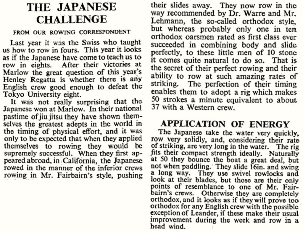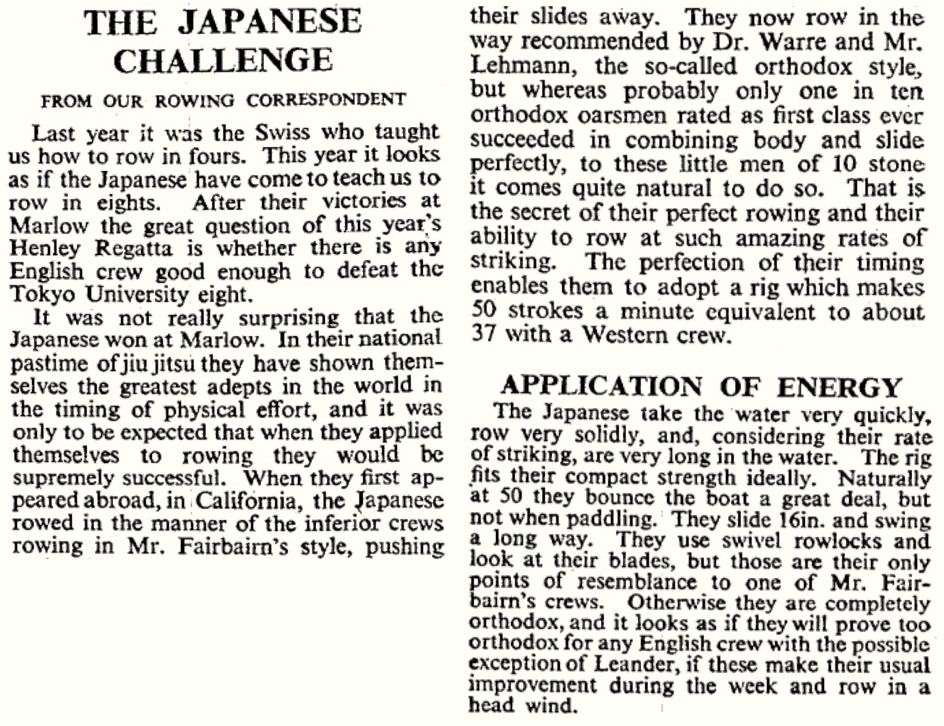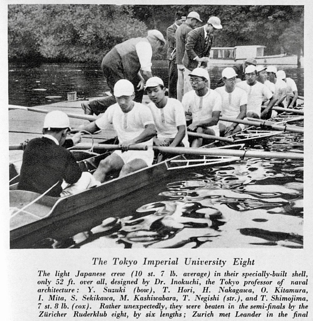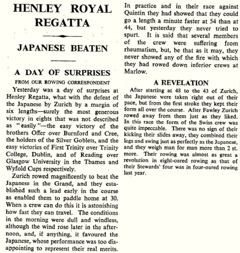 (It) was in one respect a triumph for the British orthodox style of rowing, which the world has imitated. The remarkable Japanese crew in their 52ft boat, with a striking rate that has been at once the horror of Old Blues, found their strange methods of no avail against the smooth powerful orthodoxy of Zurich RC…