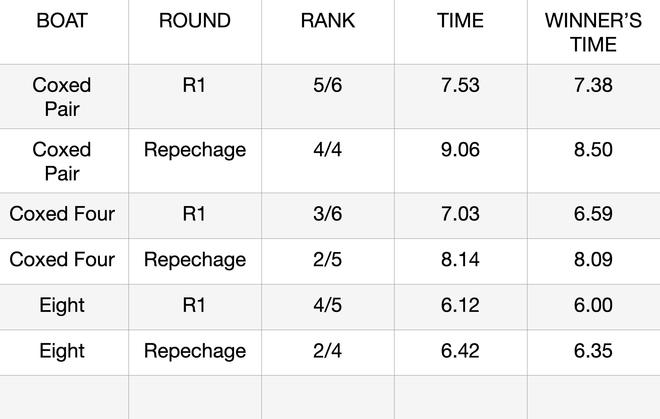 The winners of each of the three first rounds of the eights (USA, Hungary and Switzerland) went straight to the final, the rest to the repechage. In their round one race, Japan recorded a time of 6.12 and came fourth out of five, behind France (6.11), Britain (6.02) and the U.S. (6.00). However, they were ahead of fifth placed Czechoslovakia who recorded 6.28. The Tokyo University crew’s first round time was also better than those of Canada, Australia, Brazil, Yugoslavia and Denmark. Of course, conditions can vary between races producing very different boat speeds.