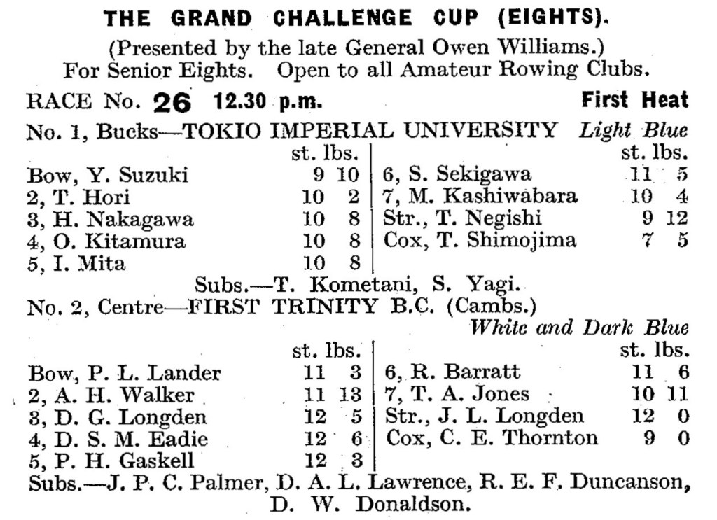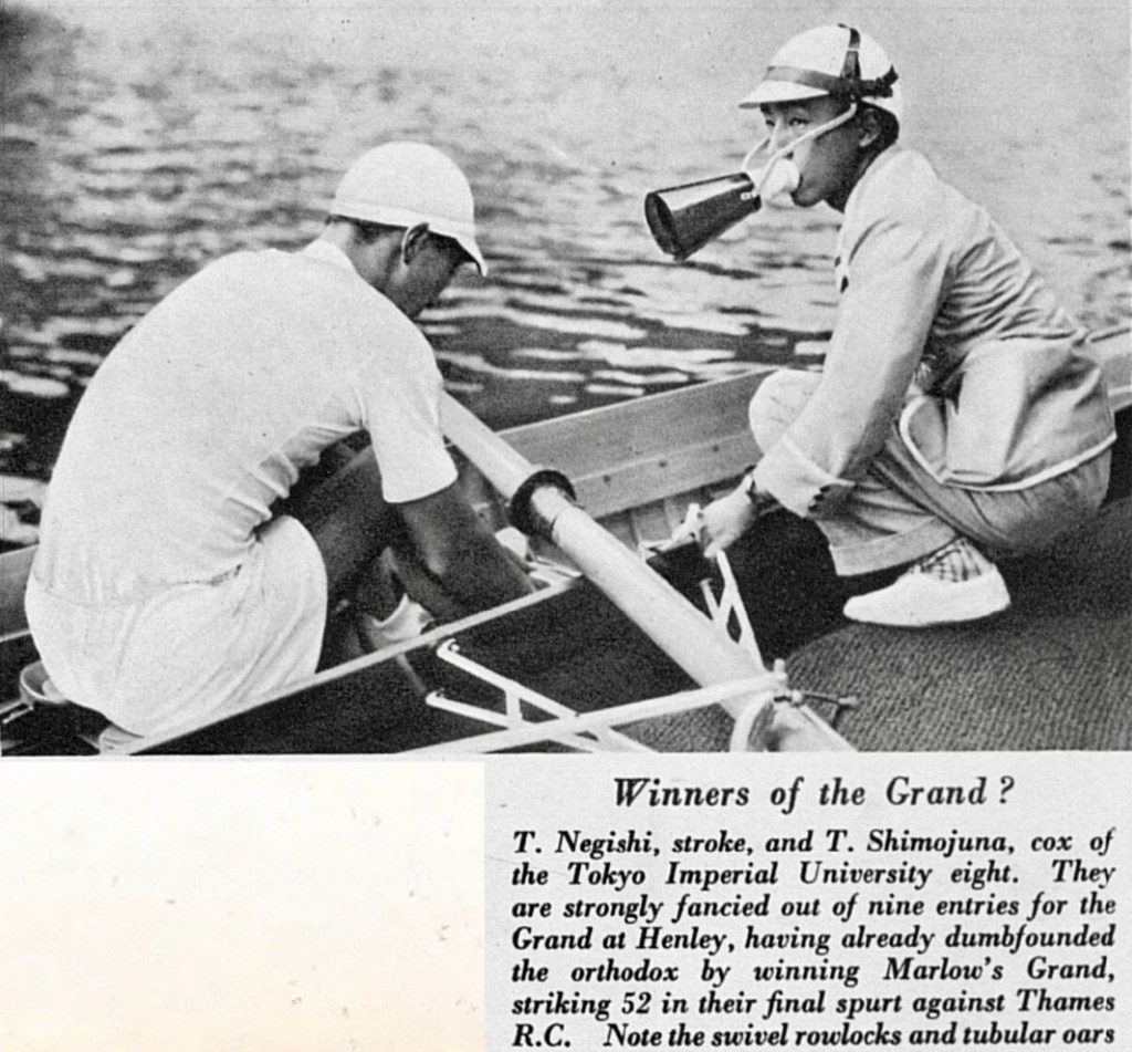 The crew represent Tokyo University, described as “Japan’s Cambridge”, and they hold the university championship in Japan. The visit (to the UK) has been arranged by Mr Otsuki, who gained a trial cap while at Oxford, and who has himself rowed for Tokyo… (The) coach is Dr Seta.