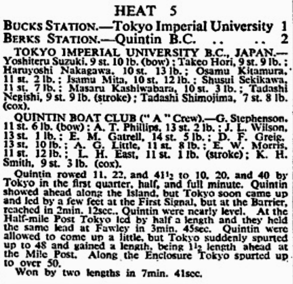 In the first round, the Japanese drew one of the least favoured entries, the Thames Tideway club from Chiswick, Quintin Boat Club. The foreign visitors had an easy victory. After the race, The Times reported: