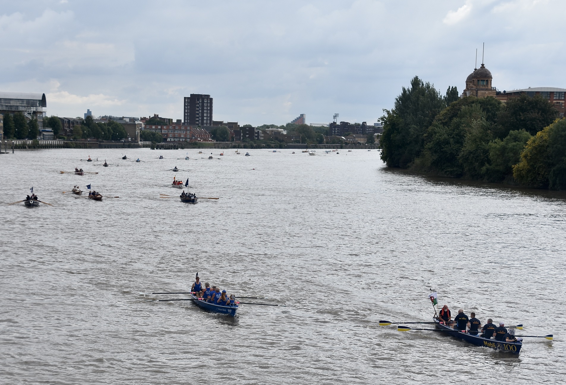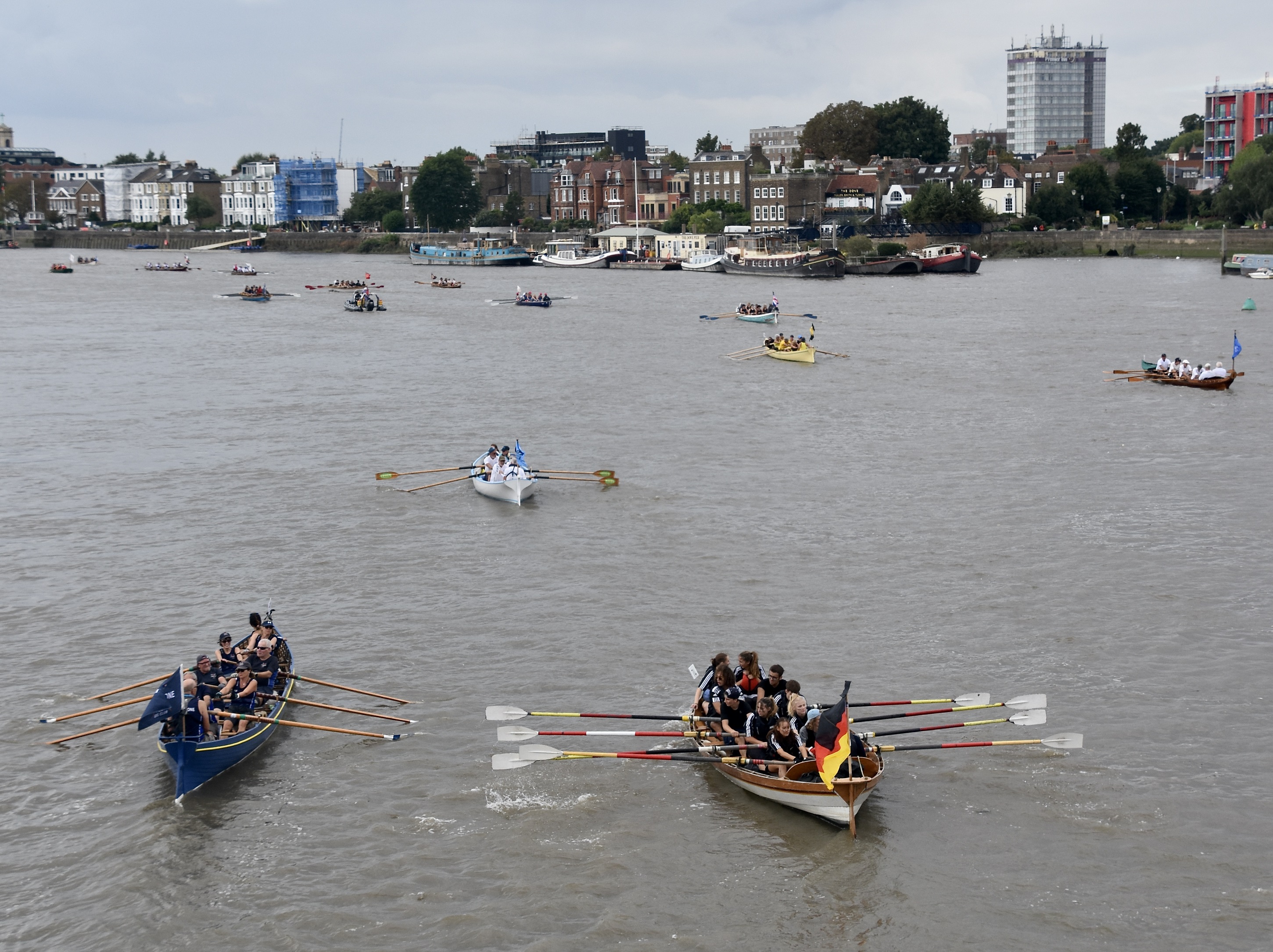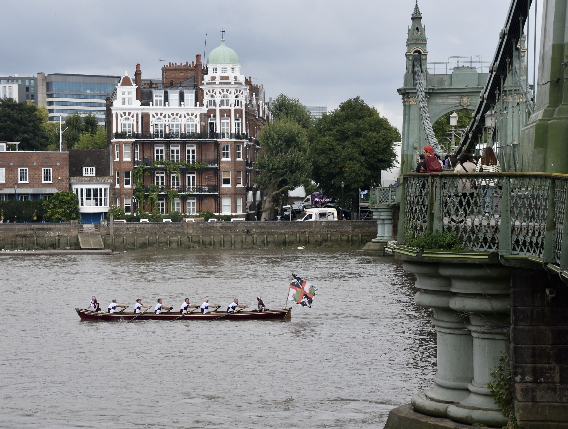 The GRR was started in 1988 and covers a 21-mile / 34 km course on the tidal Thames between Greenwich and Richmond. The rules say that boats must be moved by oars or paddles, not have sliding seats, and carry a cox and a passenger (although both cox and passenger may alternate with rowers or paddlers during the race). Up to 300 boats take part including gigs, skiffs, cutters, curraghs and whaleboats. Only a minority of participants have ever treated the GRR as a race so turning it into a “procession” produced few visible differences to the usual event, particularly as the vague request for “appropriate clothing” did not seem to be followed. The pictures below were taken at Hammersmith.