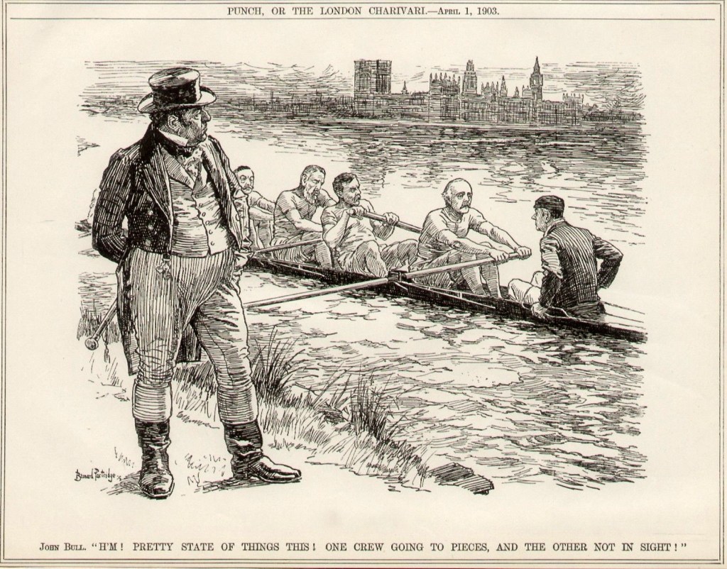 John Bull, the personification of Great Britain, observes that the government is hopelessly split, and that the main opposition party is bereft of ideas (1903).A former leader returns?! WE Gladstone comes back to form his second administration (1880).