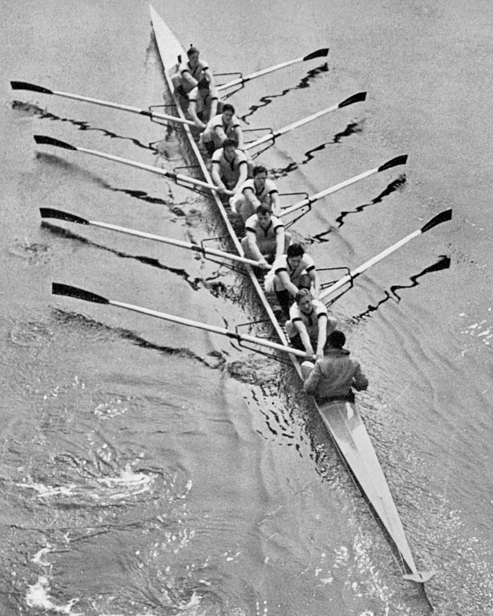 Secondly, he noted that the great Washington crew, which was victorious in the final of the Eights, had been rowing together unchanged in the same order for over a year. Jock thereupon determined to pick the best eight men and weld them unchanged into a strong winning crew, and this indeed is what he did.