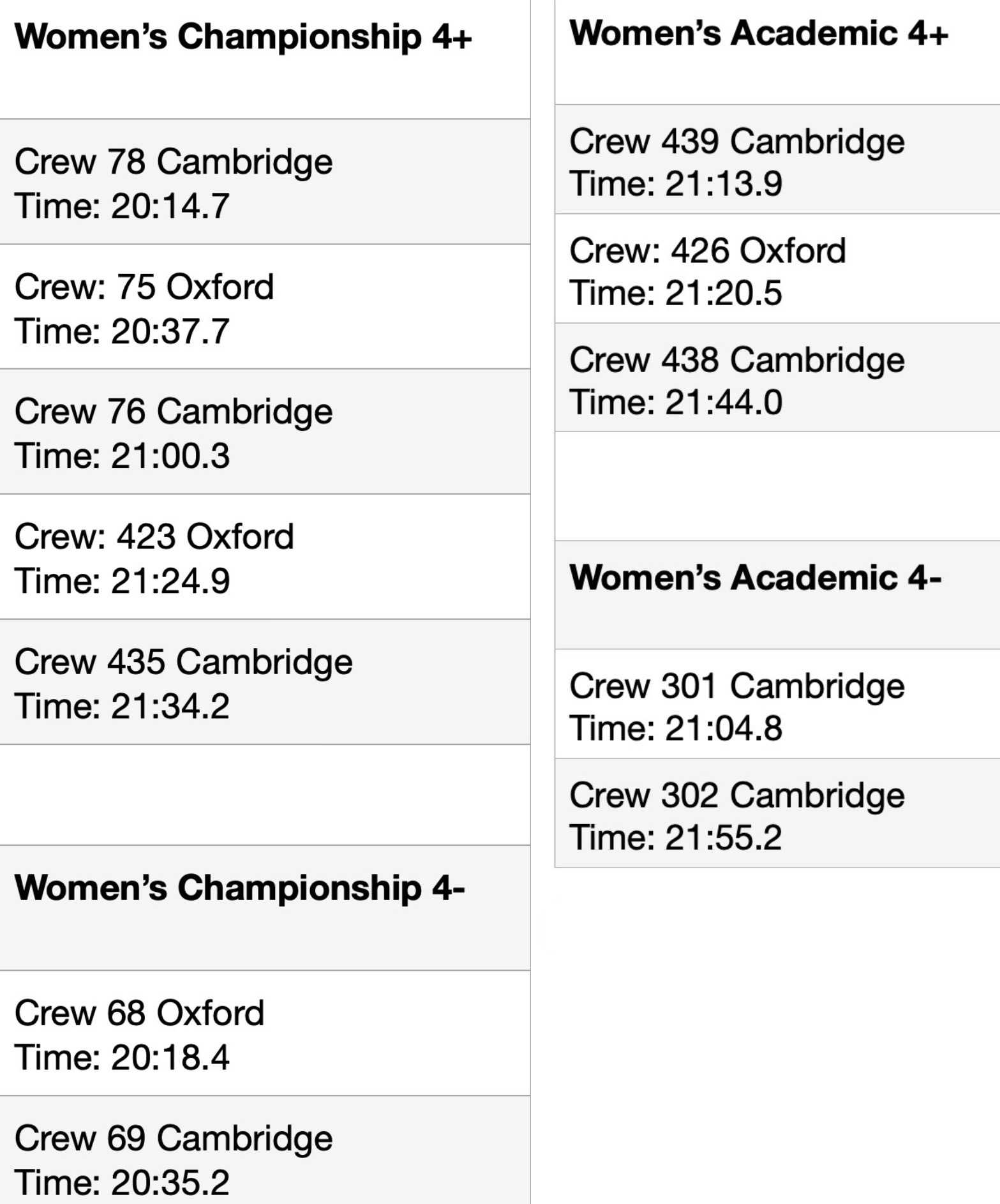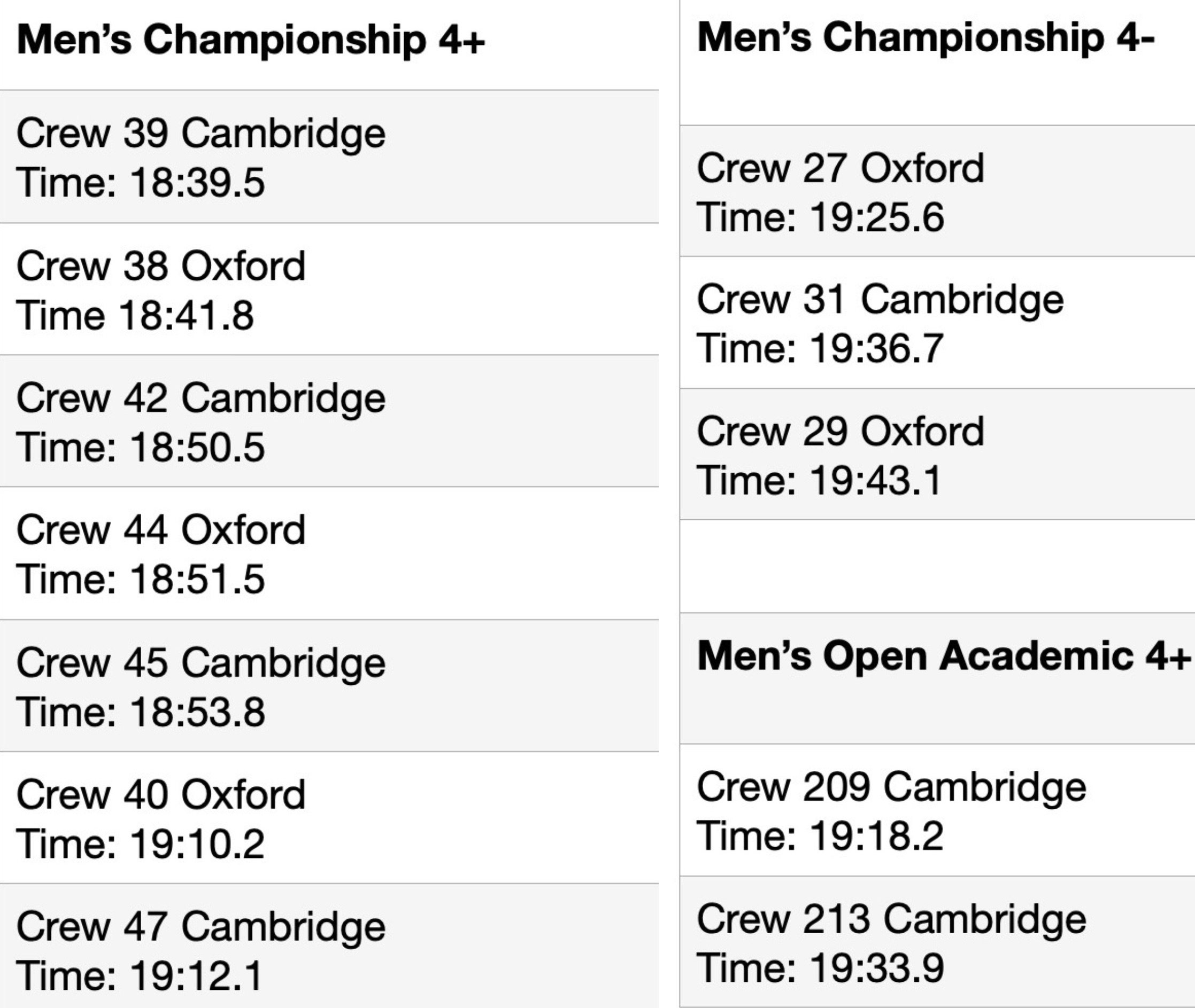The Oxbridge crews’ Fours Head results are summarised below. As a predictor of possible Boat Race performance, the championship coxed fours are usually of the most interest.